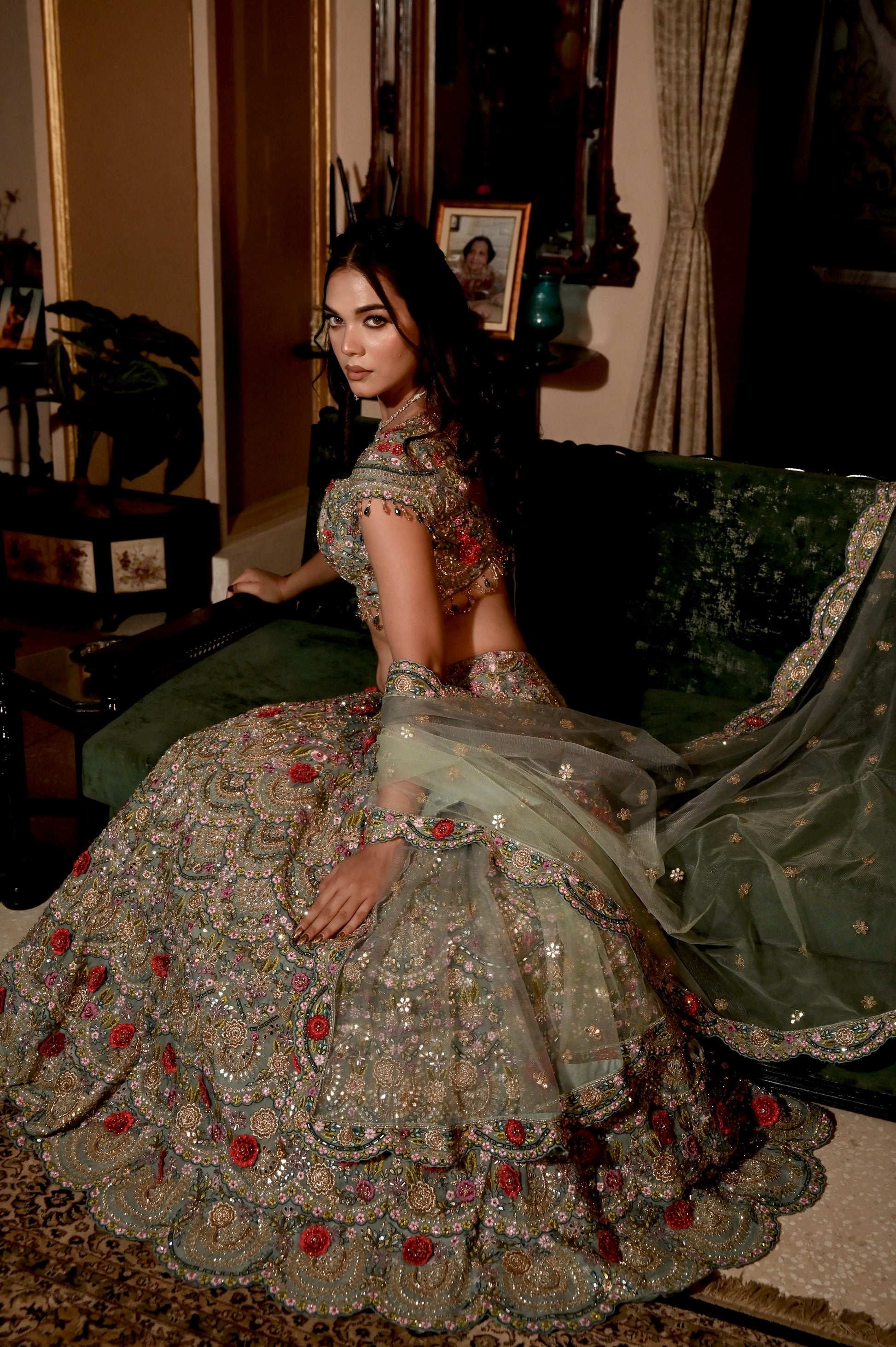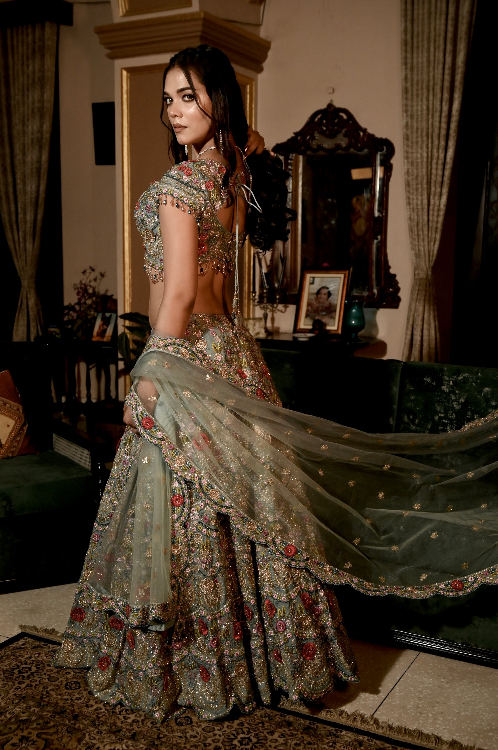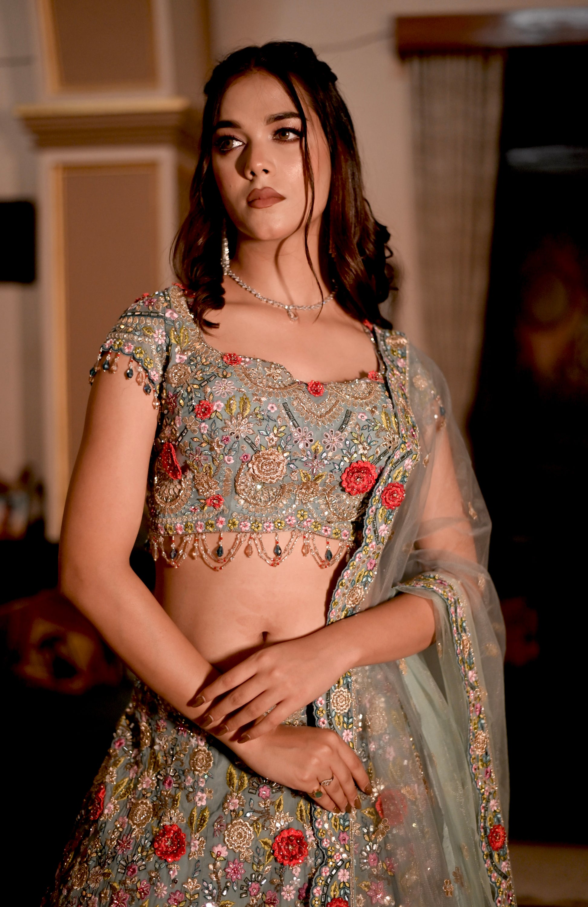 SEA GREEN COLOUR NET HAND EMBROIDERED NET LEHENGA EMBELLISHED WITH SEQUINS, ZARI & MIRROR WORK