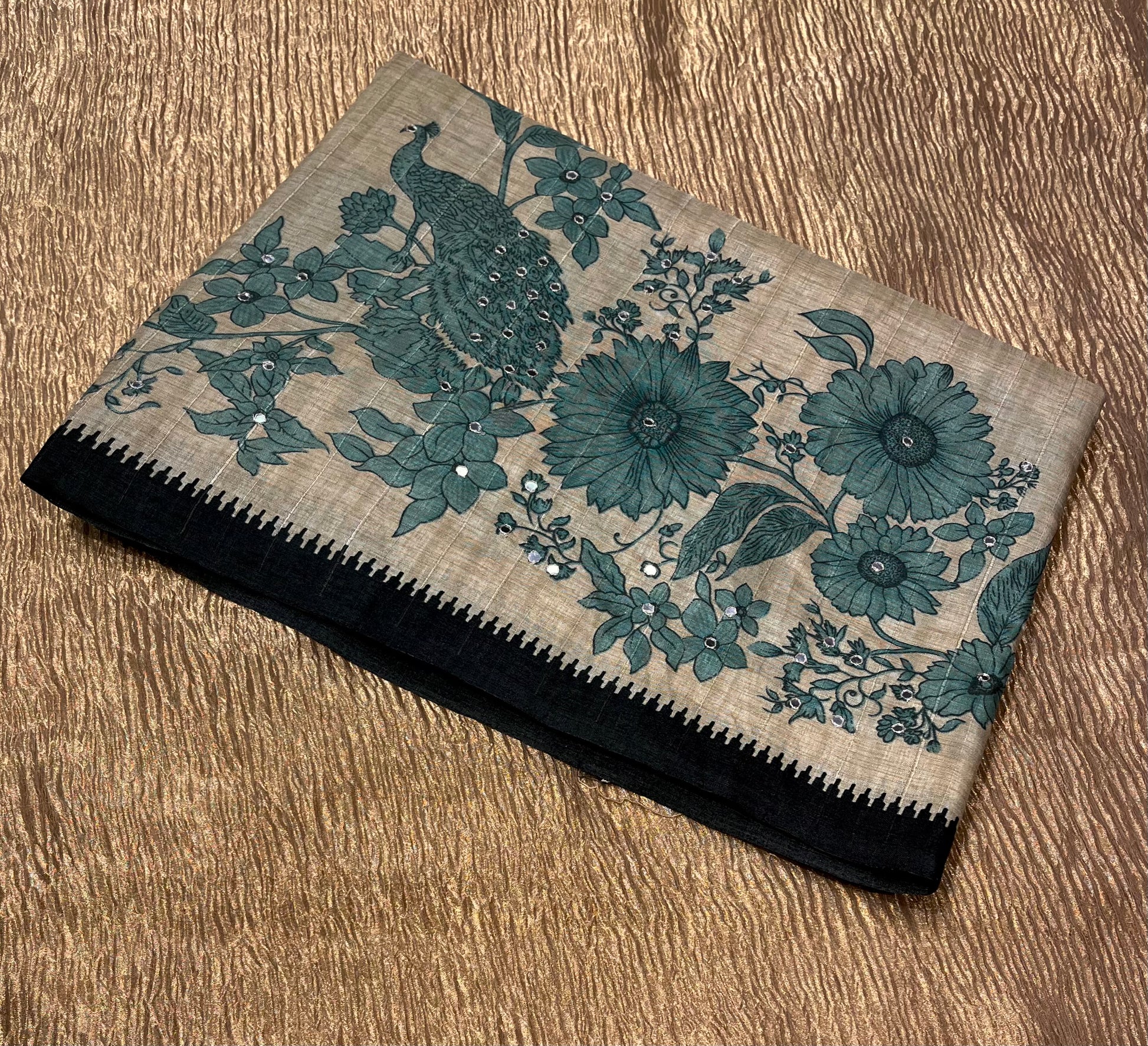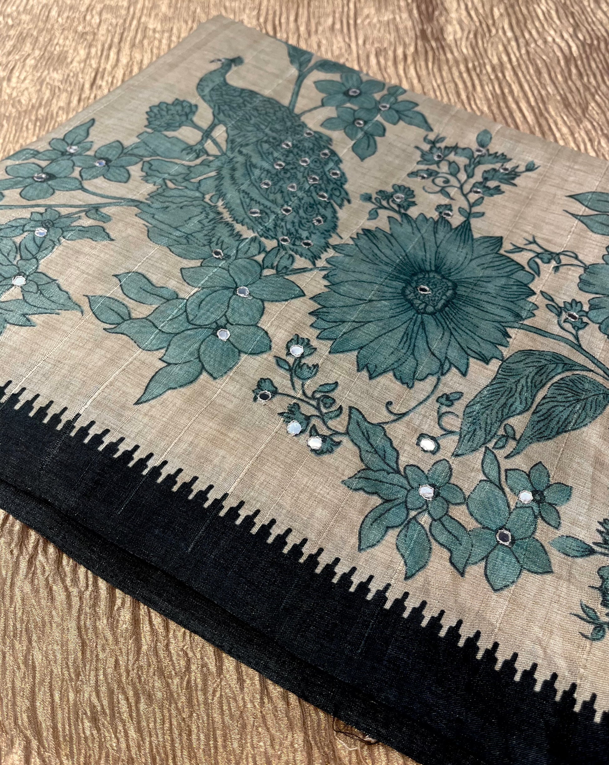 BEIGE COLOUR ART TUSSAR SILK SAREE EMBELLISHED WITH MIRROR FOIL WORK