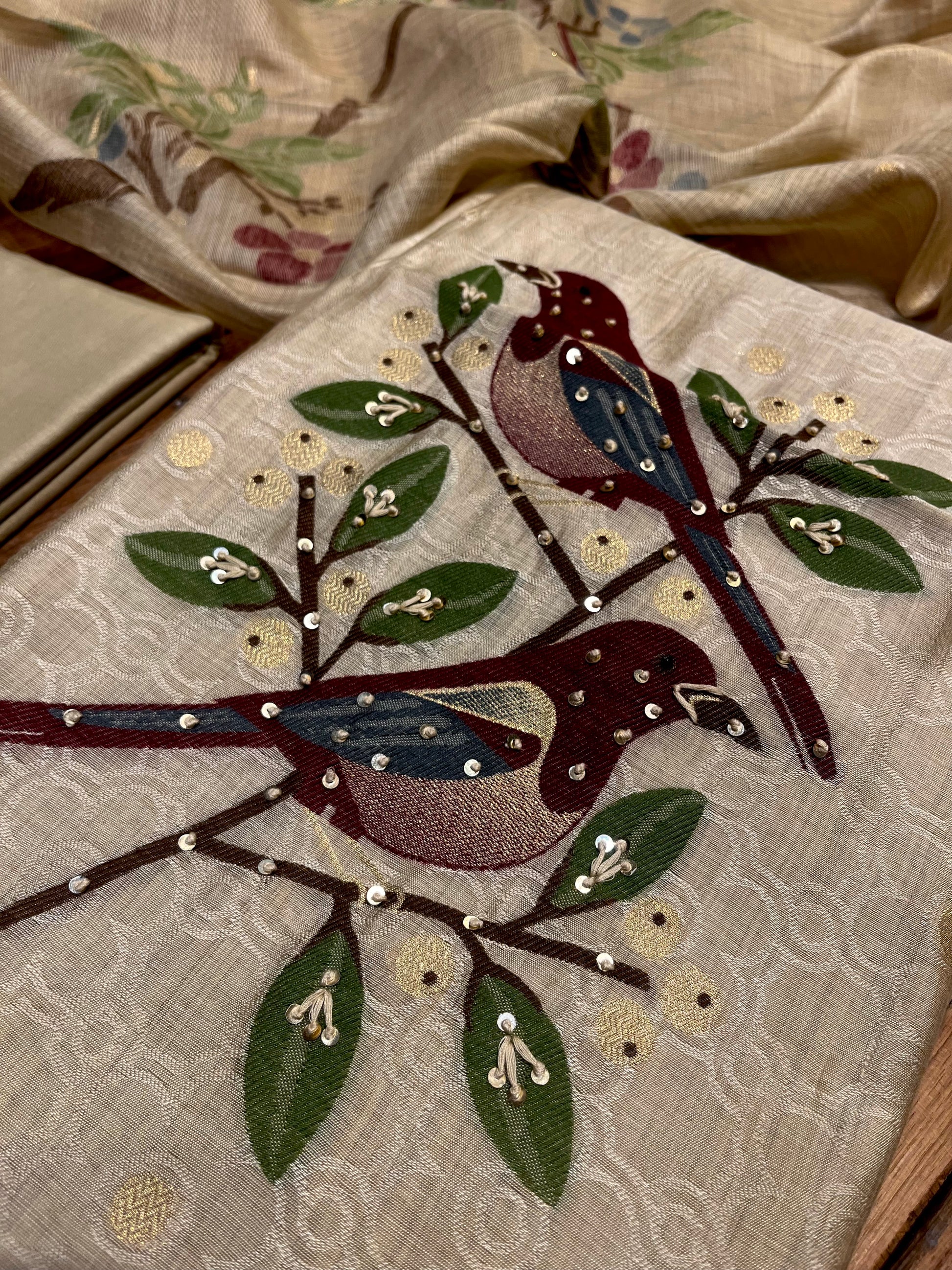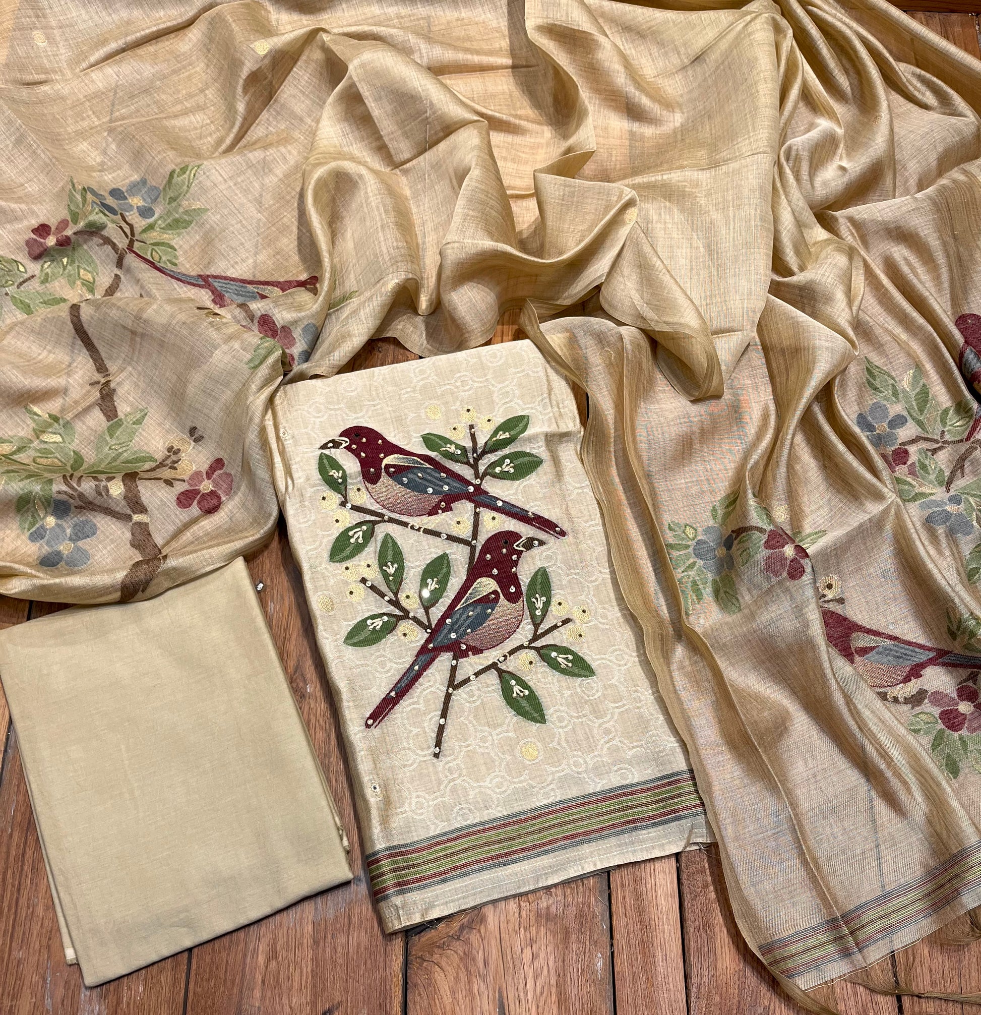 BEIGE COLOUR JAMDANI DHAKAI COTTON UNSTITCHED SUIT EMBELLISHED WITH RESHAM & SEQUINS WORK