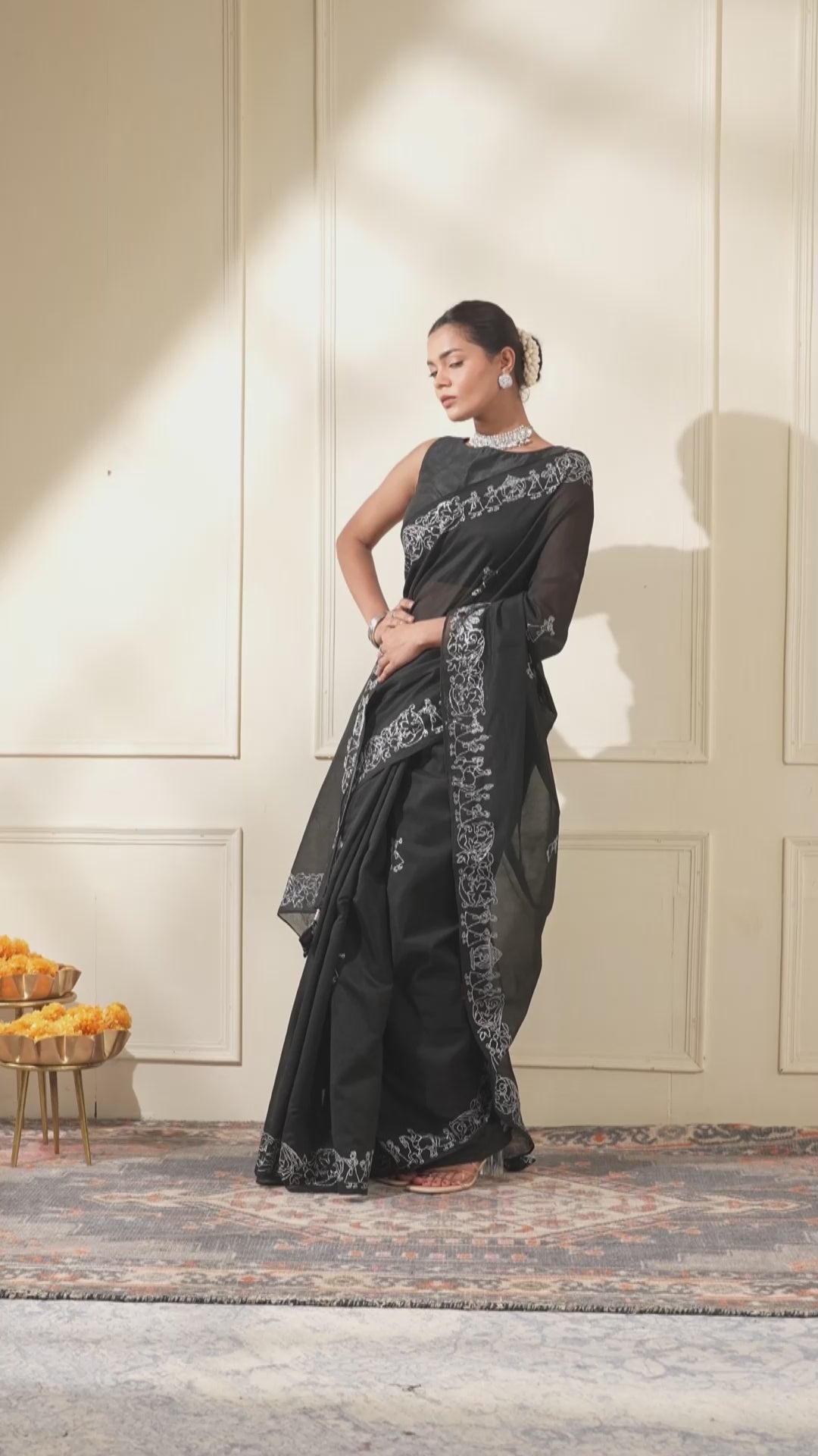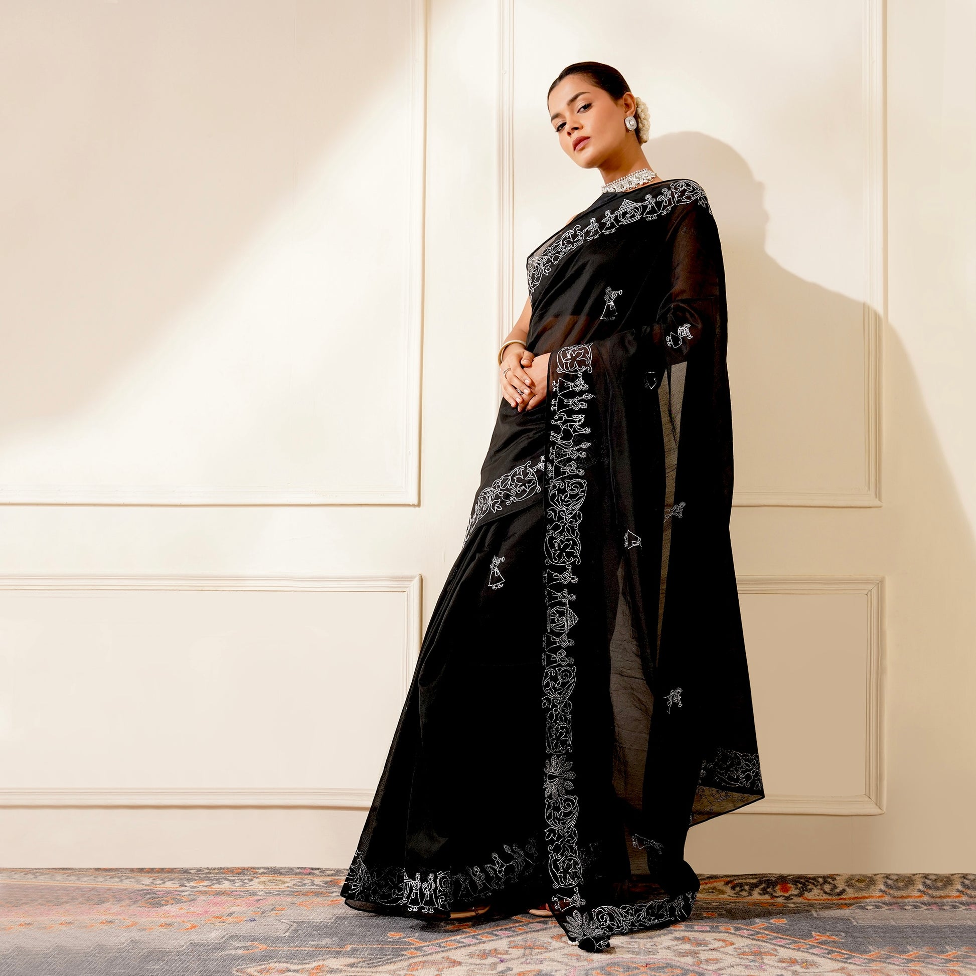 BLACK COLOUR CHANDERI SAREE WITH BARAAT BORDER EMBROIDERED IN SILVER ZARI