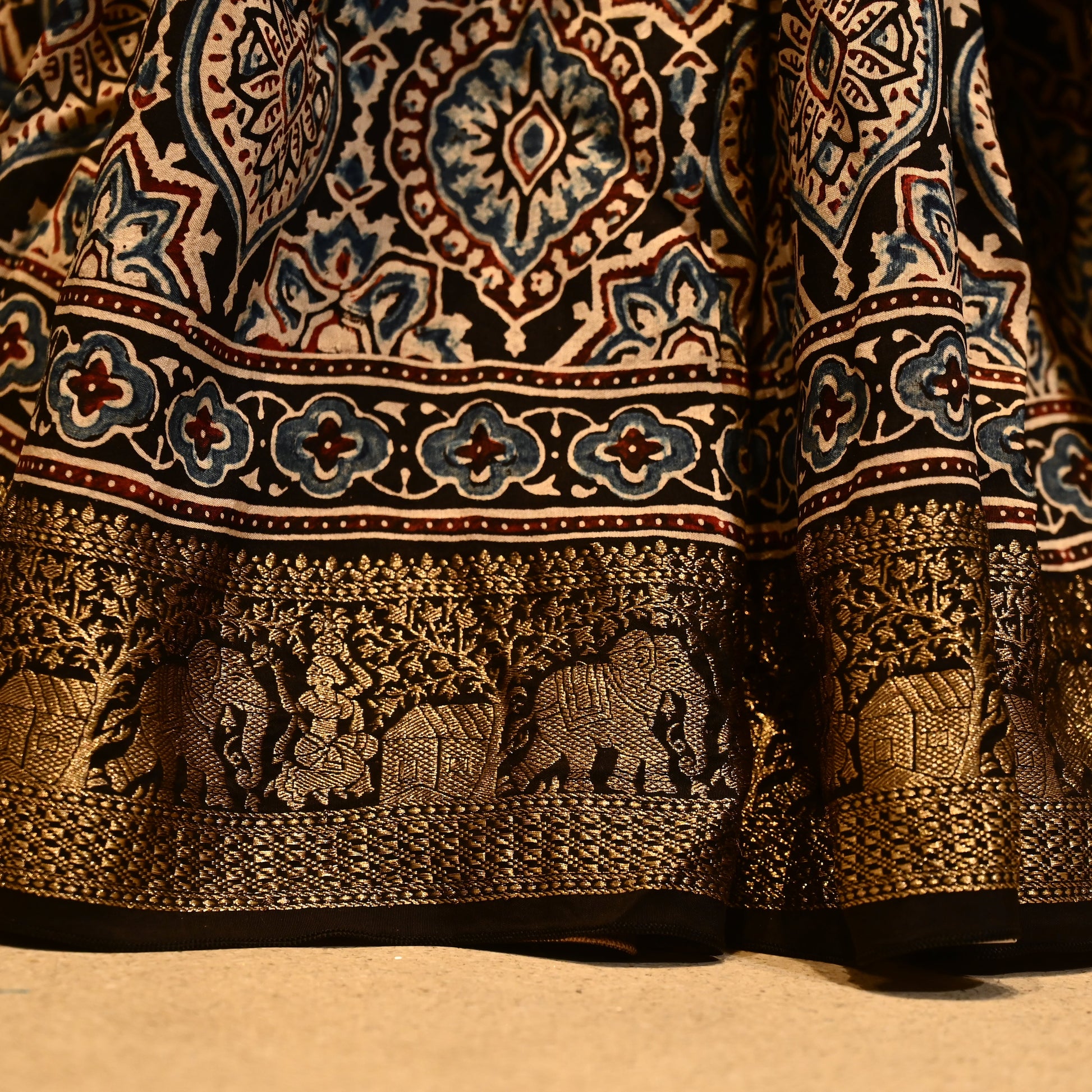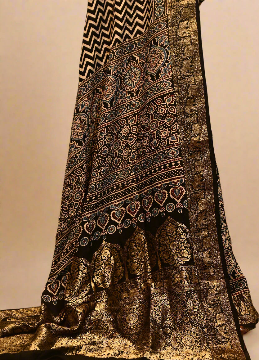 Rooted in tradition yet timeless in appeal, this black Ajrakh print saree is a beautiful convergence of artisanal craftsmanship and sustainable elegance. Crafted in soft, plant-based silk, the fabric drapes effortlessly while offering a gentle sheen and breathable comfort. The classic black base is adorned with intricate Ajrakh block prints, evoking heritage charm. A rich Banarasi palla and border lend a regal finish, perfect for festive evenings, cultural occasions, or artistic celebrations. The matching Ajrakh print blouse completes the look with seamless coordination.