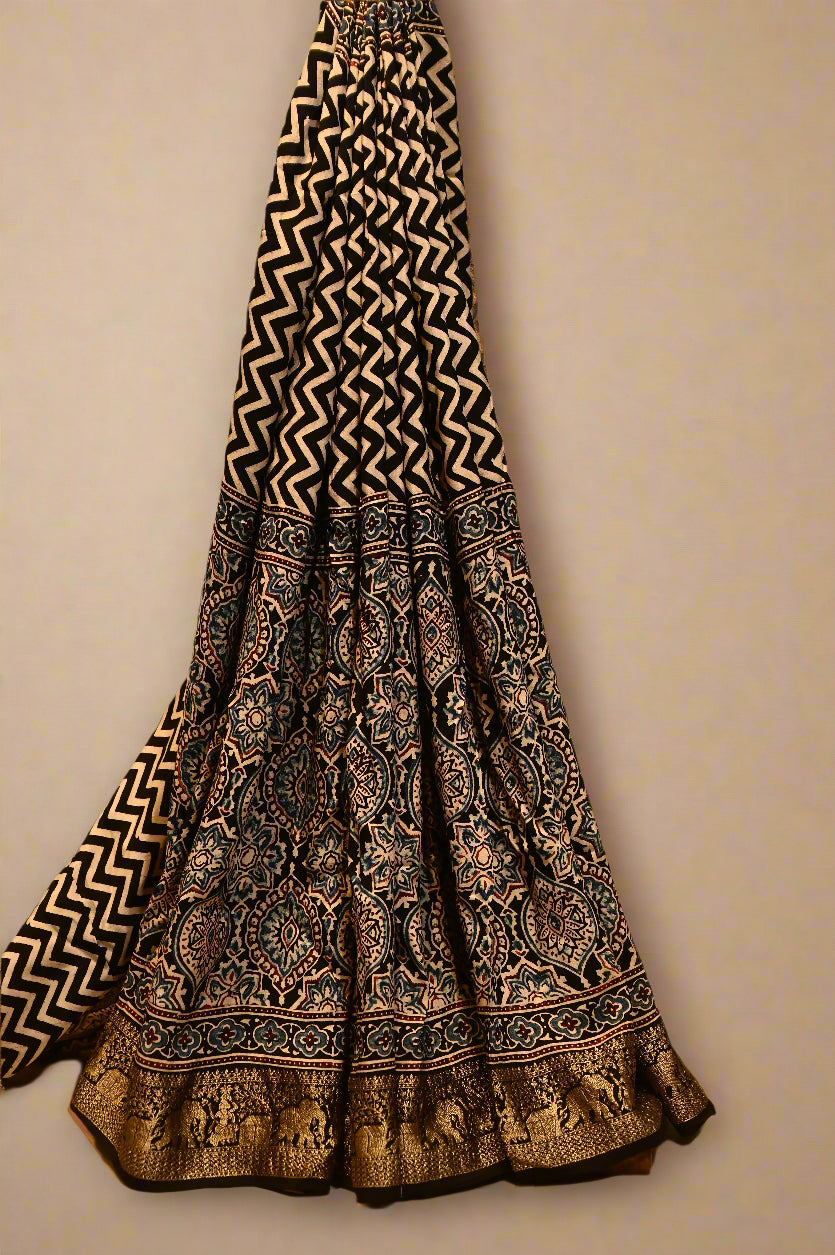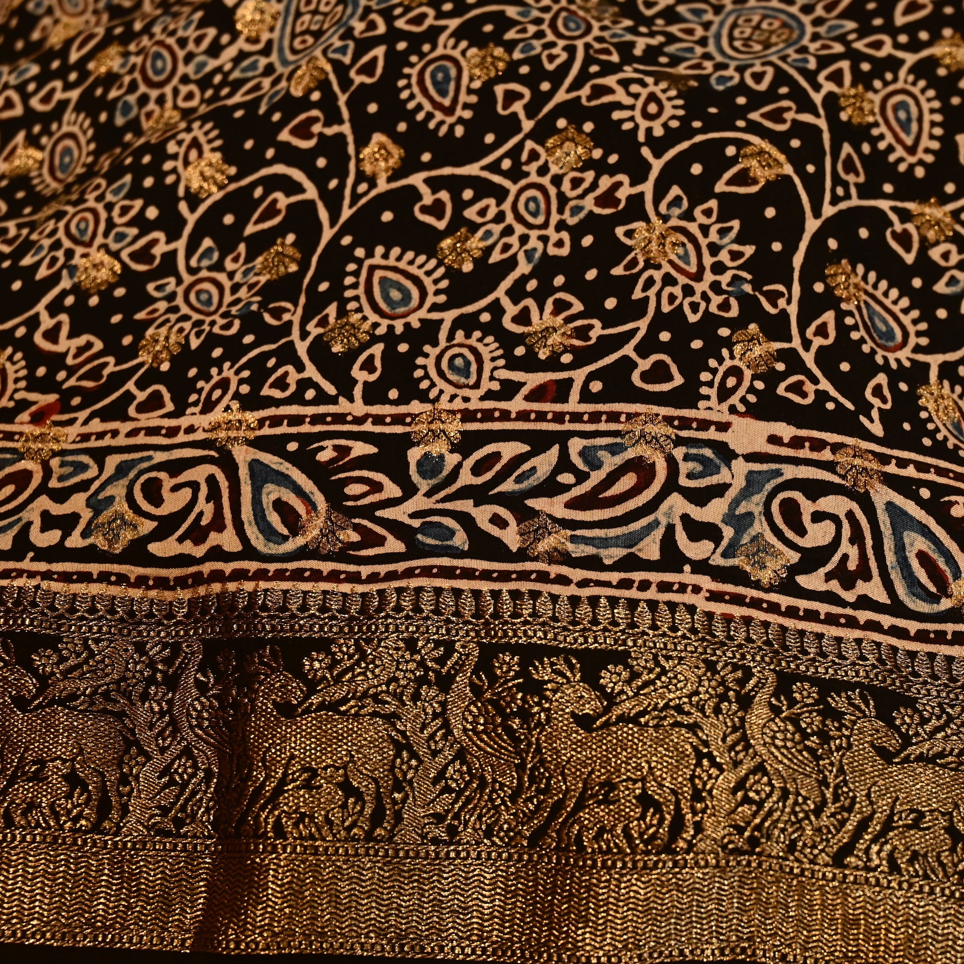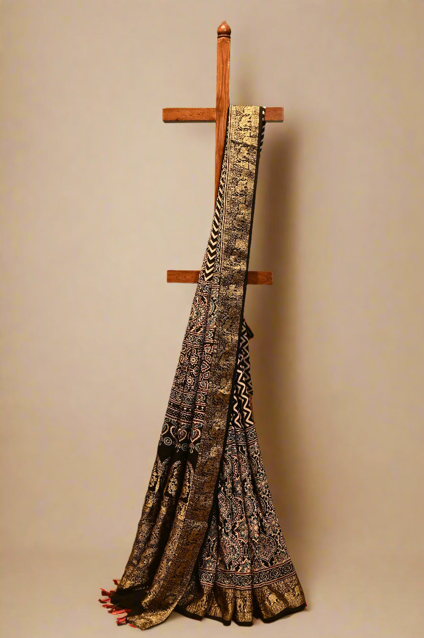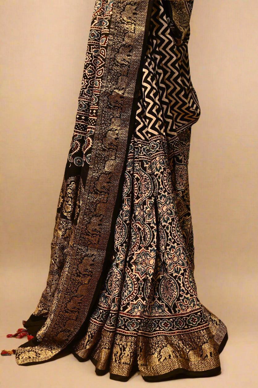 (Deliver 20 Days) BLACK AJRAKH PRINT SAREE IN PLANT BASED SILK FABRIC