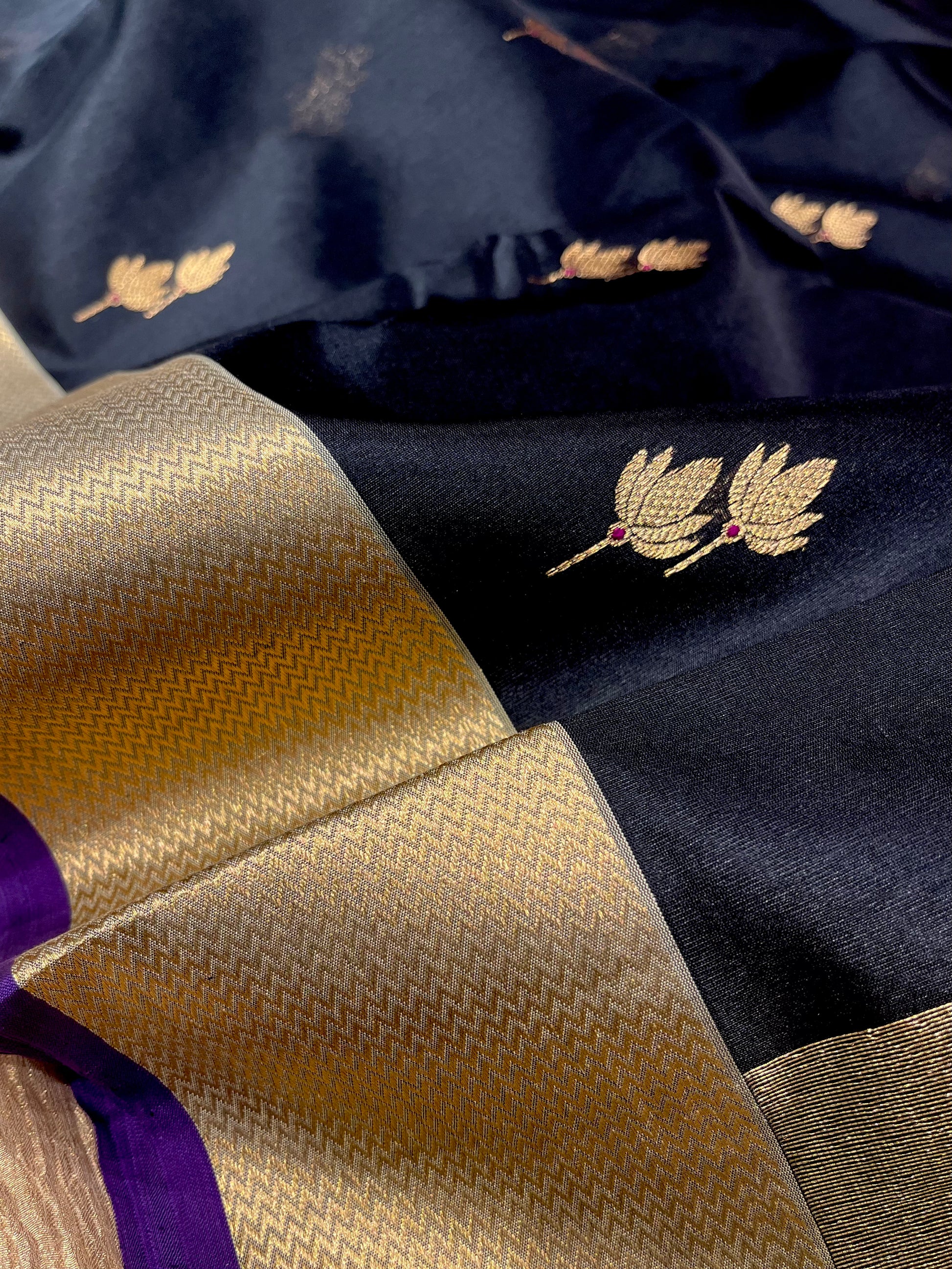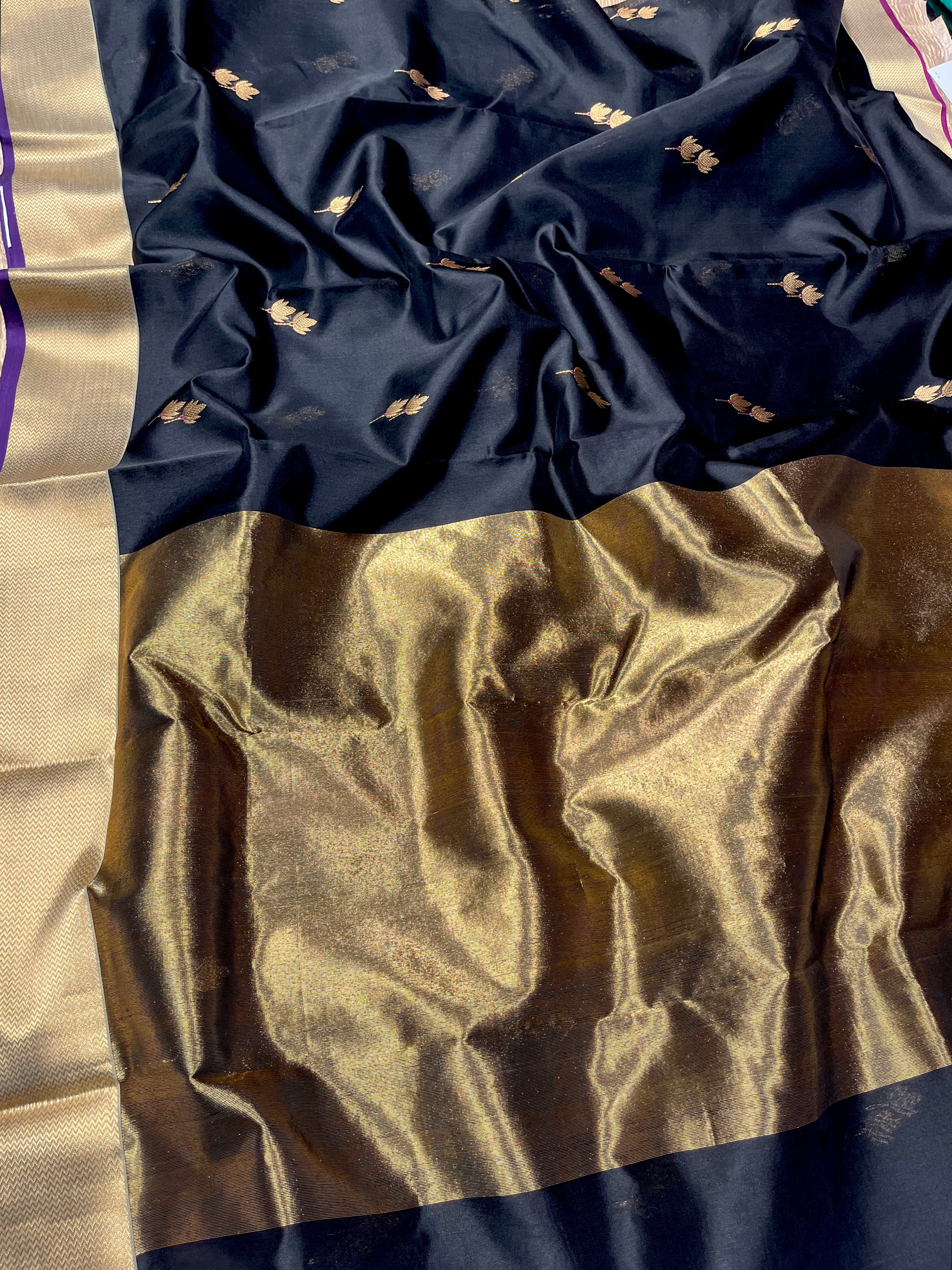 - Black chanderi pattu silk saree highlighted with golden zari.