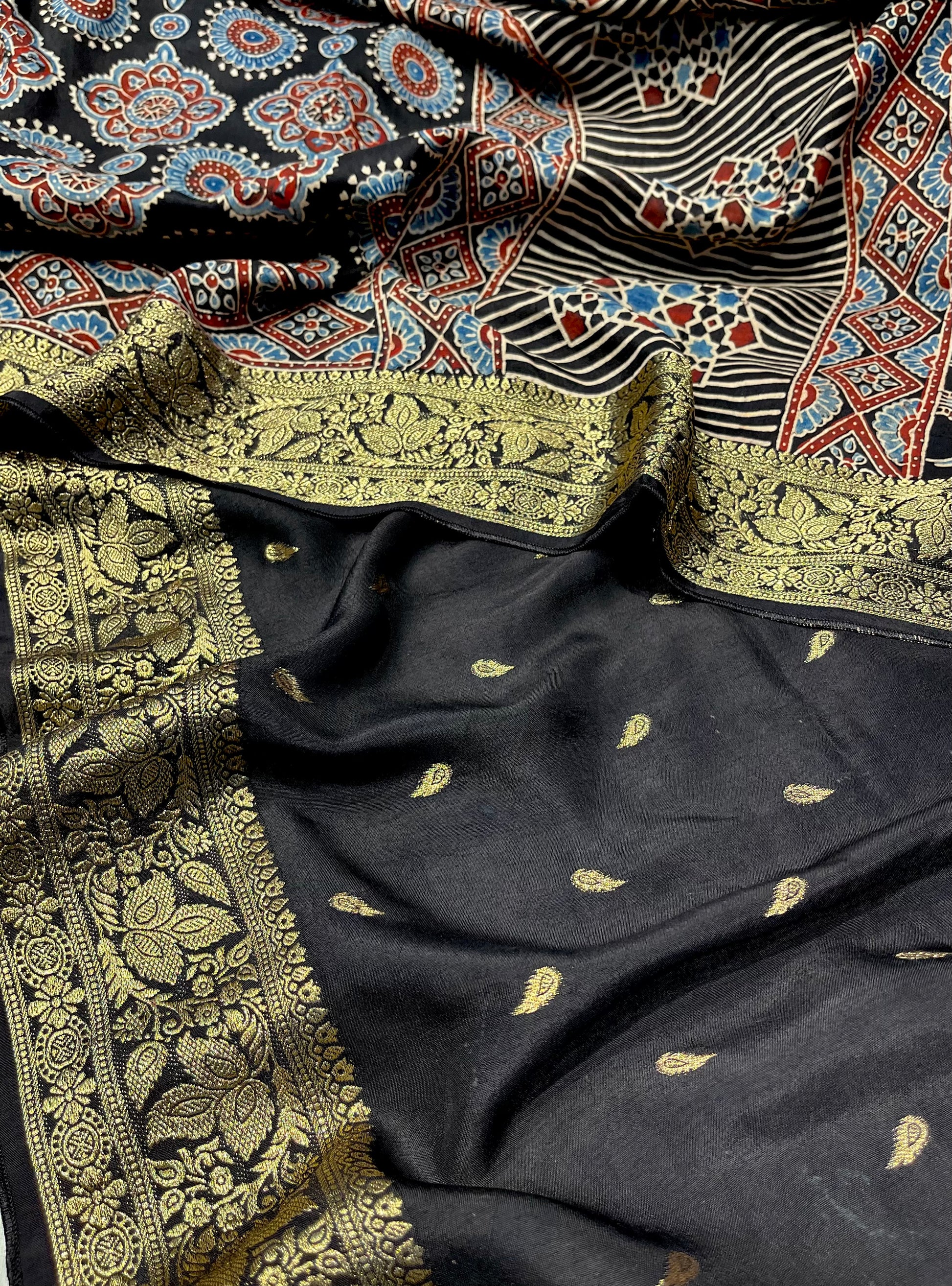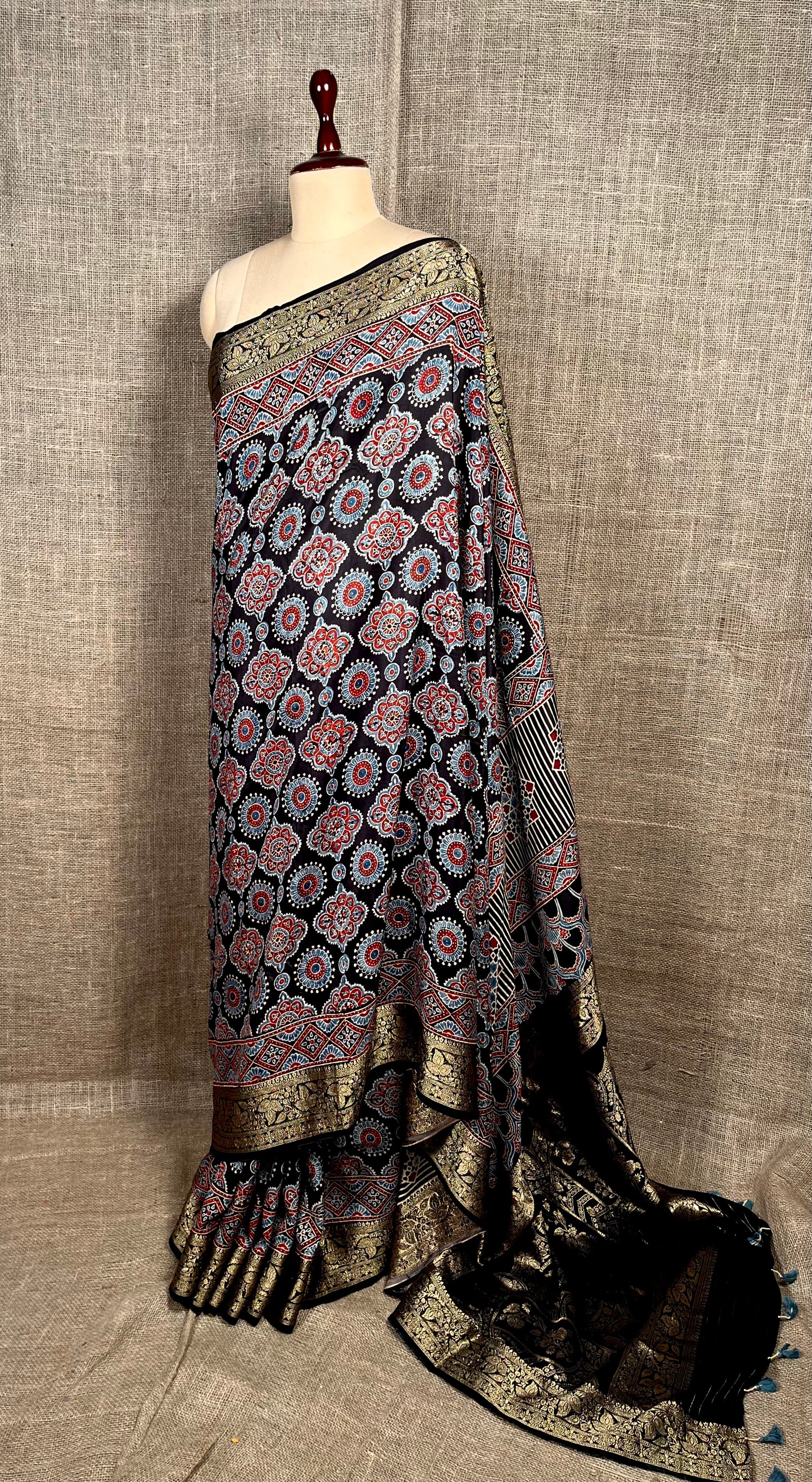 BLACK COLOUR MODAL SILK AJRAKH PRINT SAREE WITH ZARI BORDER & PALLU