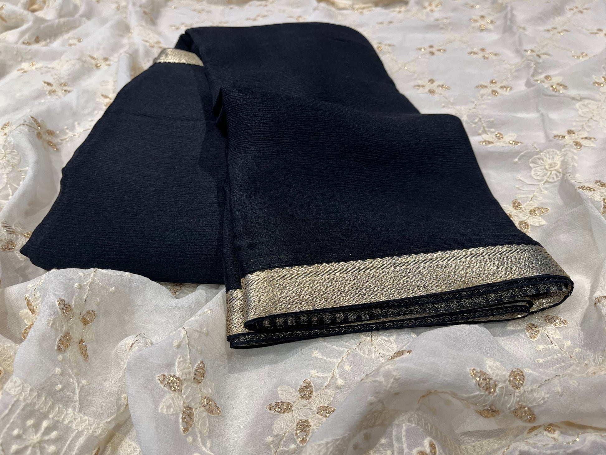 ( DELIVERY IN 25 DAYS ) BLACK COLOUR PURE CHIFFON SAREE WITH ZARI BORDER