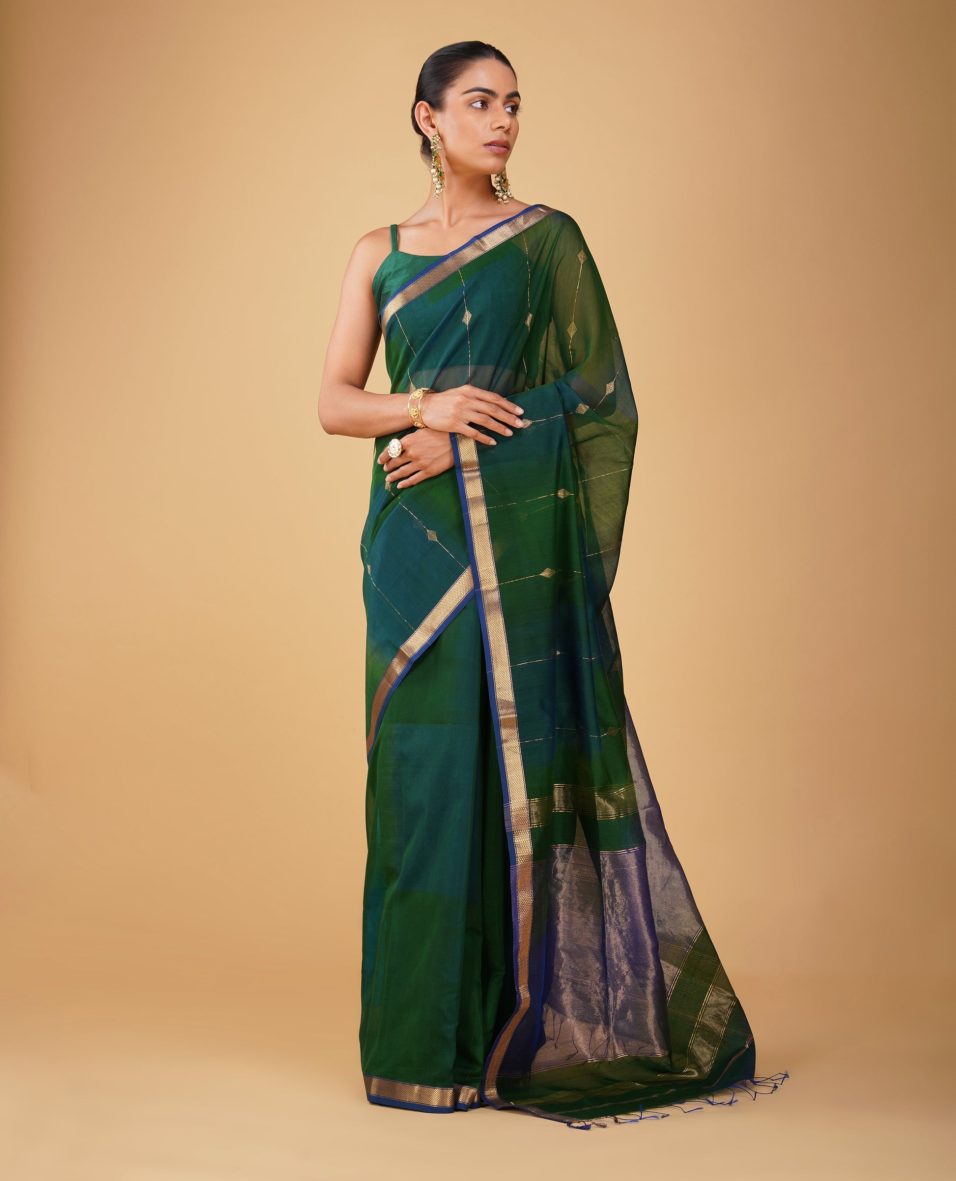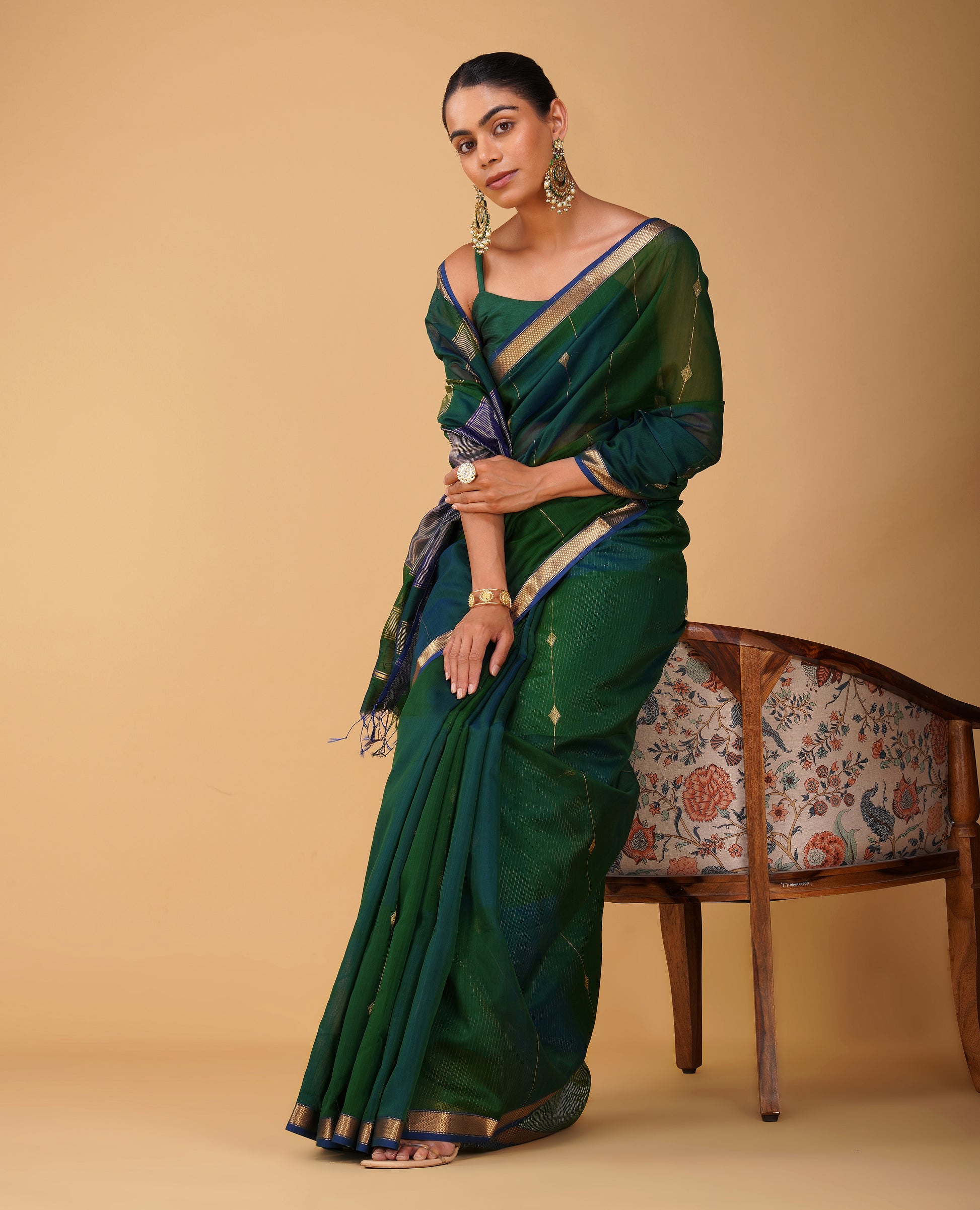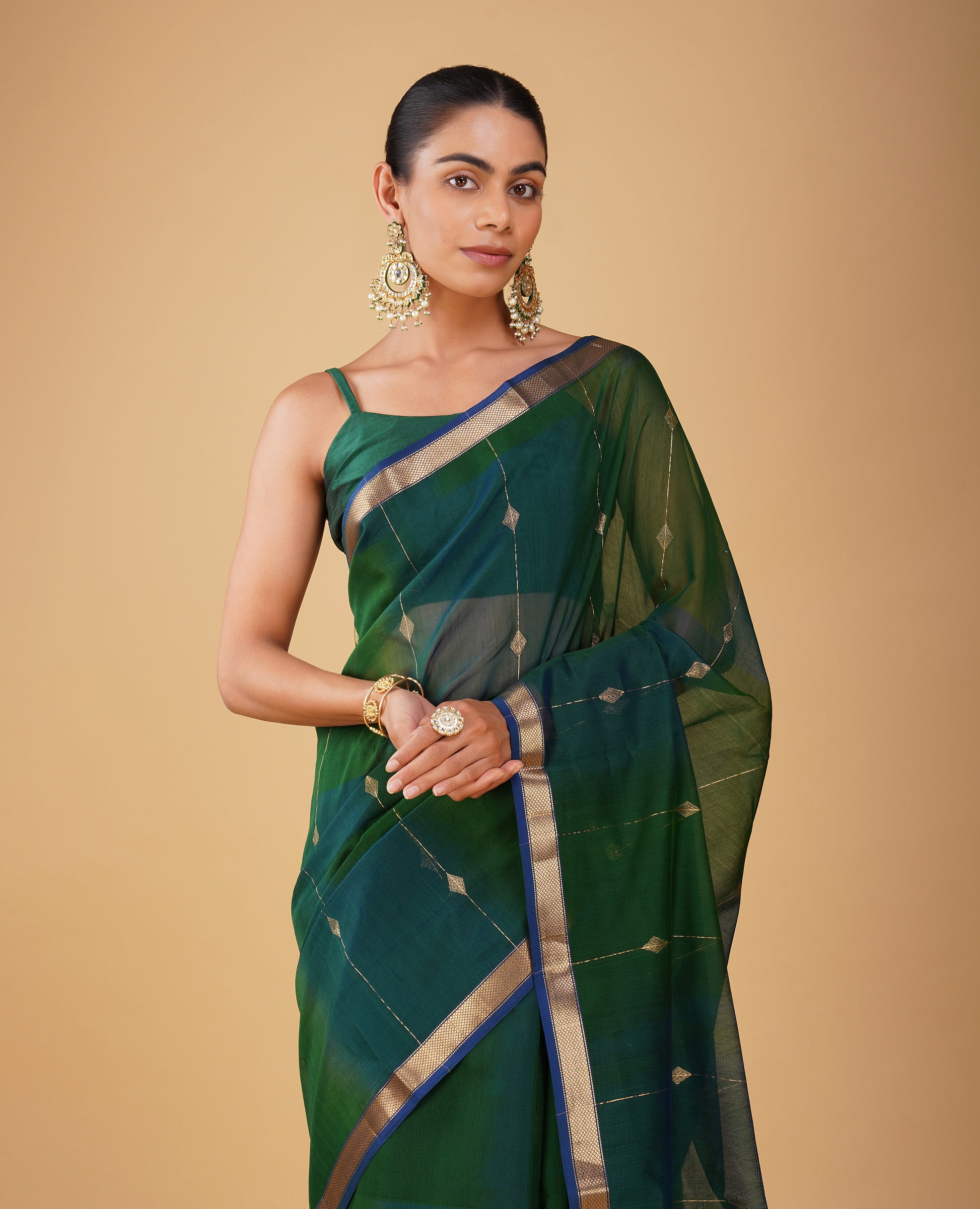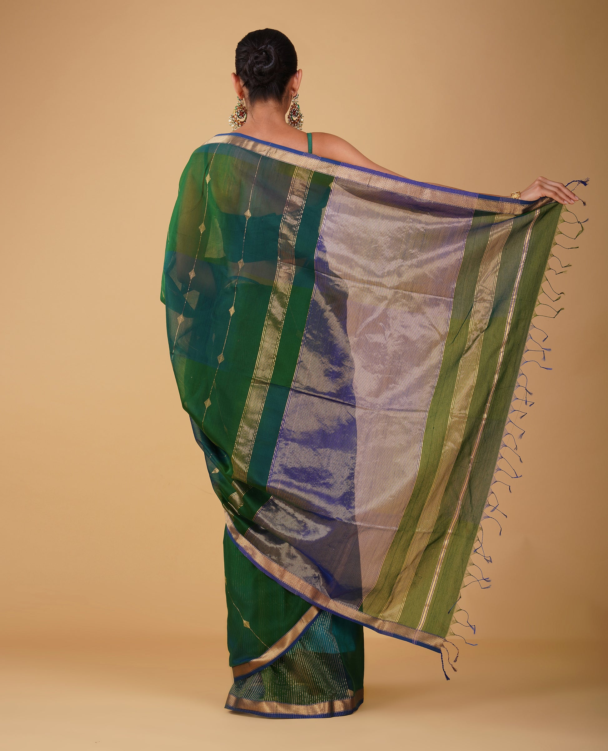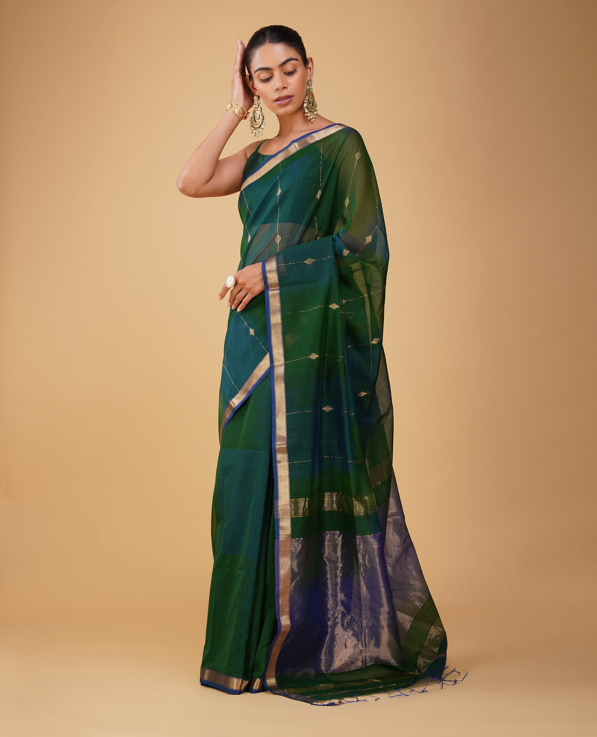 BOTTLE GREEN-BLUE SHADED MAHESHWARI SAREE WITH DIAMOND DRILL BORDER & ZARI STRIPES BLOUSE