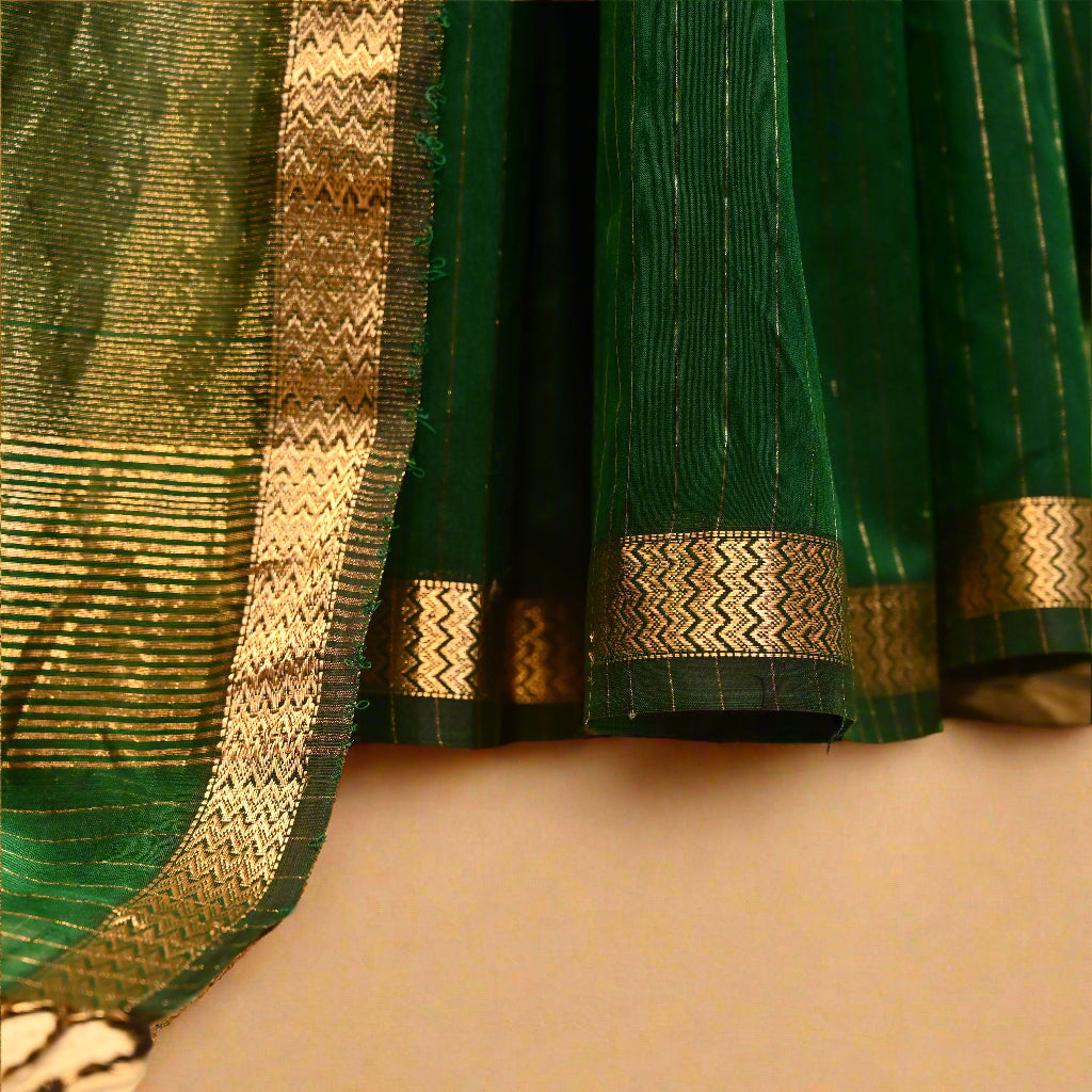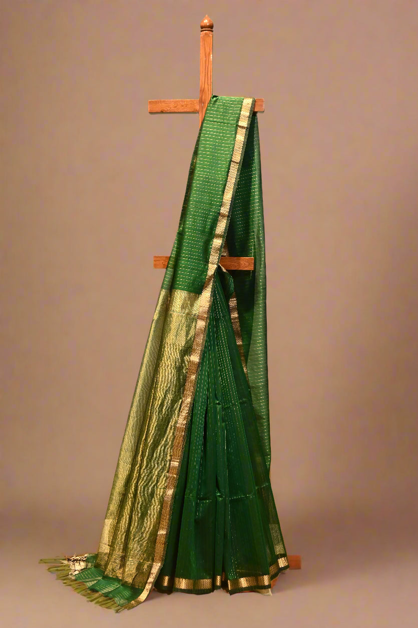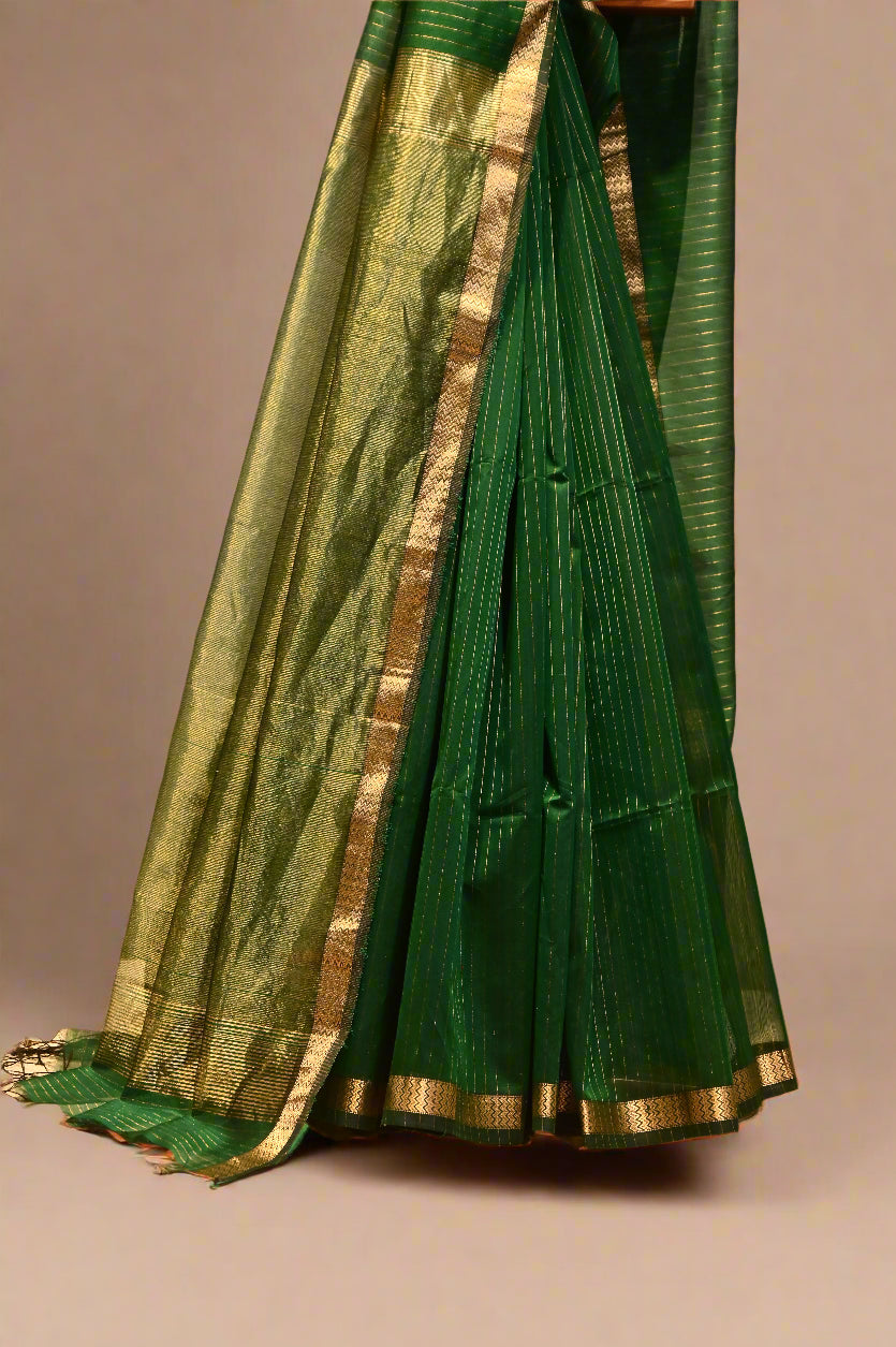 (Deliver in 30 Days) BOTTLE GREEN HANDWOVEN MAHESHWARI SAREE WITH VERTICAL ZARI STRIPE WEAVE
