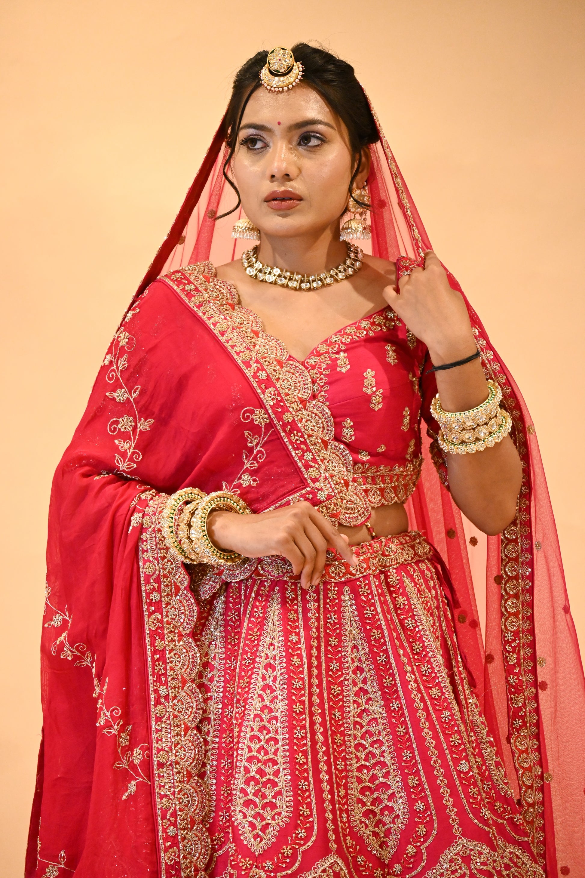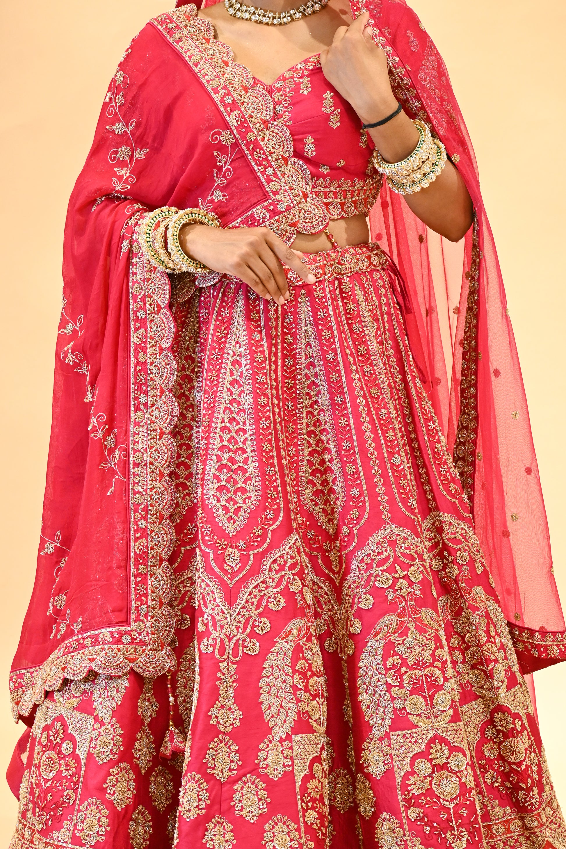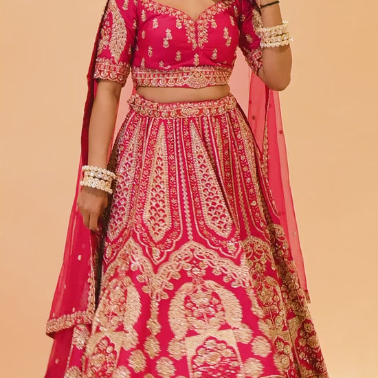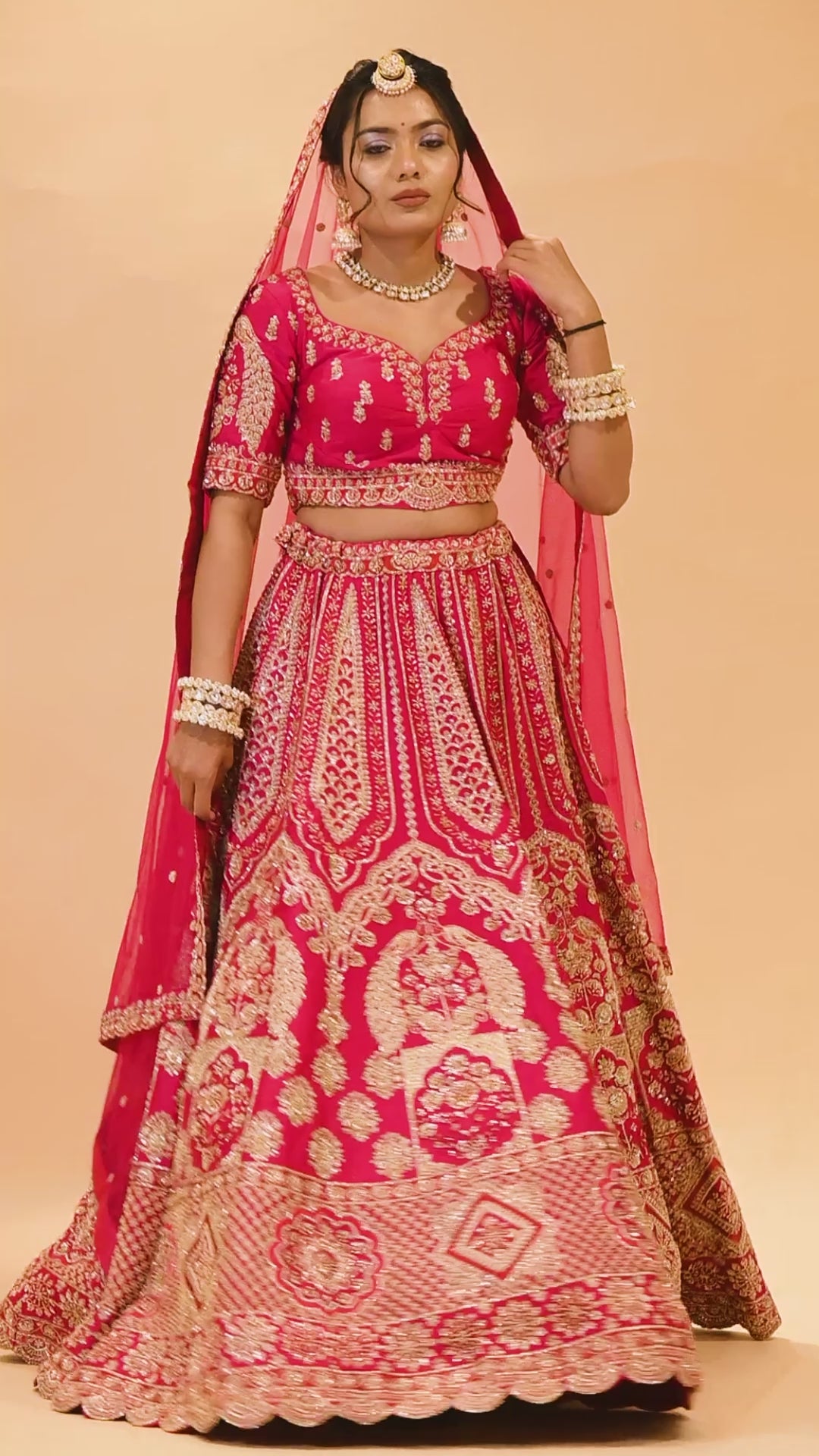 A regal bridal pink lehenga set, exquisitely detailed with golden zari, resham, and sequin embroidery that brings heritage artistry to life. The voluminous lehenga features intricate floral and geometric motifs, framed with richly embroidered borders that radiate grandeur. The matching blouse, designed with a sweetheart neckline and half sleeves, reflects the same intricate craftsmanship for a seamless bridal silhouette.