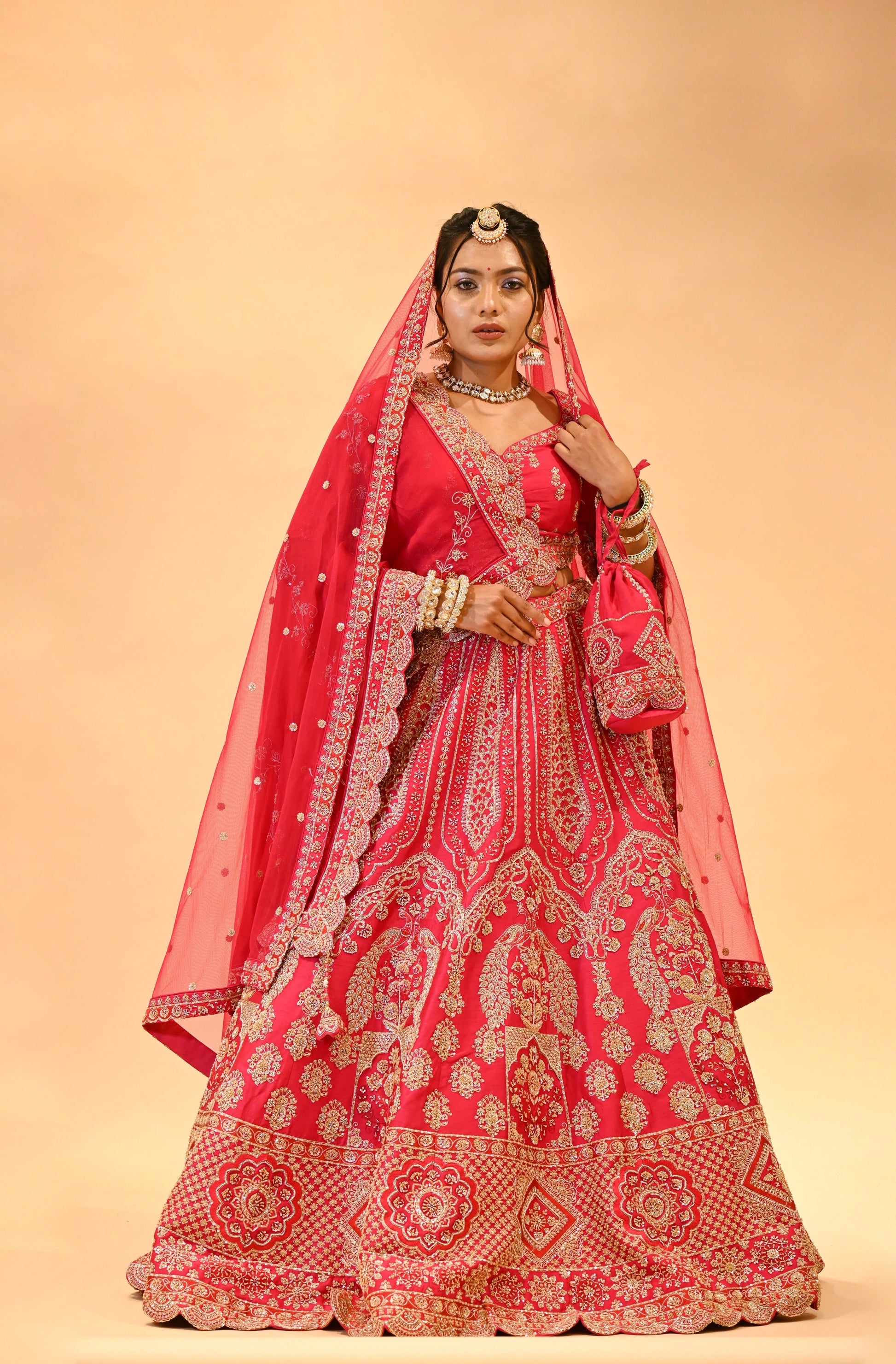 BRIDAL PINK HAND-EMBROIDERED LEHENGA SET WITH DOUBLE DUPATTA & MATCHING POTLI BAG