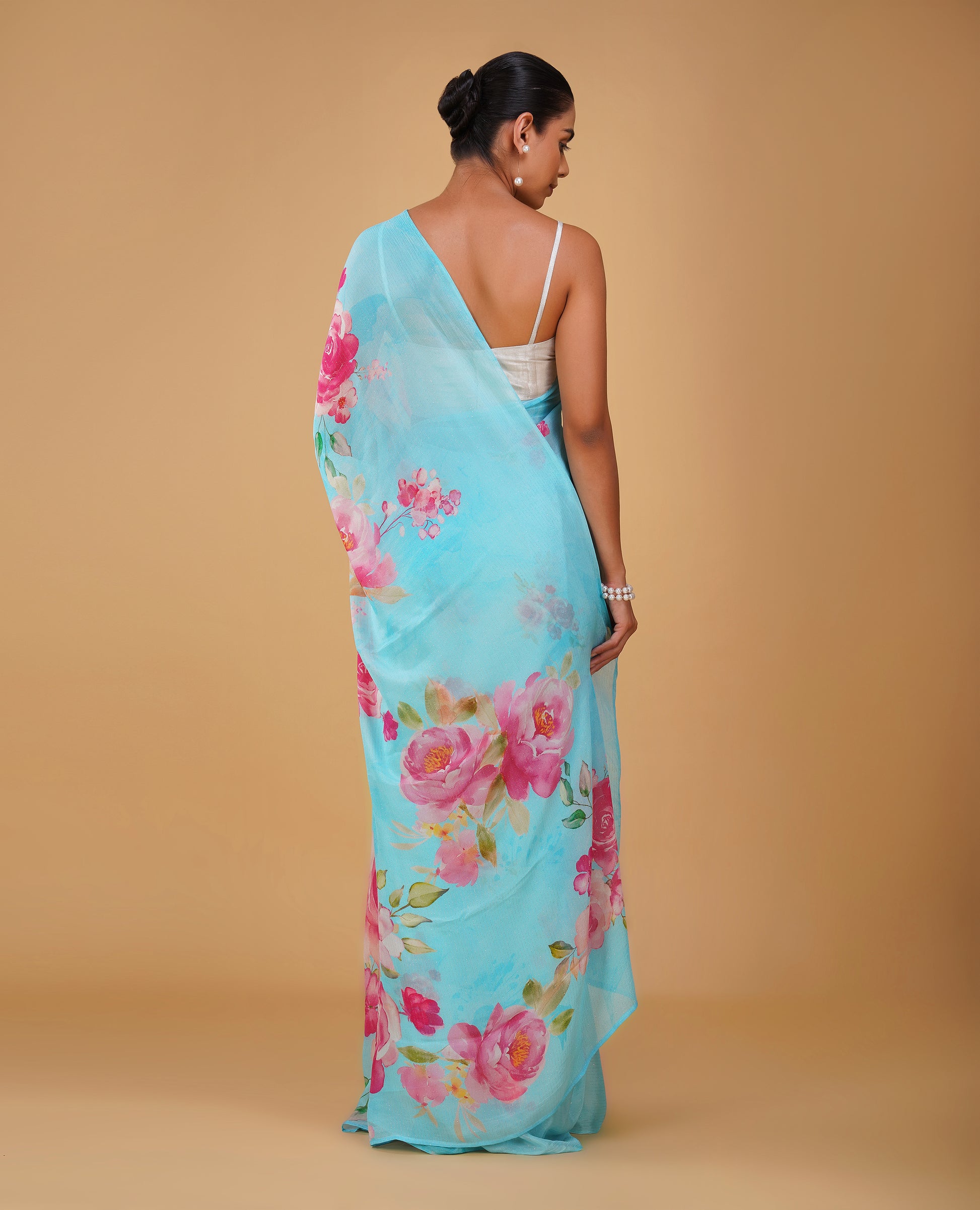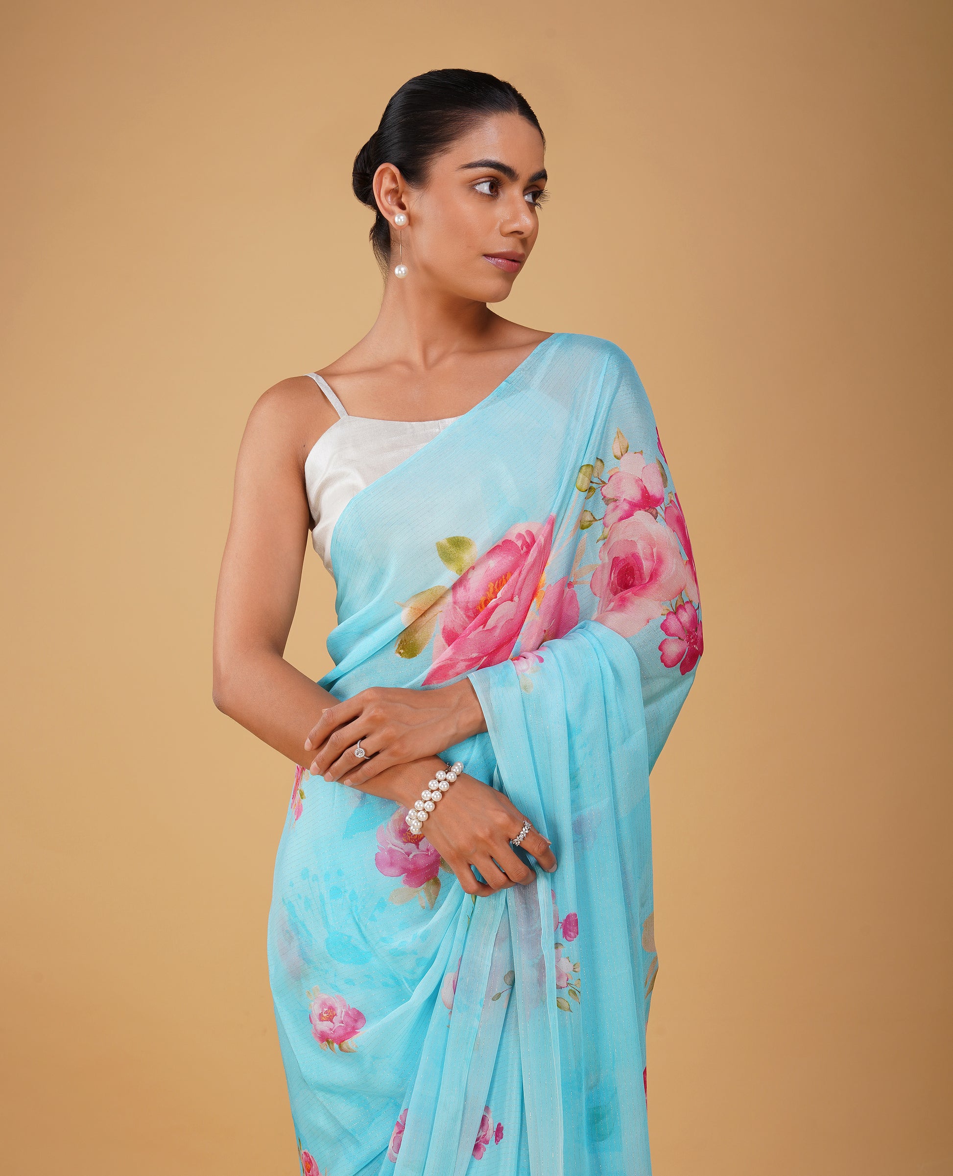 ( DELIVERY IN 15-20 DAYS ) CAPRI BLUE PRINTED CHINON SAREE WITH THIN ZARI WEAVE AND PLAIN CREPE BLOUSE