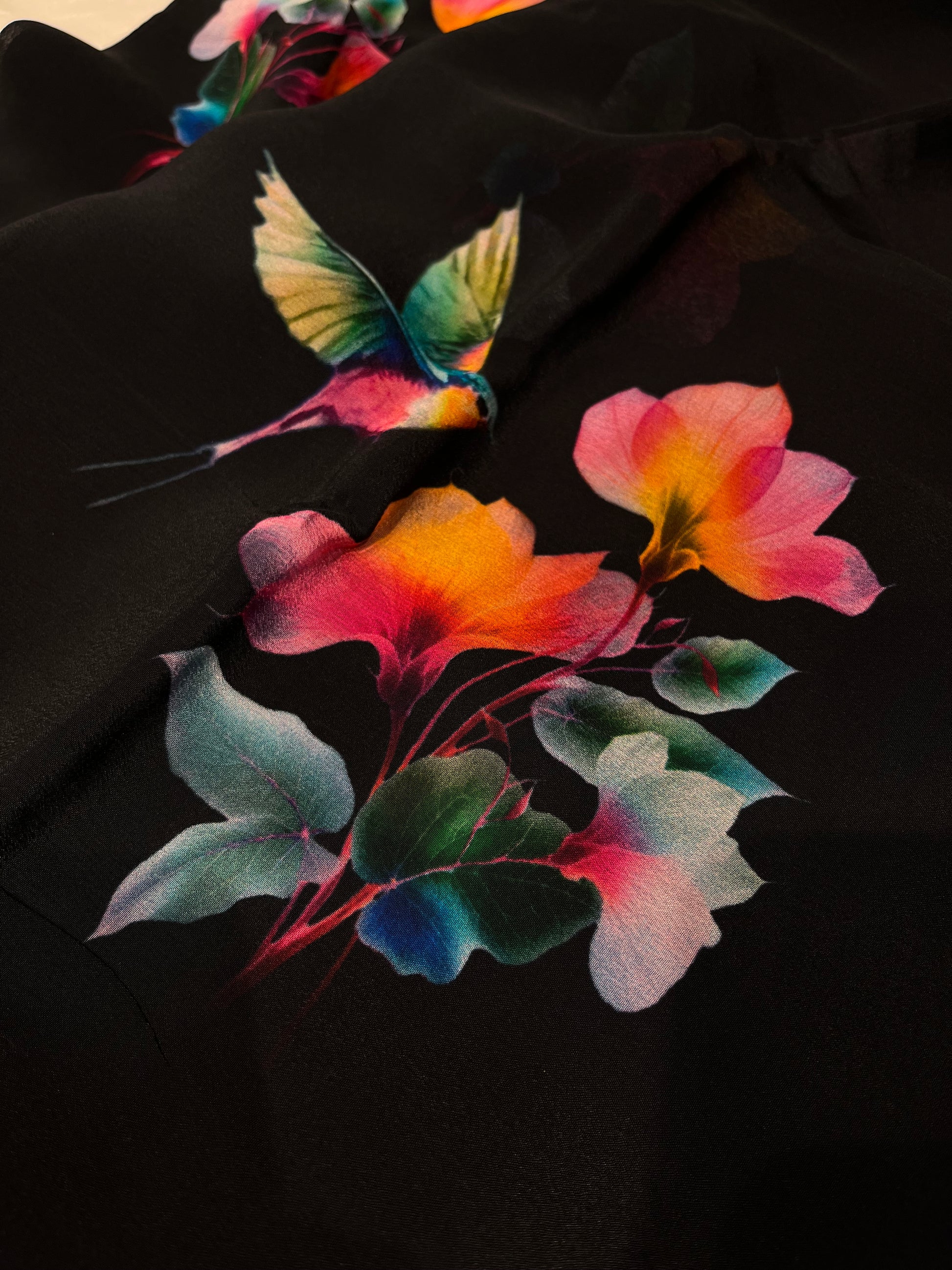 CHARCOAL BLACK CHINON PRINTED SAREE PAIRED WITH A PLAIN CREPE BLOUSE (DELIVERY IN 20 DAYS)