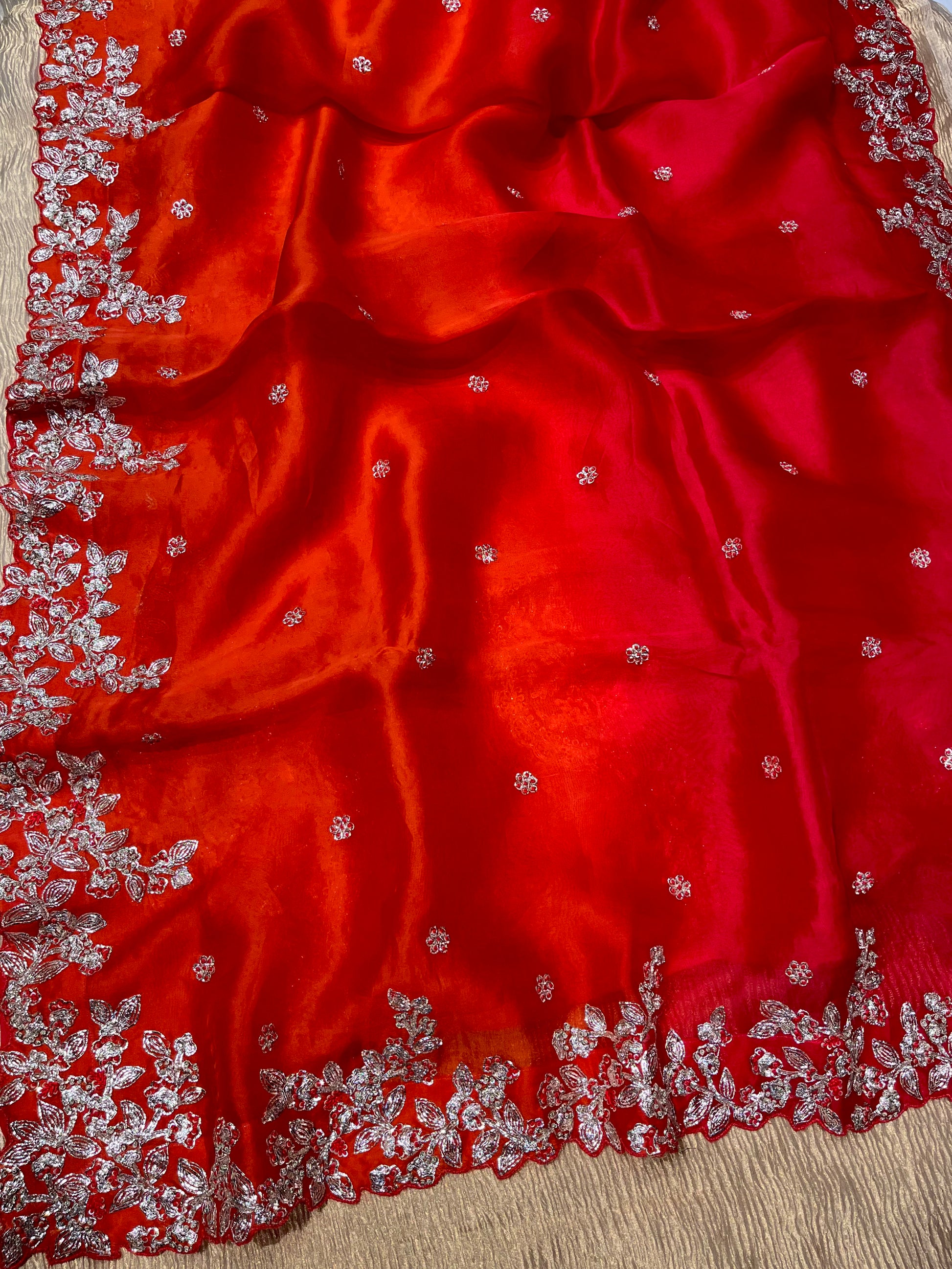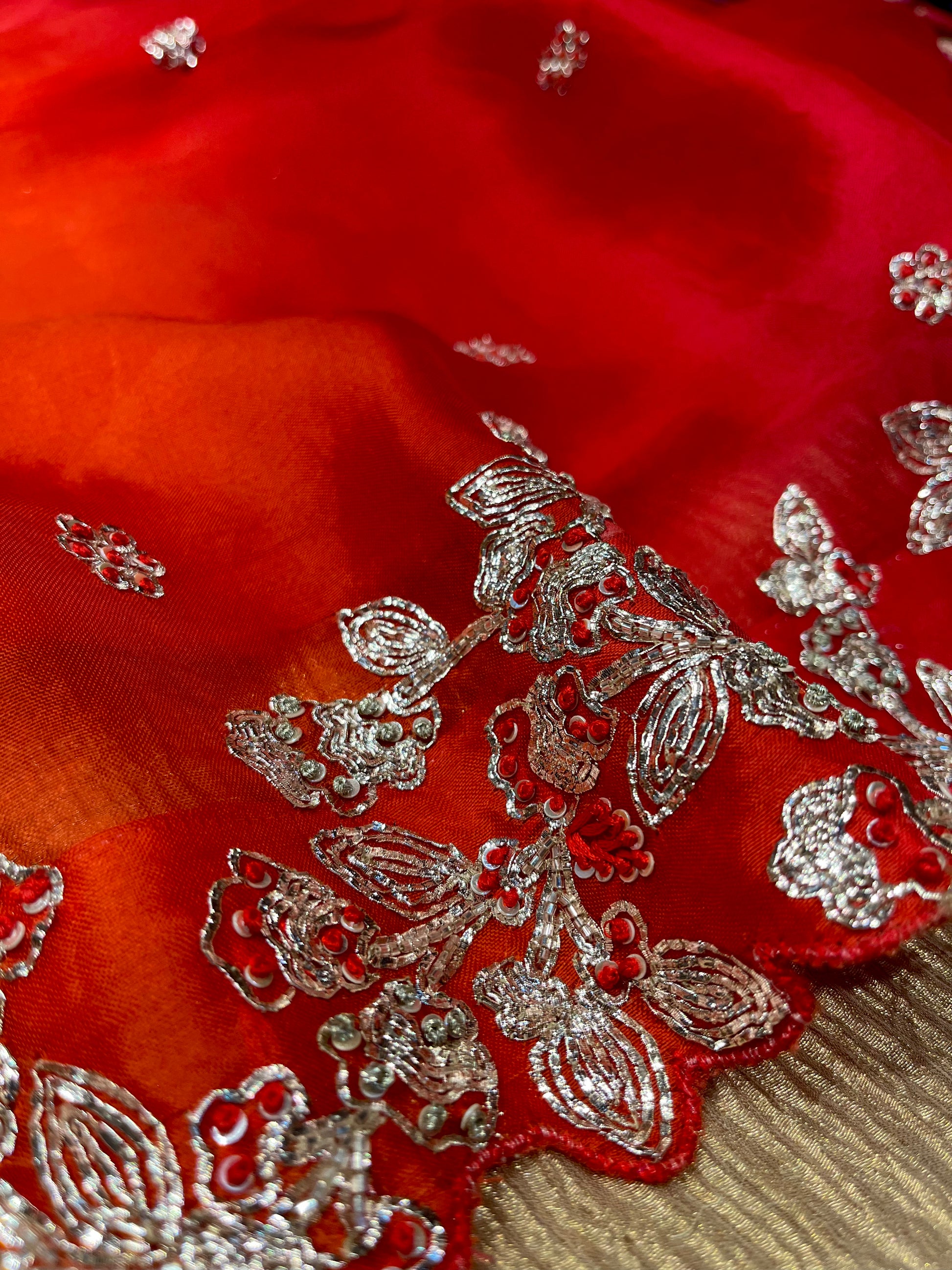[DELIVERY IN 25-30 DAYS] RED & ORANGE SHADED ORGANZA HANDMADE SAREE EMBELLISHED WITH SILVER BADLA EMBROIDERY