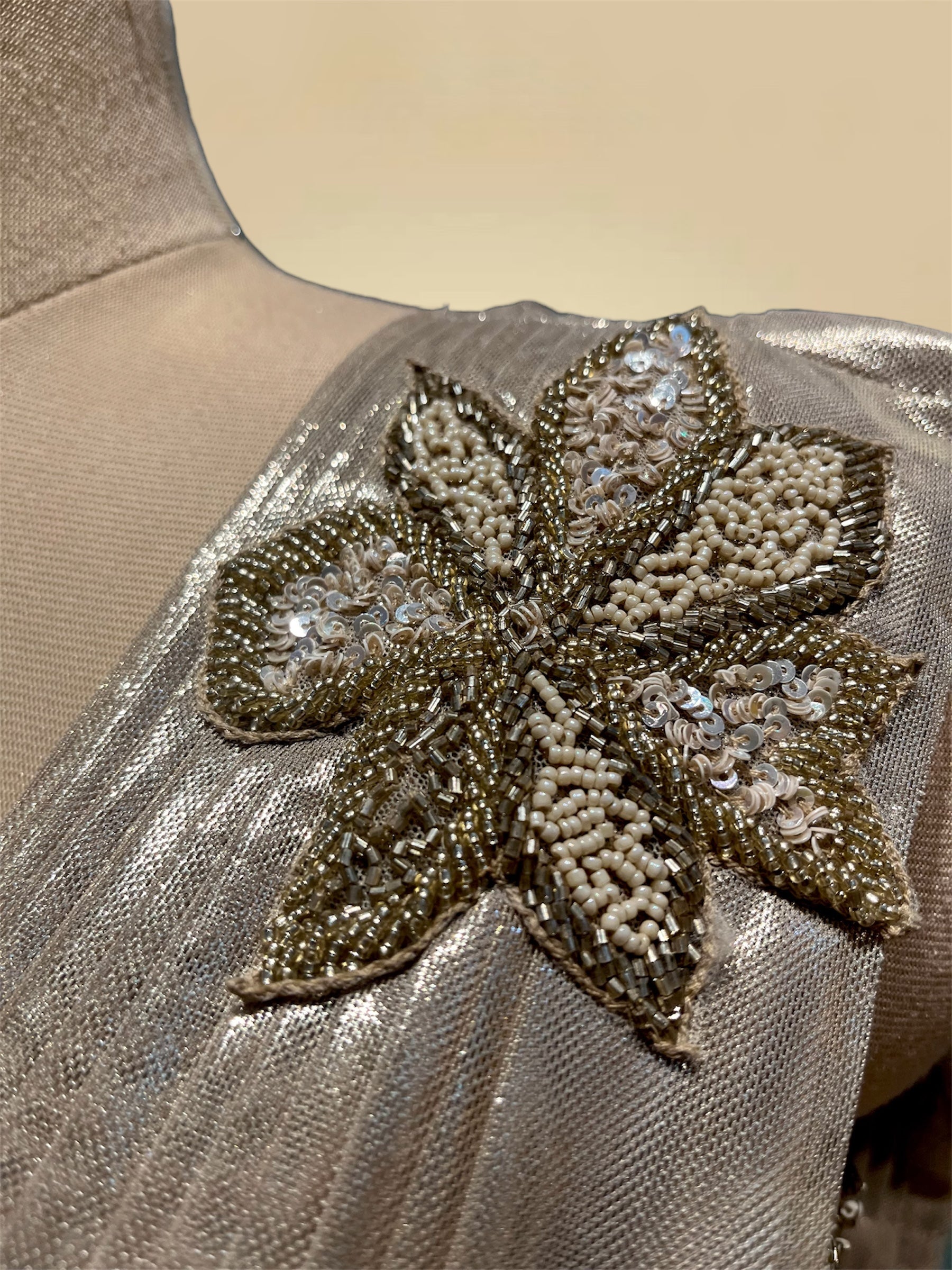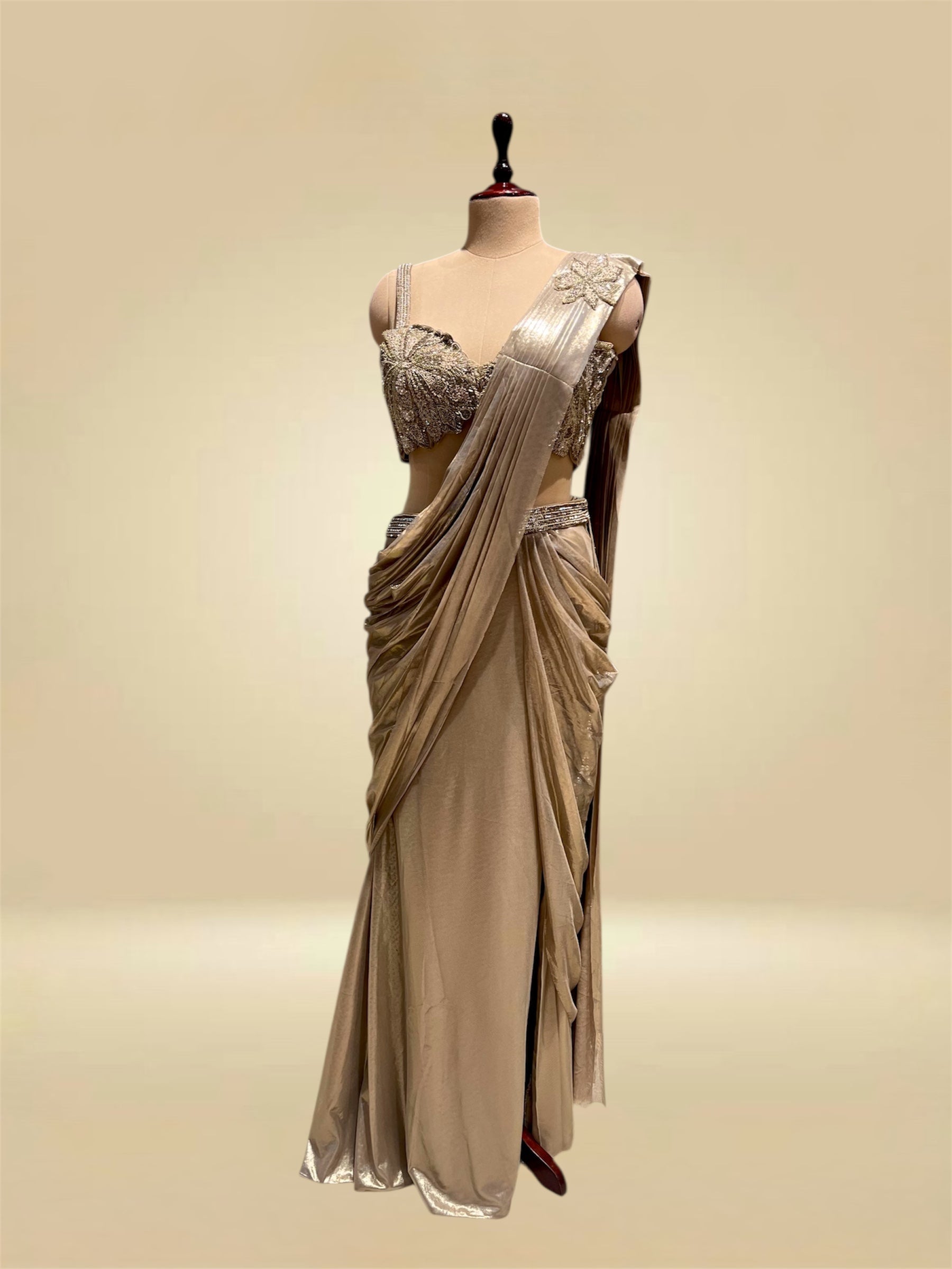 GOLD SHIMMER READYMADE SAREE WITH BEAD & SEQUIN EMBELLISHMENTS AND A CONTEMPORARY SIDE SLIT