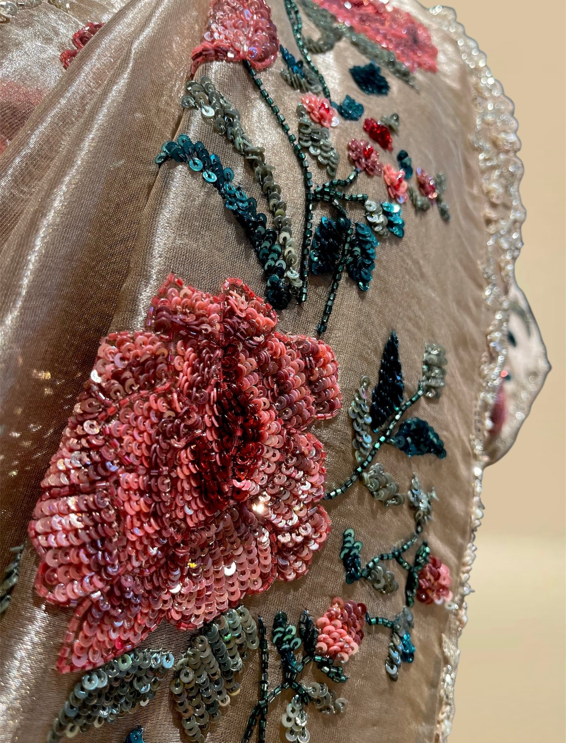 - Dry clean only to preserve the delicate tissue fabric and hand embroidery