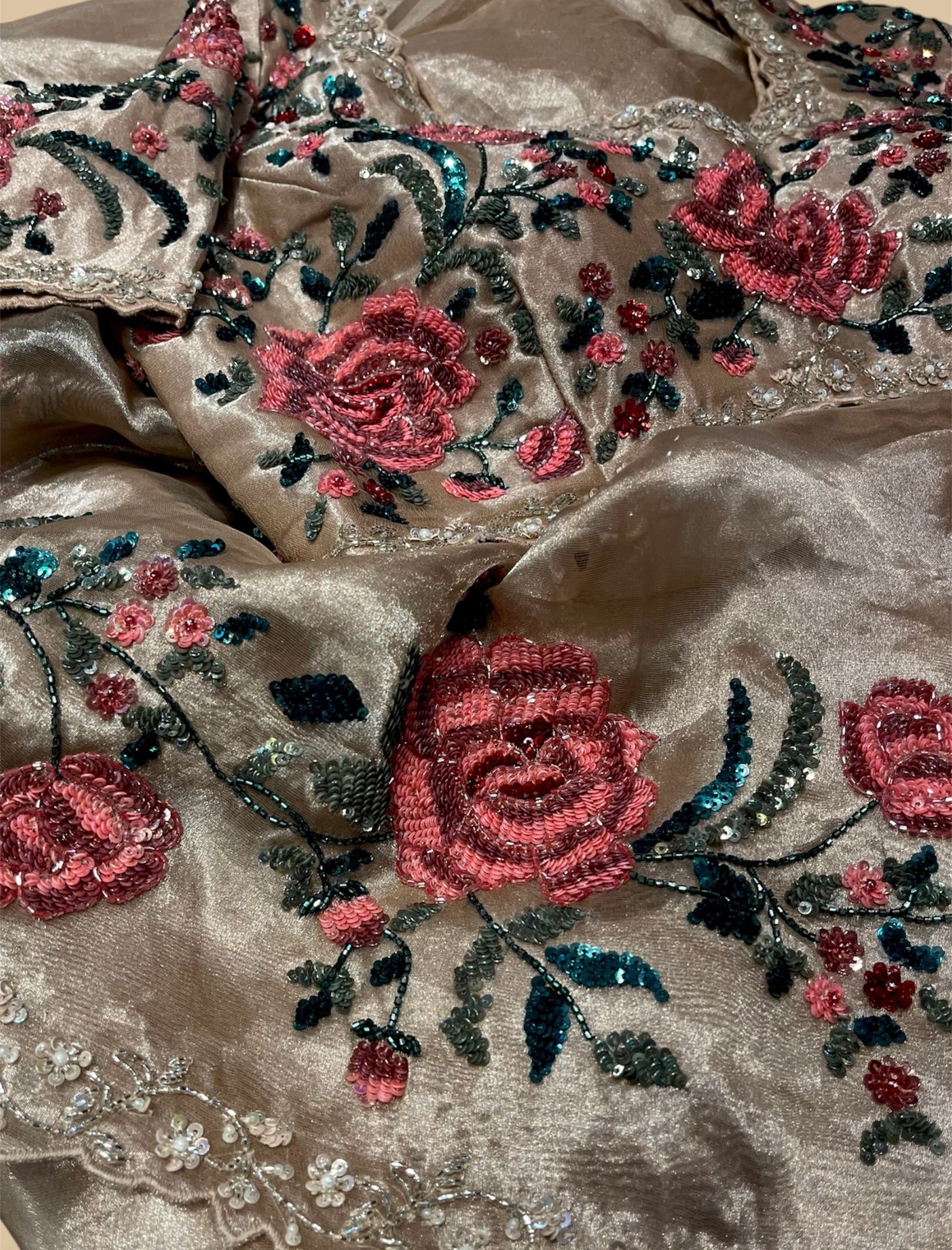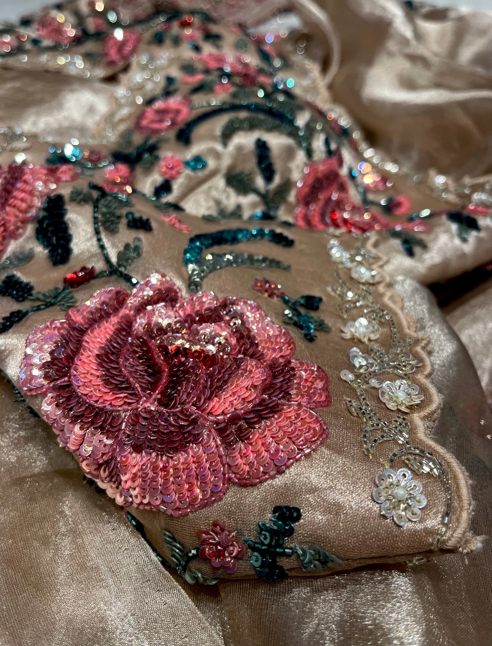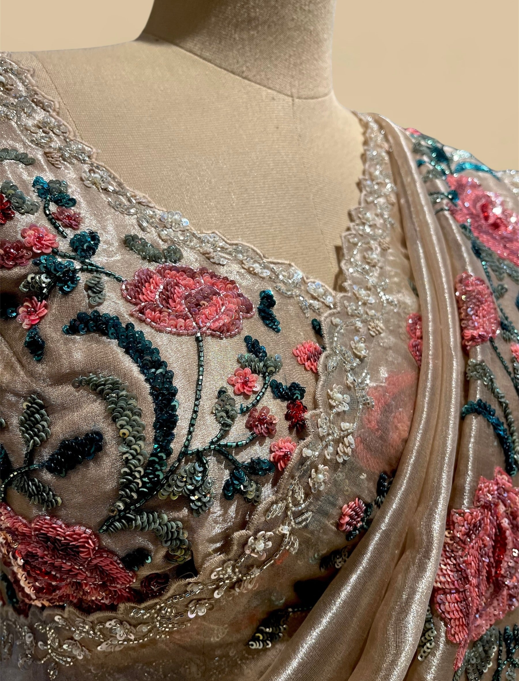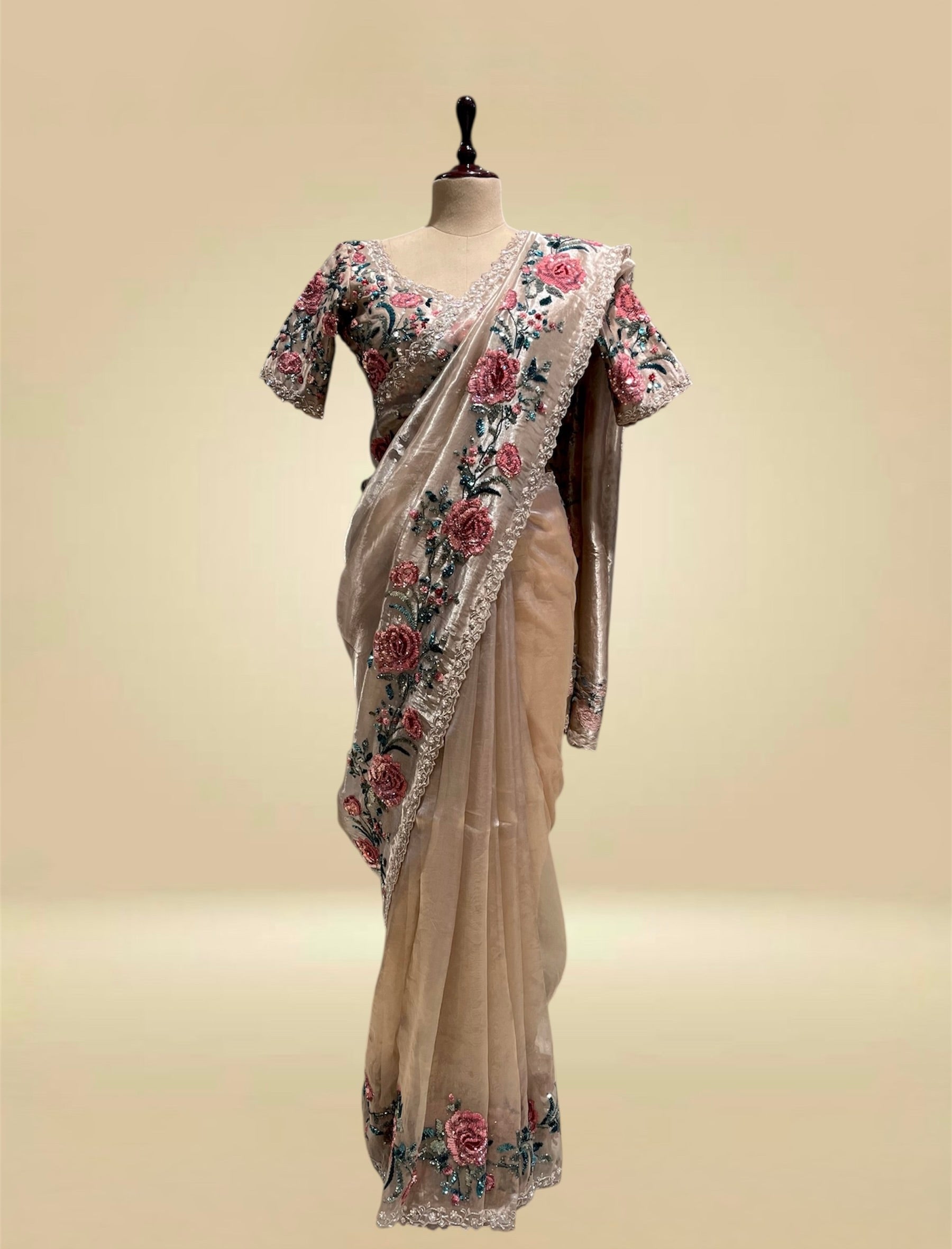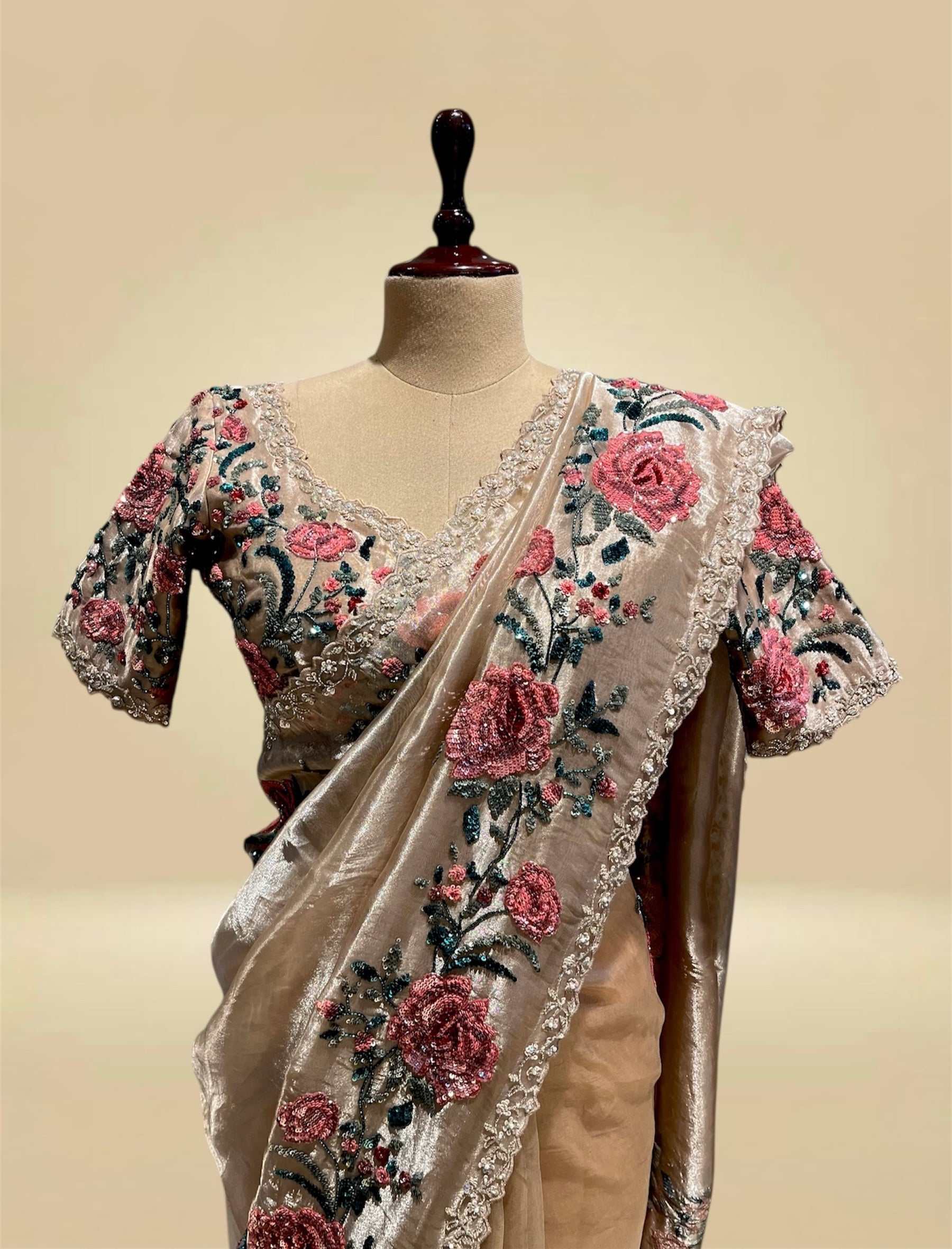 GOLDEN PURE TISSUE SEQUINS WORK HAND EMBROIDERED SAREE WITH READYMADE BLOUSE