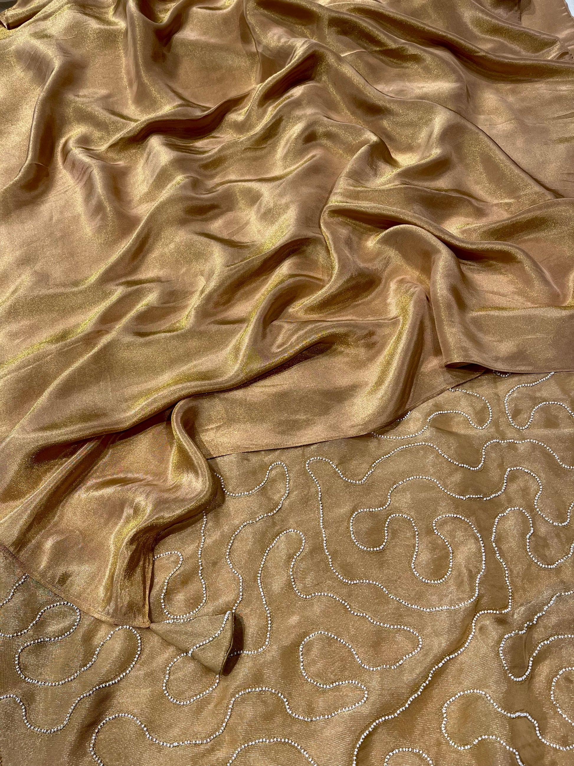Radiant, refined, and effortlessly timeless, this Golden Tissue Saree by Siddhaika is a celebration of understated luxury and classic elegance. Crafted from luminous golden tissue, the saree drapes beautifully with a soft sheen that enhances its ethereal appeal. Delicate embroidered tassels add graceful movement and artisanal charm, lending a subtle yet striking finish to the ensemble.Paired with a meticulously designed blouse adorned with hand-done pearl work, the look is elevated with soft luminosity and intricate detailing. Together, the saree and blouse create a harmonious balance of shimmer, texture, and refined craftsmanship.