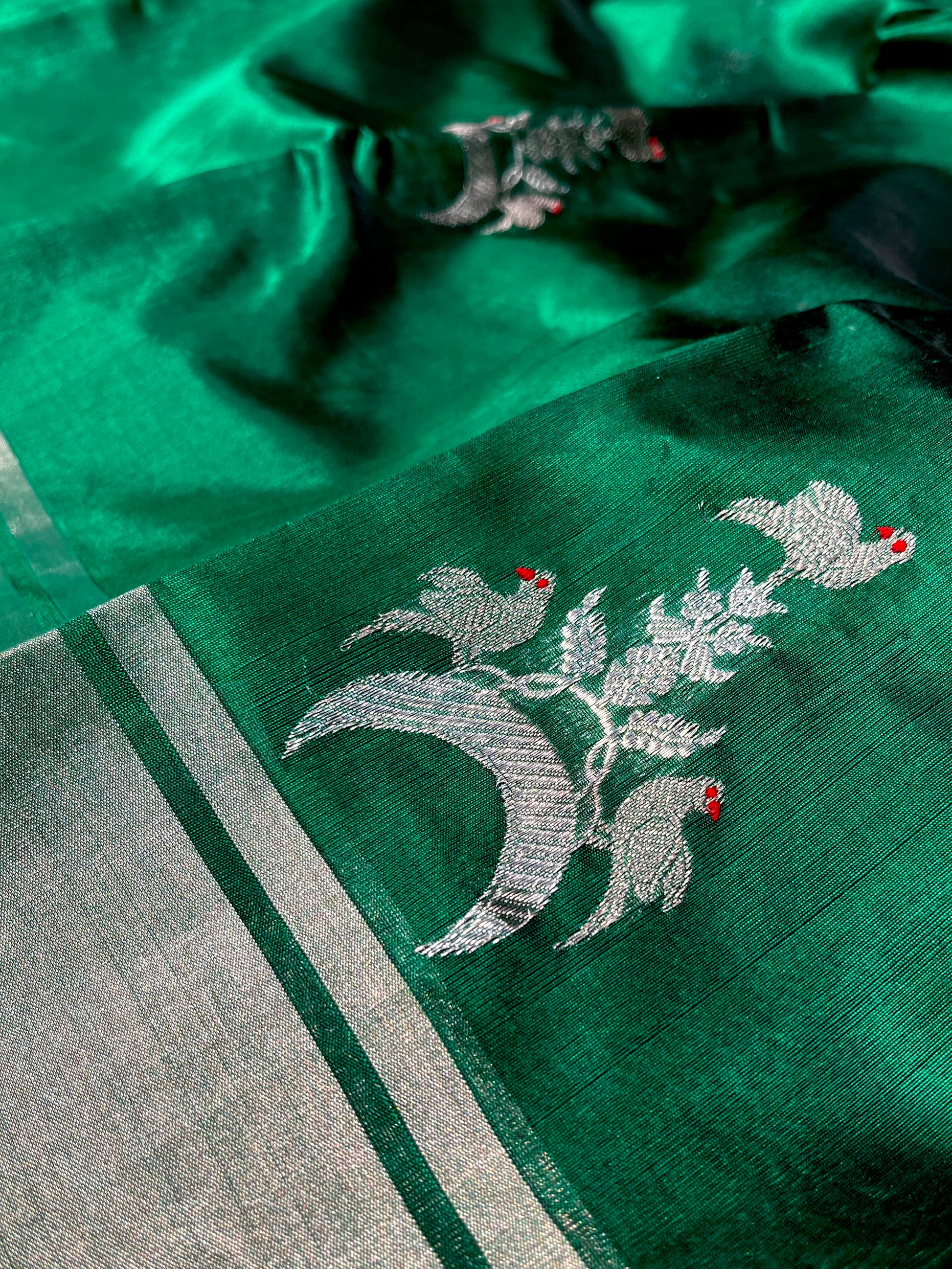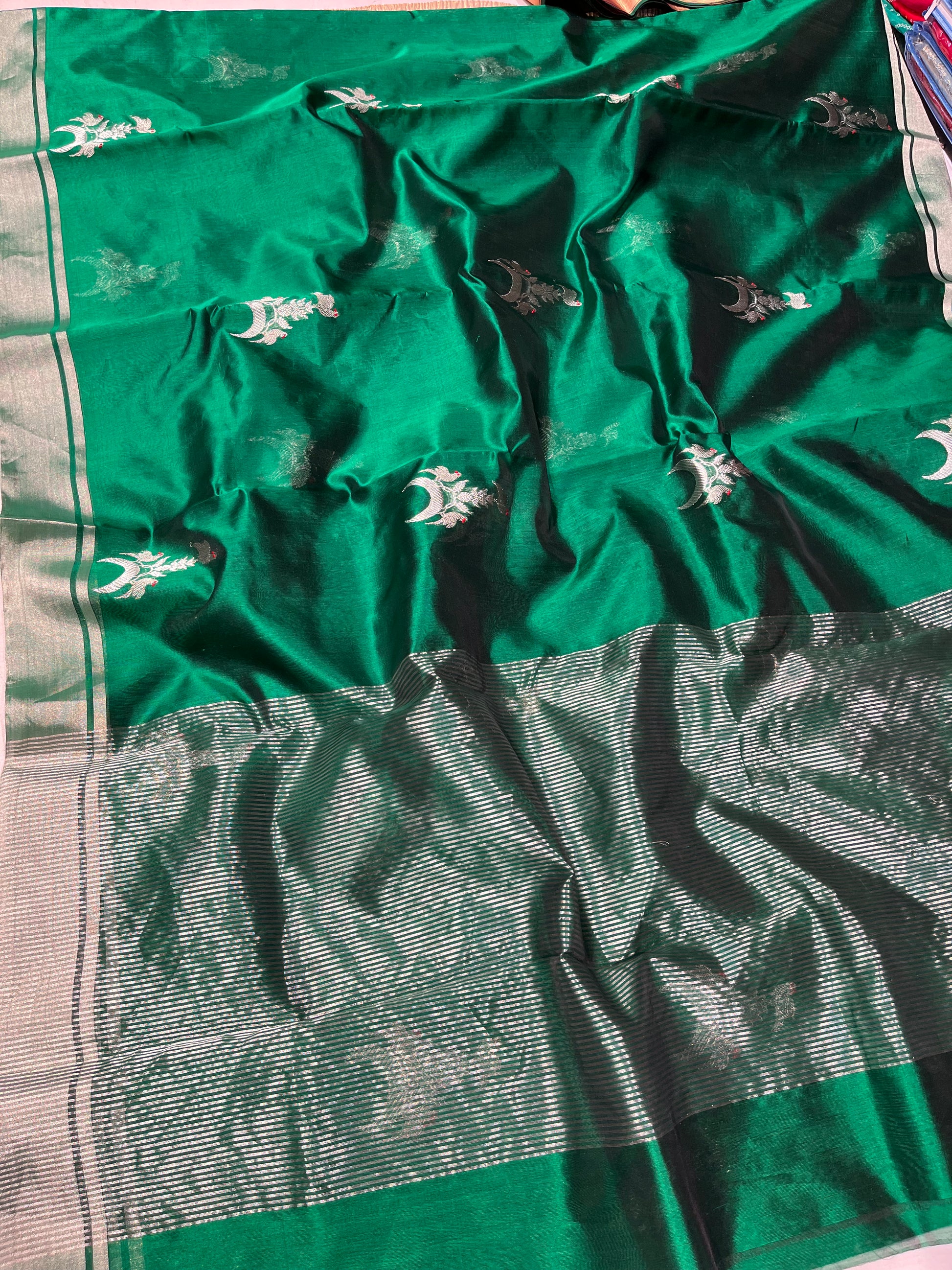 - Green chanderi pattu silk saree highlighted with golden zari.