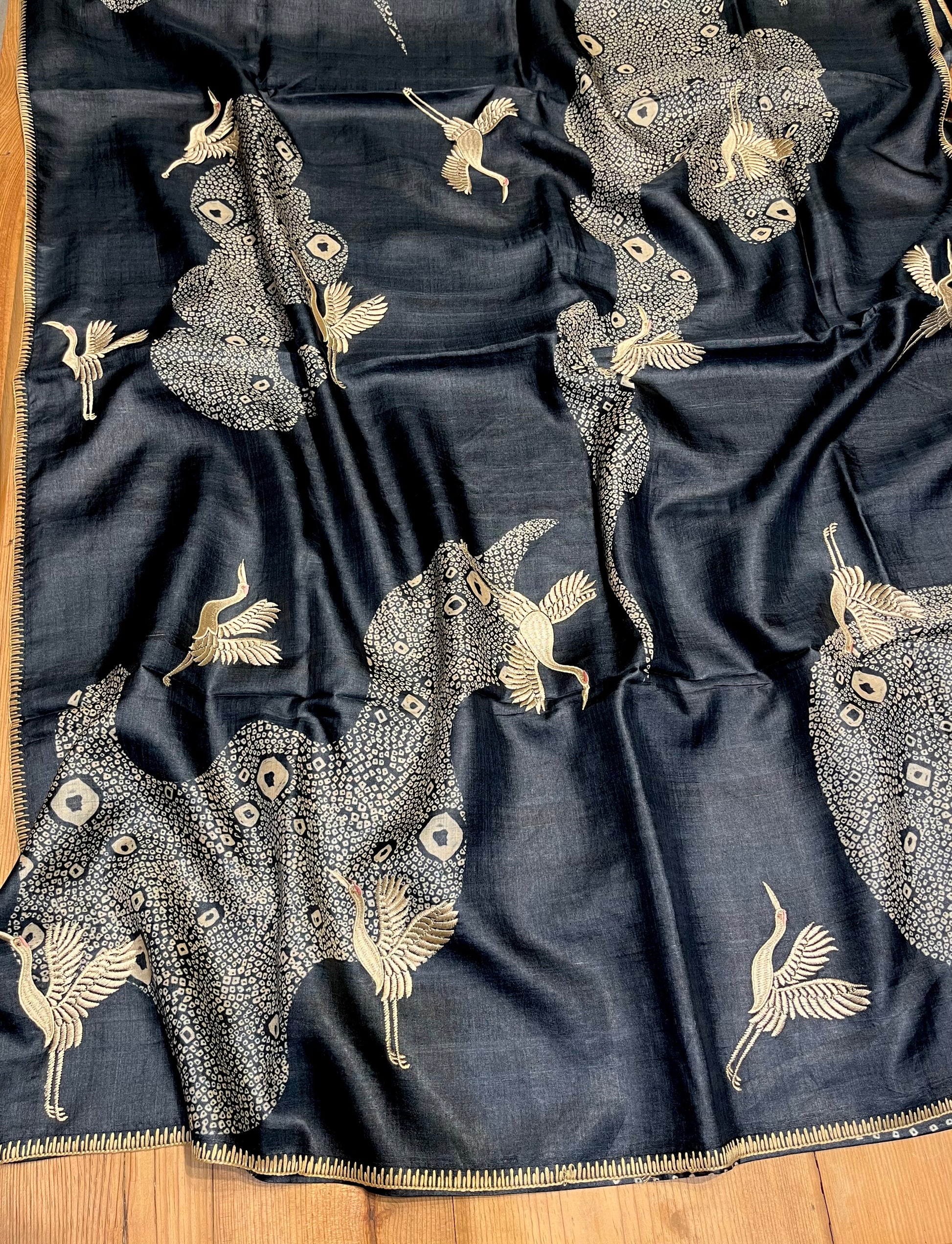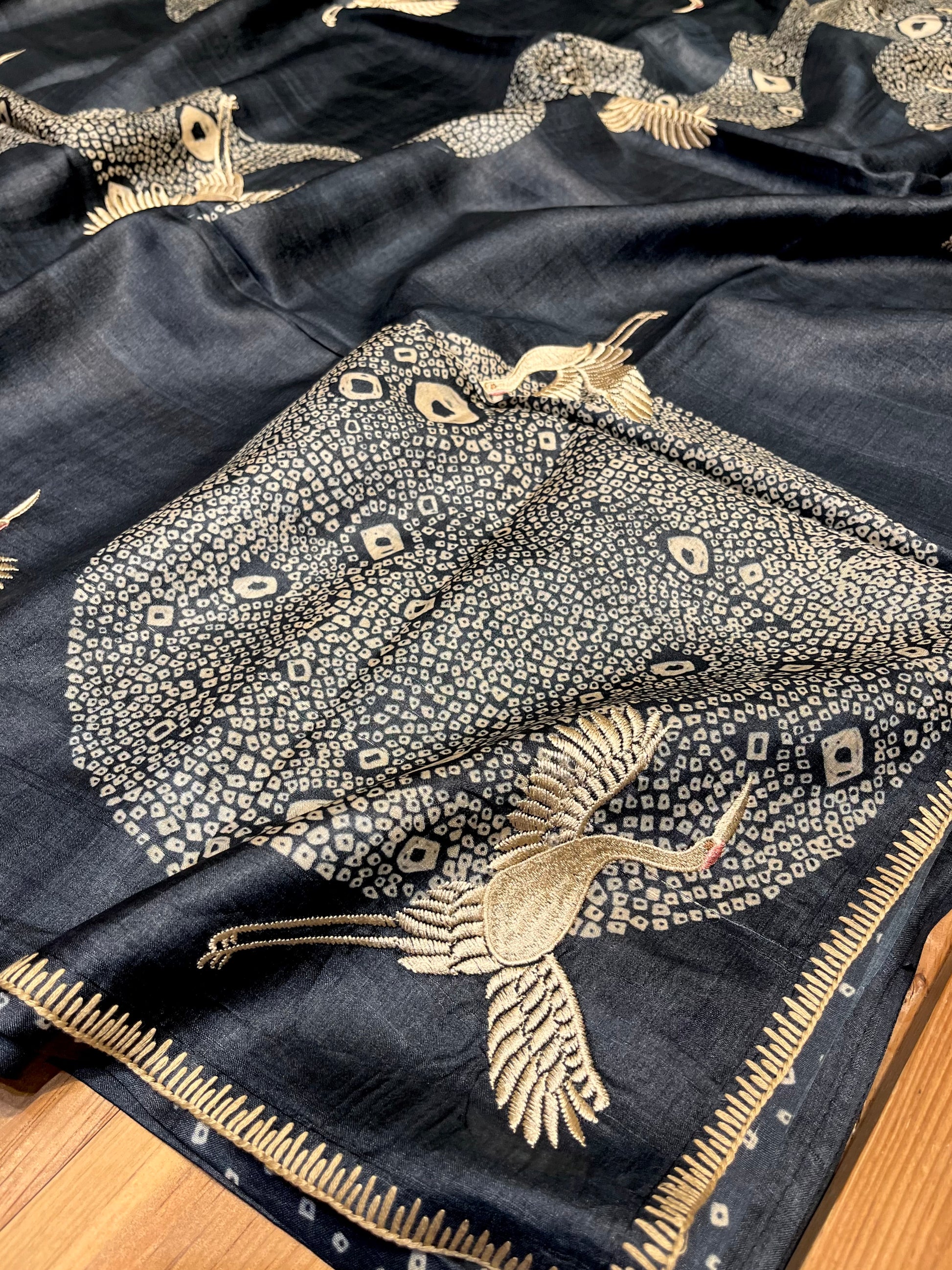GREY COLOUR TUSSAR SILK SAREE WITH RESHAM EMBROIDERY
