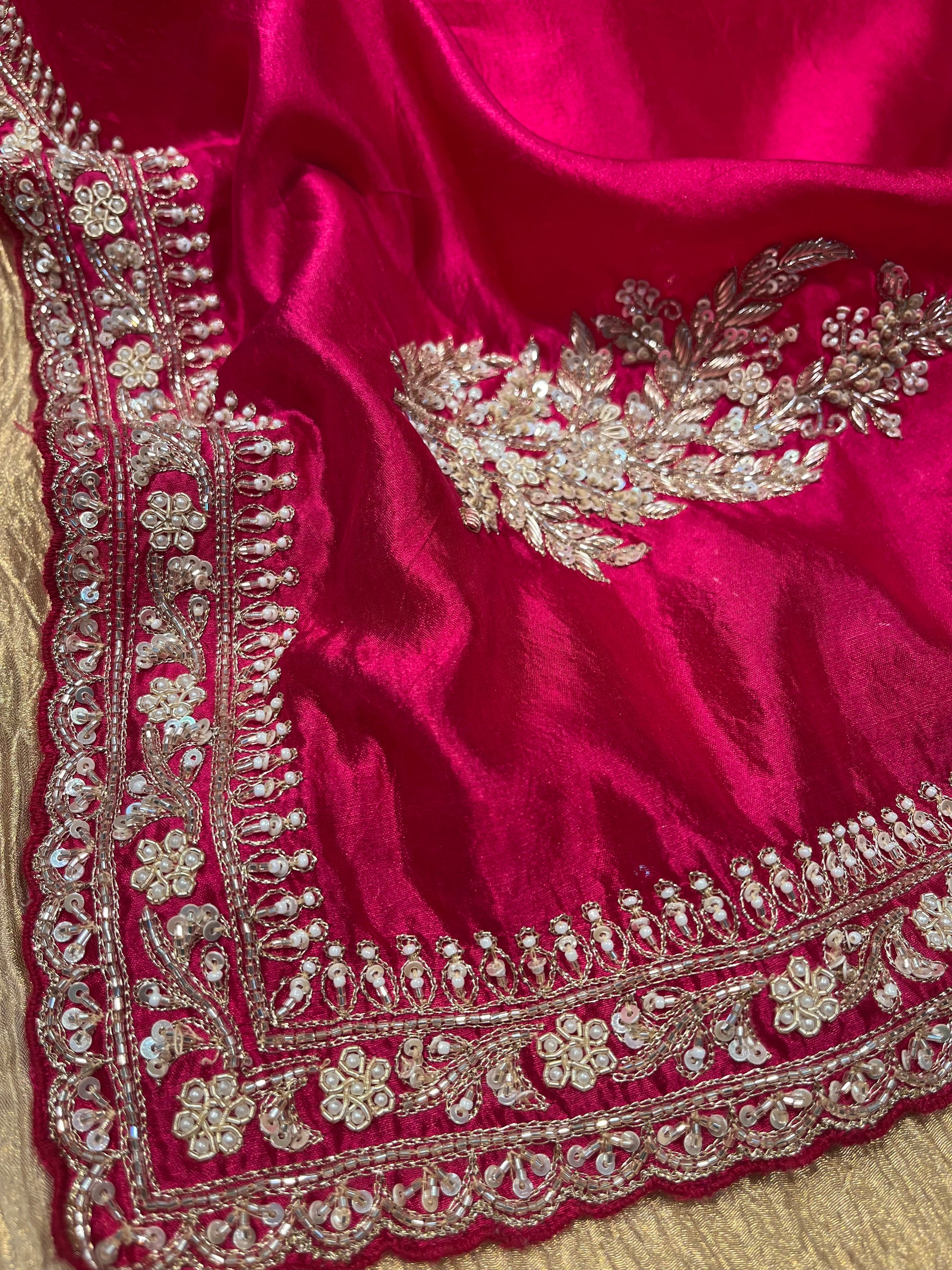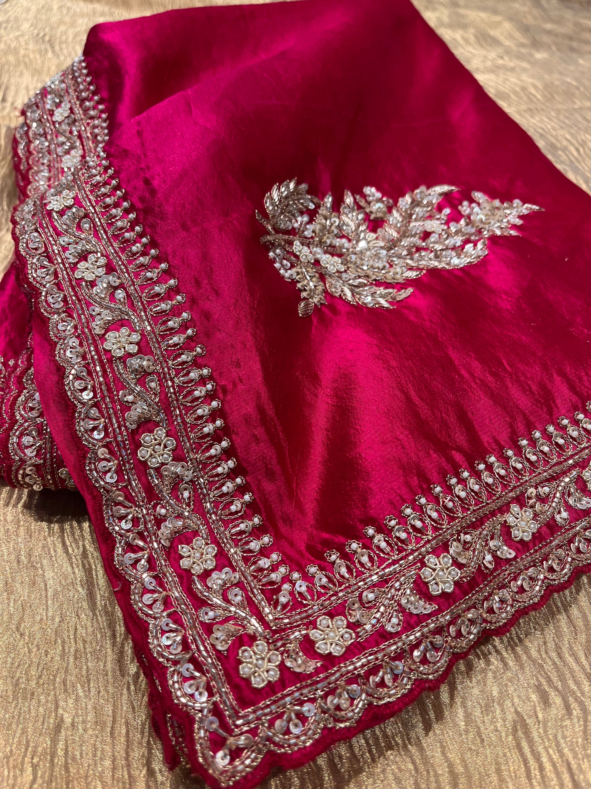 HOT PINK COLOUR RAW SILK HAND EMBROIDERED SAREE EMBELLISHED WITH SEQUINS, CUTDANA & ZARDOZI WORK