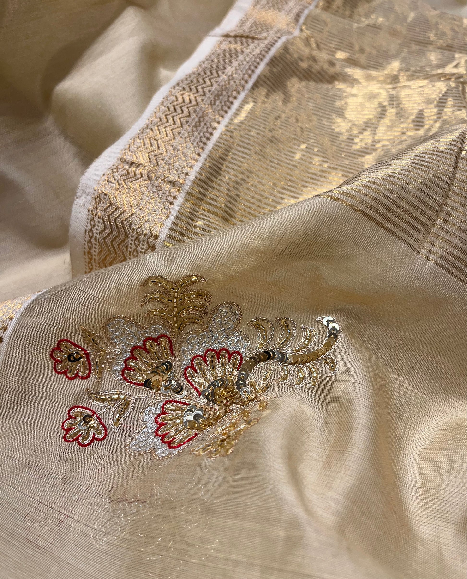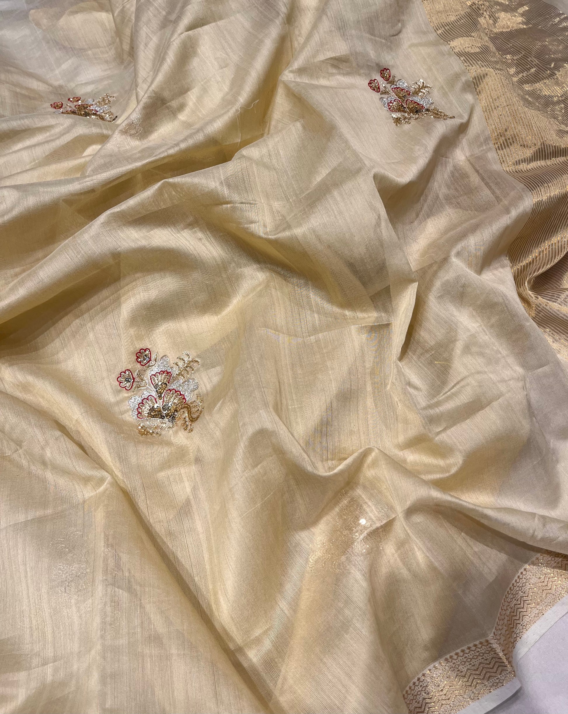 IVORY COLOUR CHANDERI HAND EMBROIDERED SAREE EMBELLISHED WITH CUTDANA & SEQUINS WORK