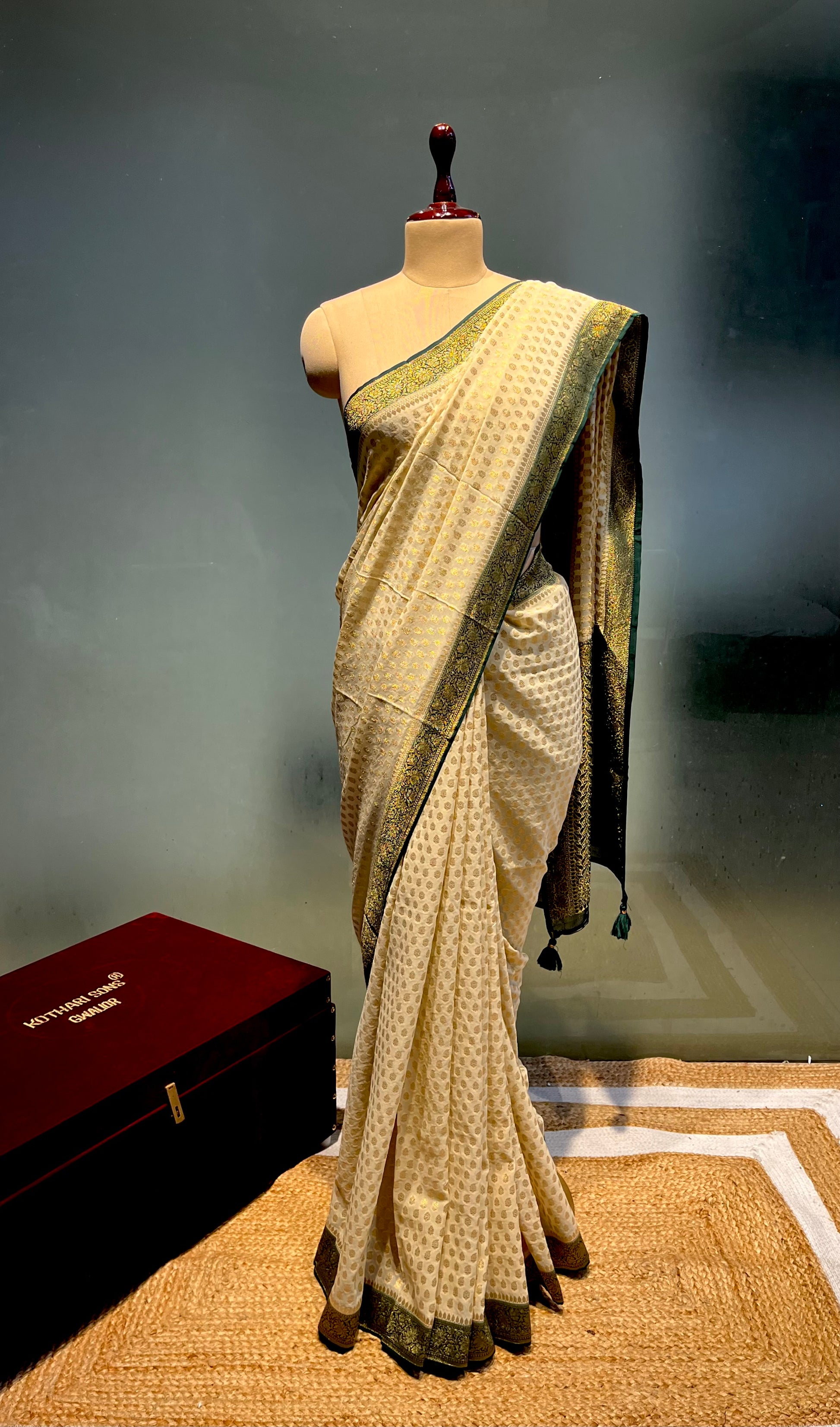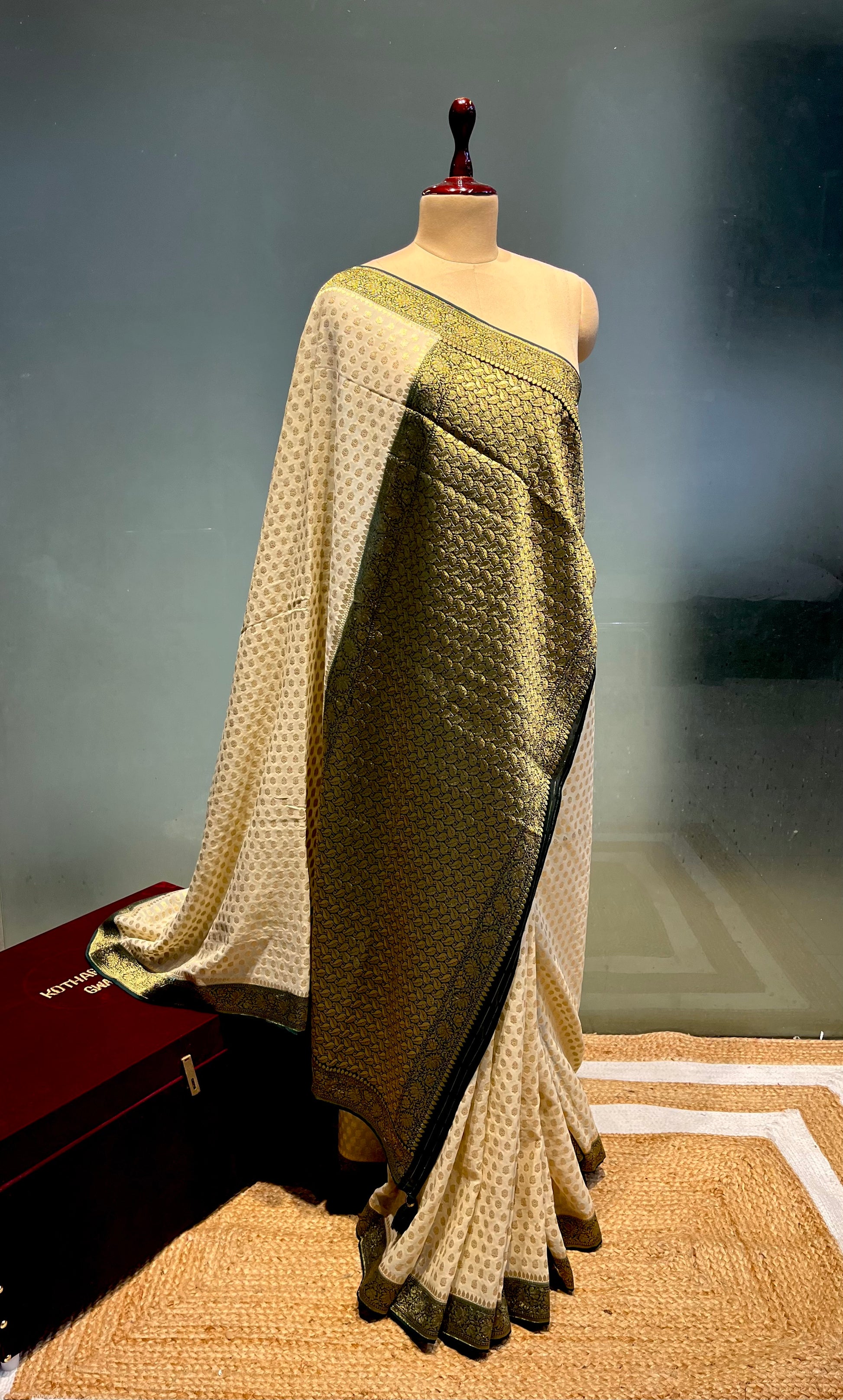 IVORY COLOUR GEORGETTE KHADDI SAREE WITH CONTRAST BORDER EMBELLIWITH ZARI WEAVES
