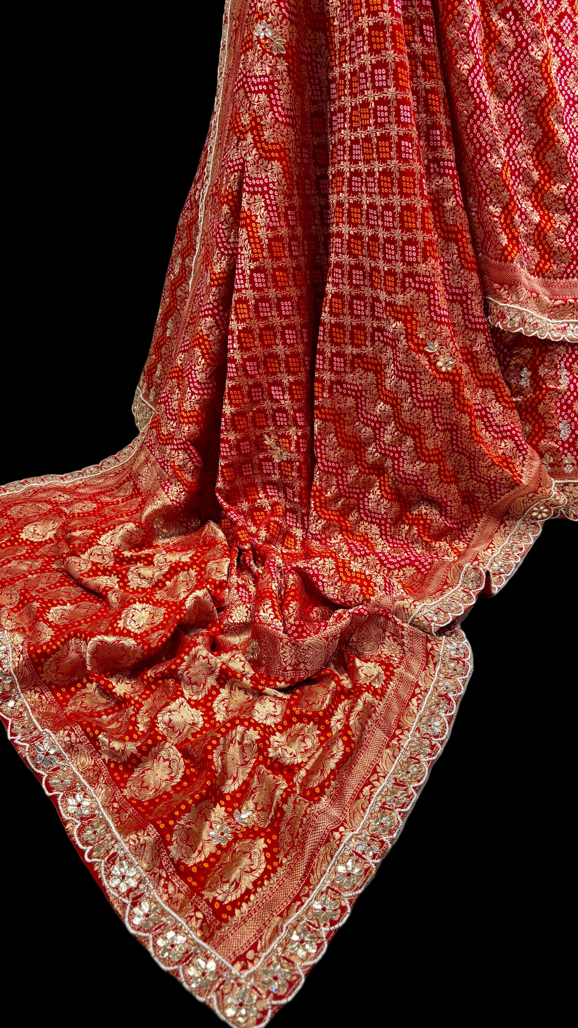 IVORY-RED COLOUR TISSUE GEORGETTE BANDHANI LEHENGA EMBELLISHED WITH GOTA PATTI & ZARDOZI WORK