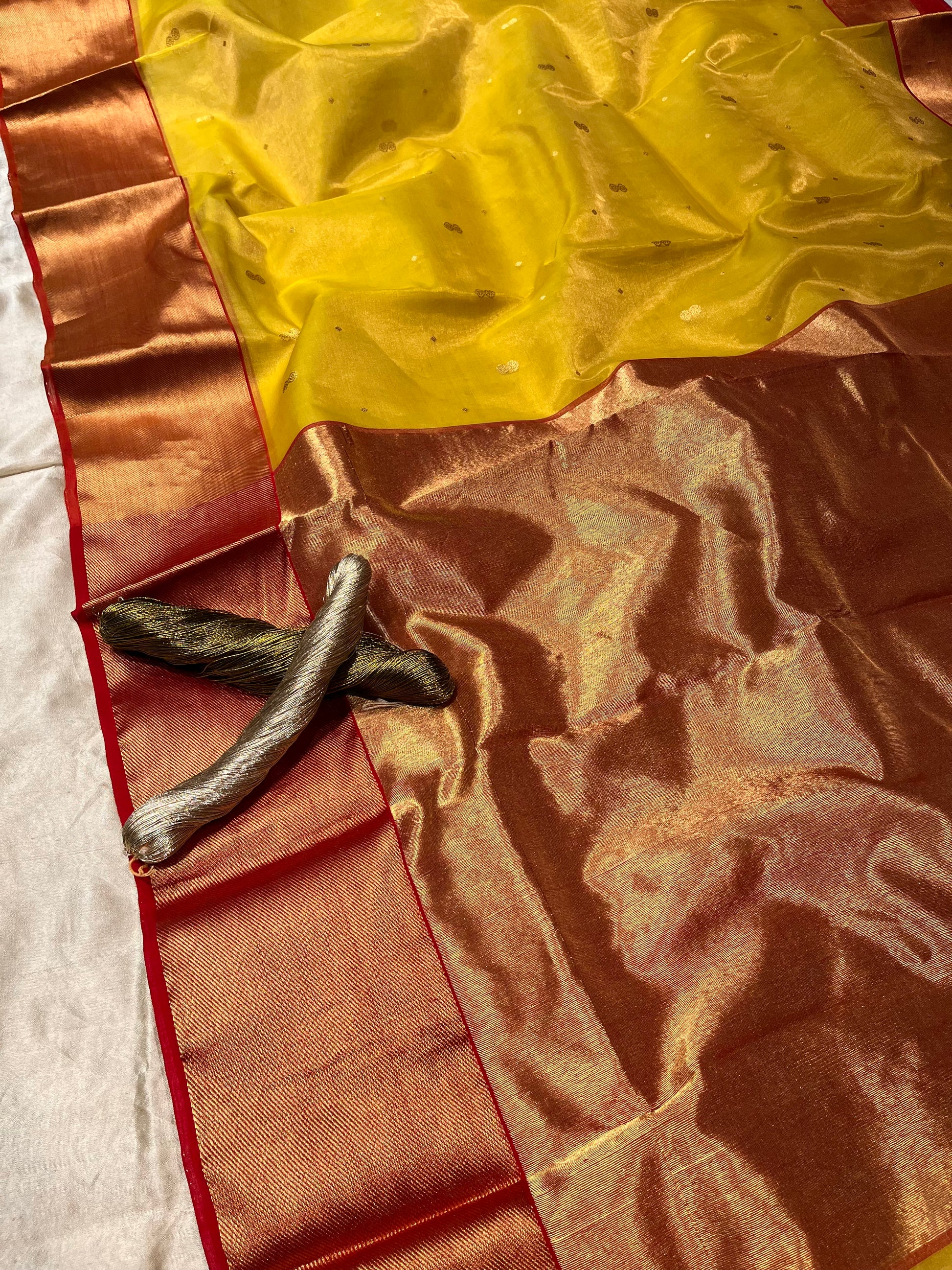 LEMON GREEN COLOUR CHANDERI TISSUE HANDLOOM SAREE EMBELLISHED WITH ZARI WEAVES