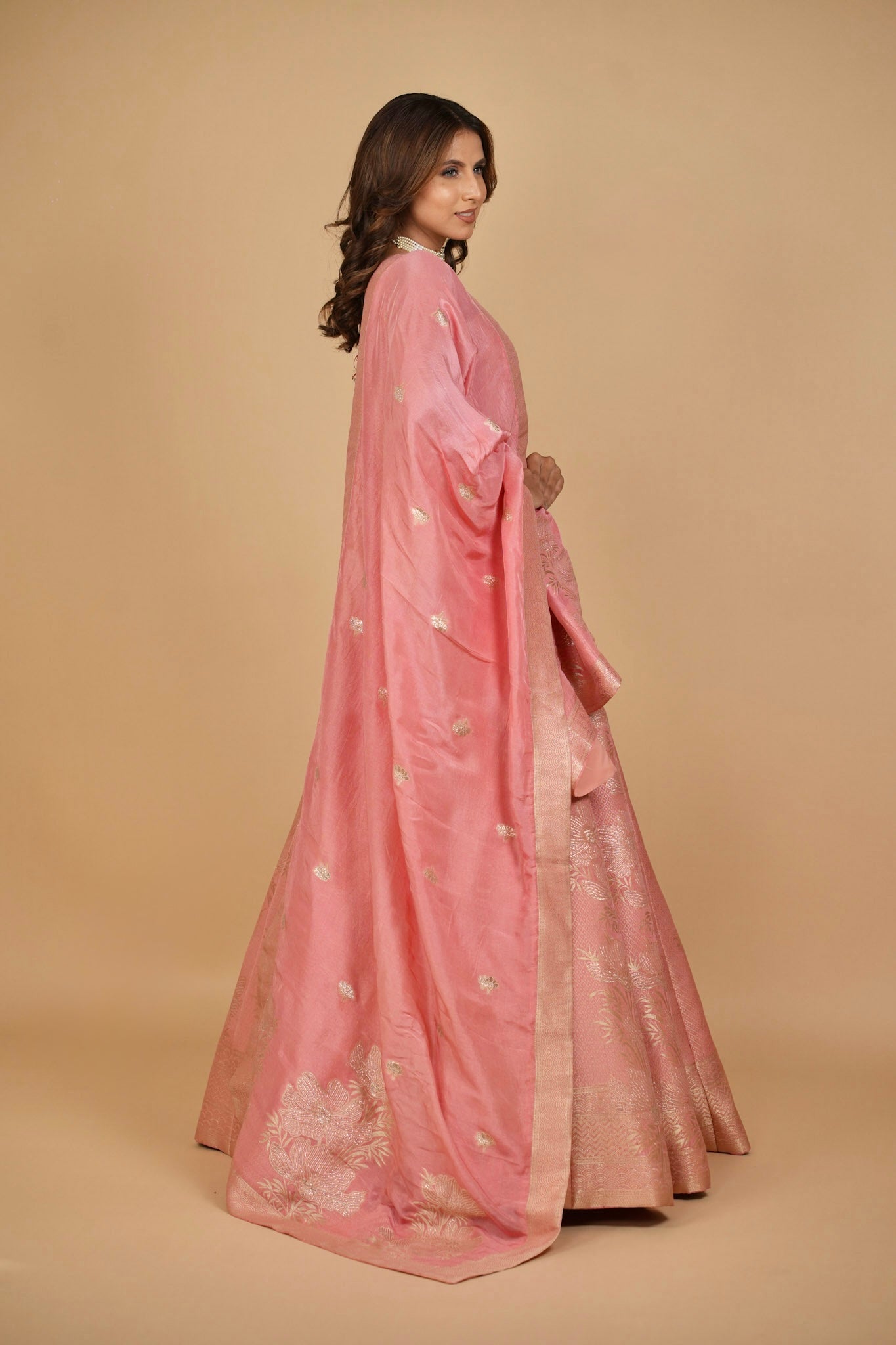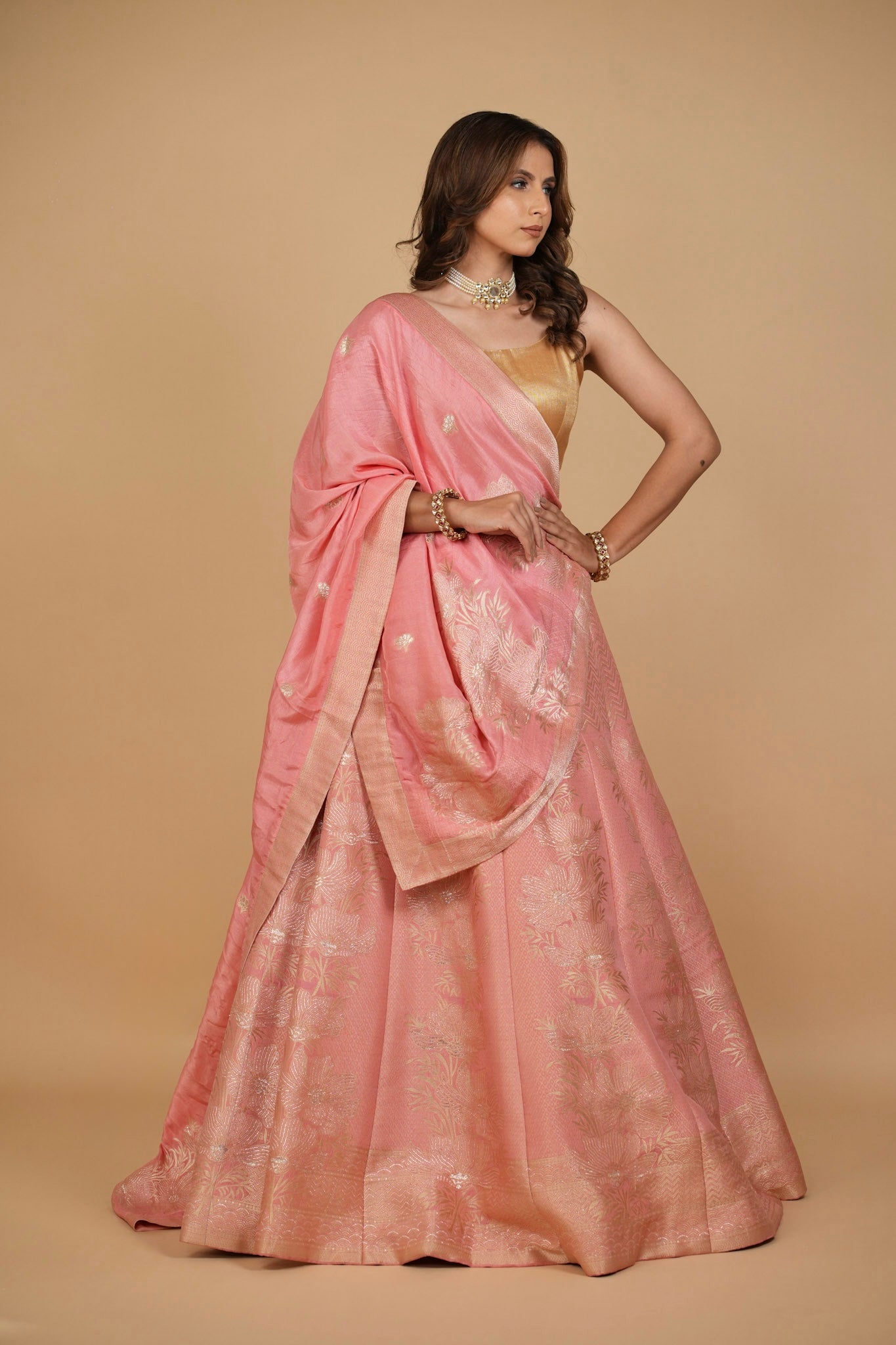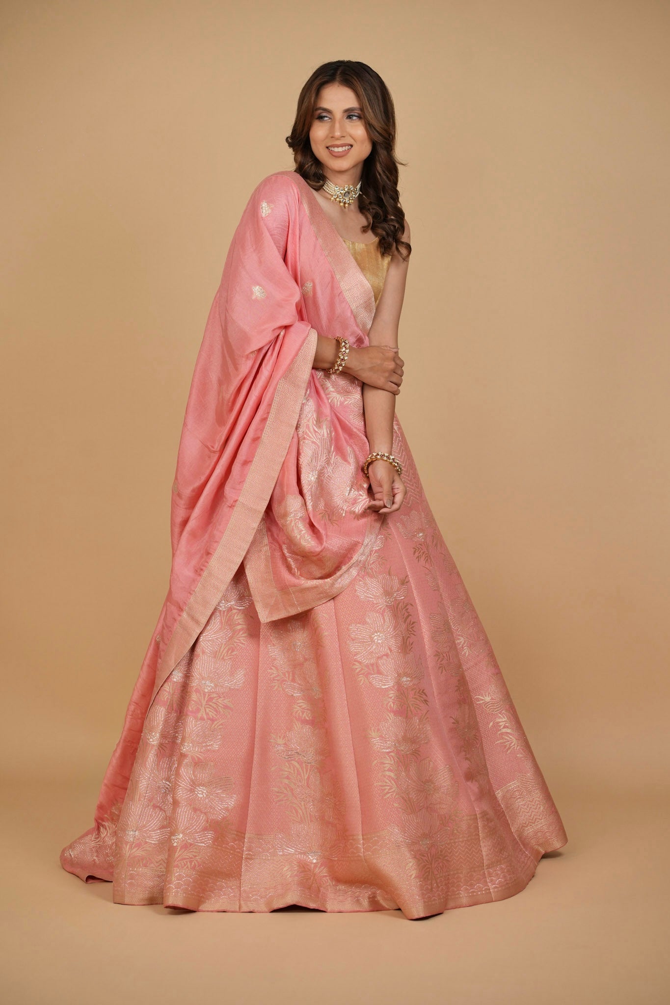 LIGHT PINK BANARASI LEHENGA WITH DUPATTA AND MONOTONE BLOUSE