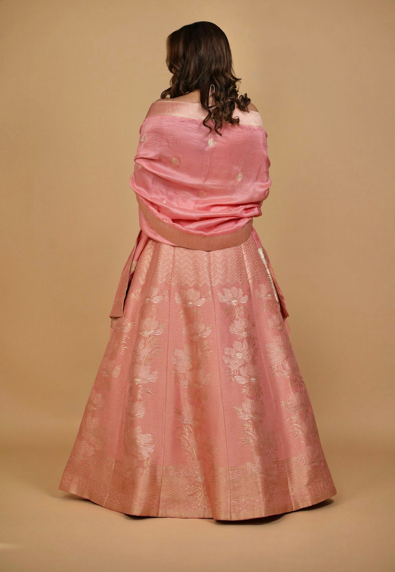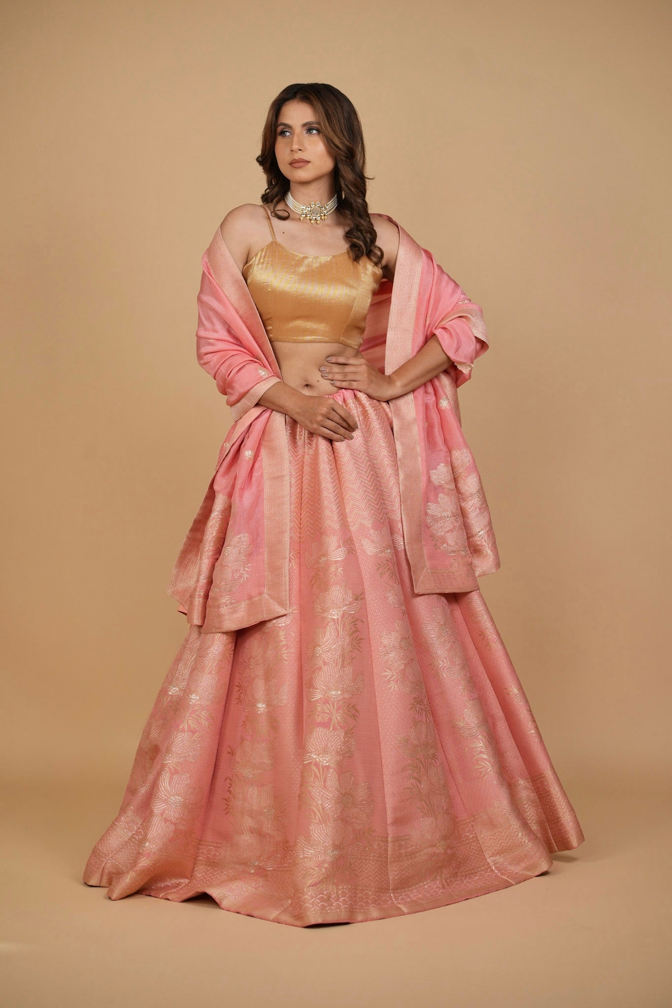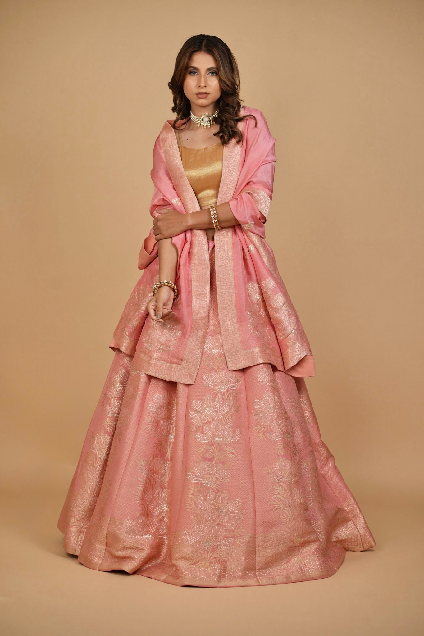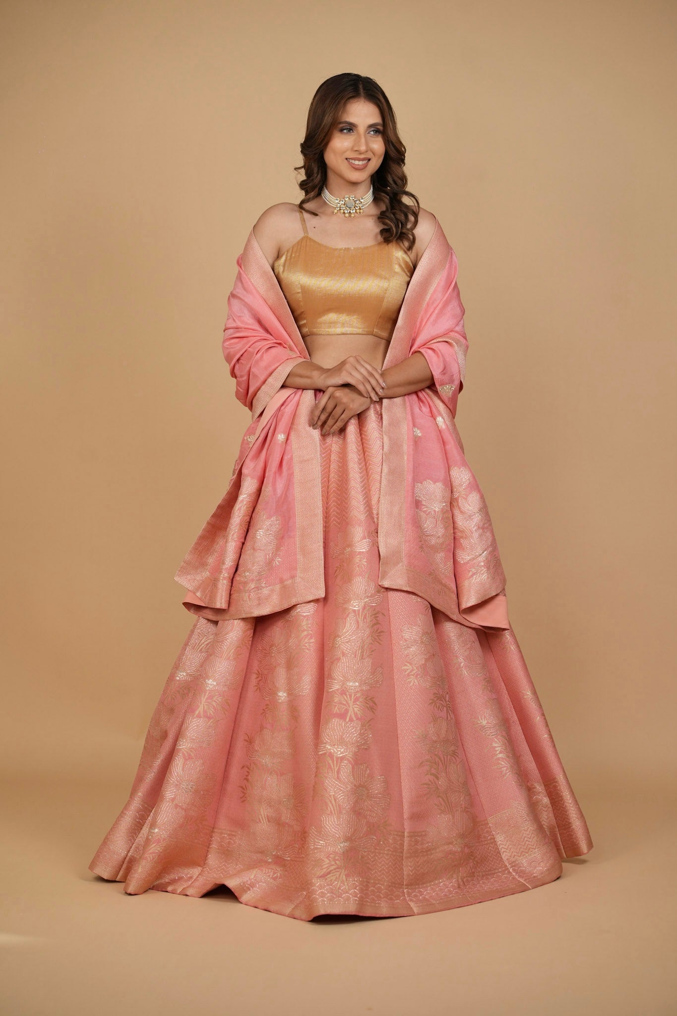 LIGHT PINK BANARASI LEHENGA WITH DUPATTA AND MONOTONE BLOUSE