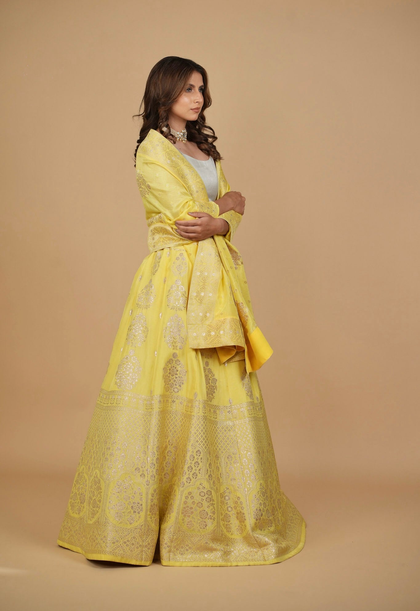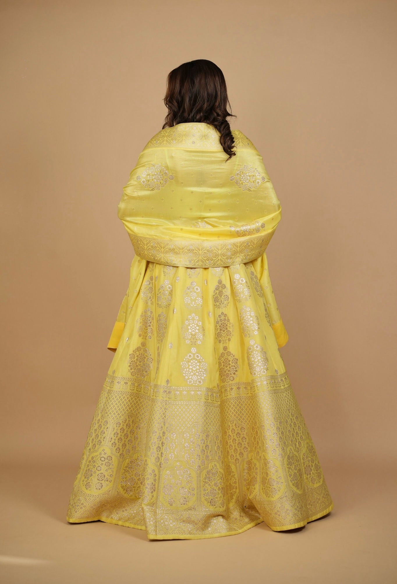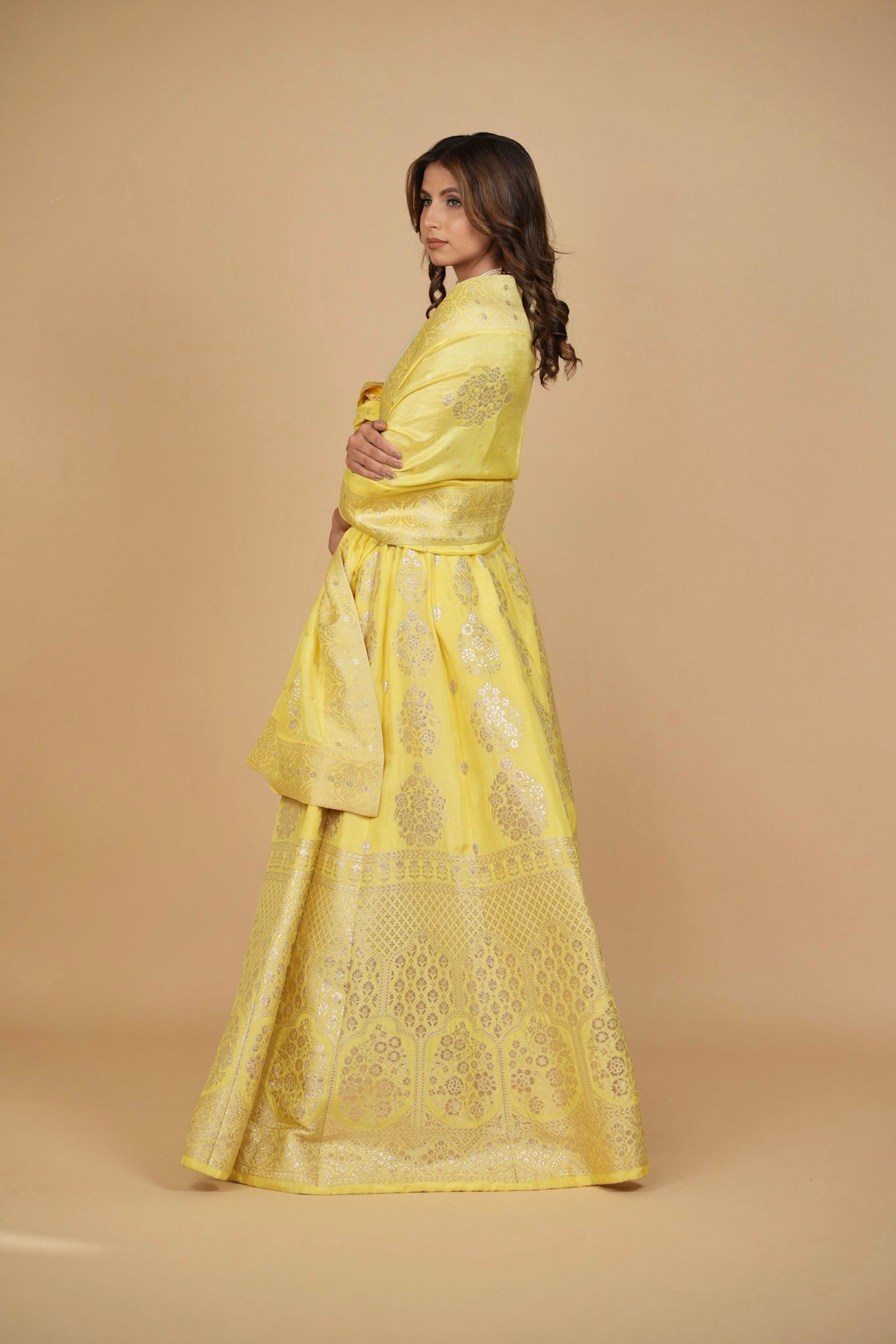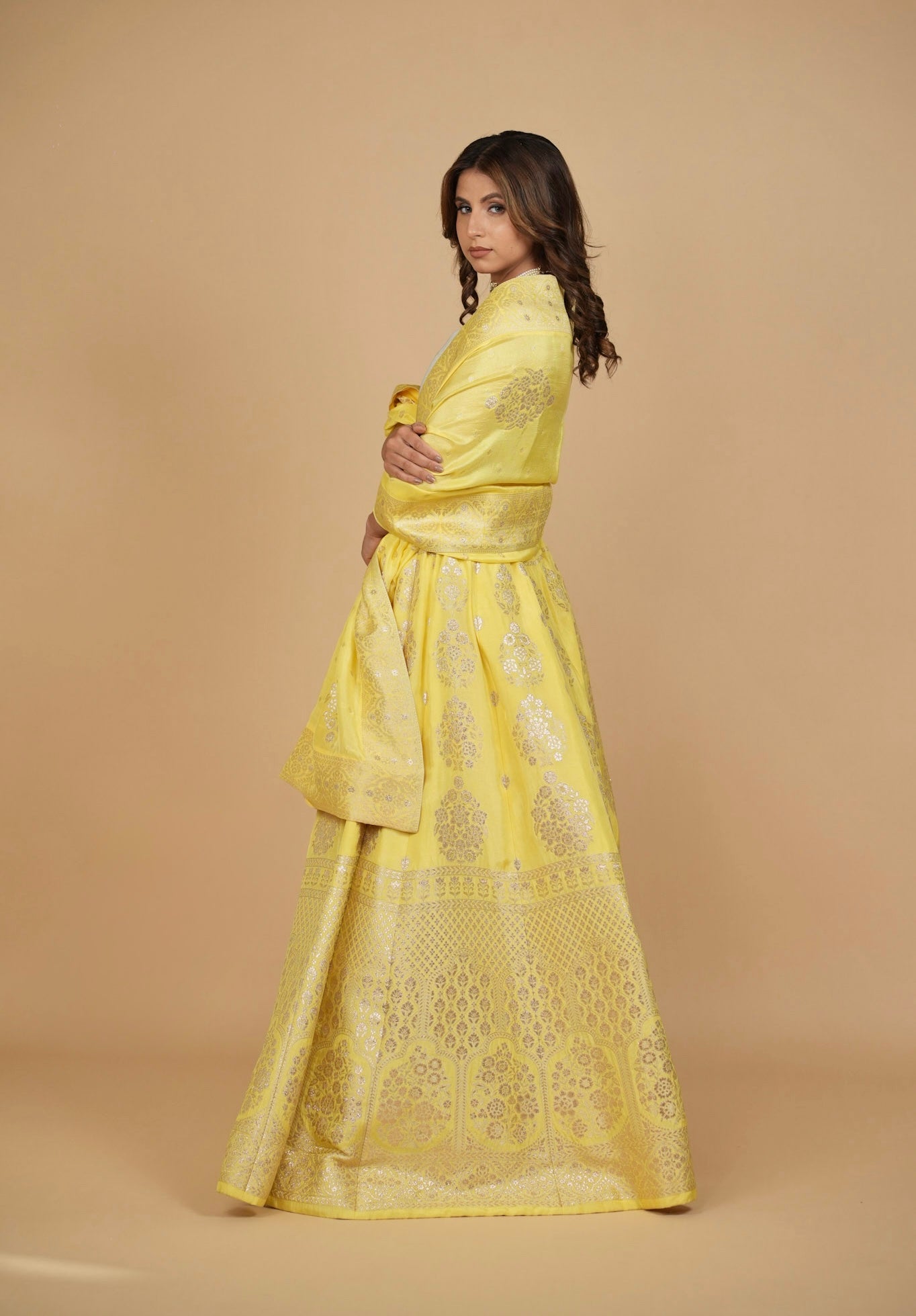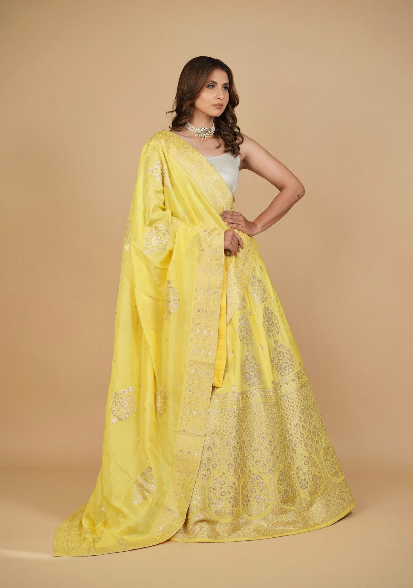 LIGHT YELLOW BANARASI LEHENGA WITH DUPATTA AND MONOTONE BLOUSE