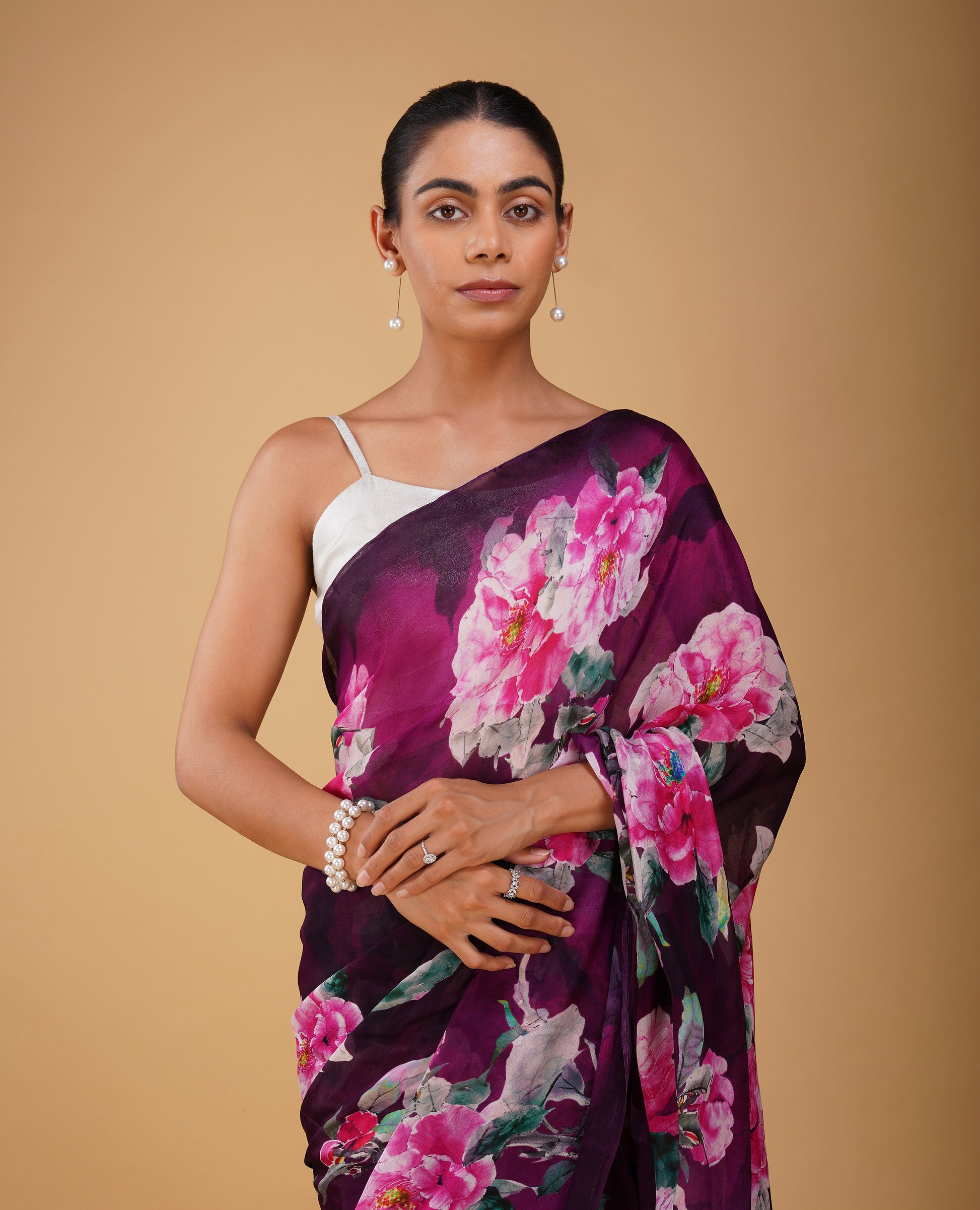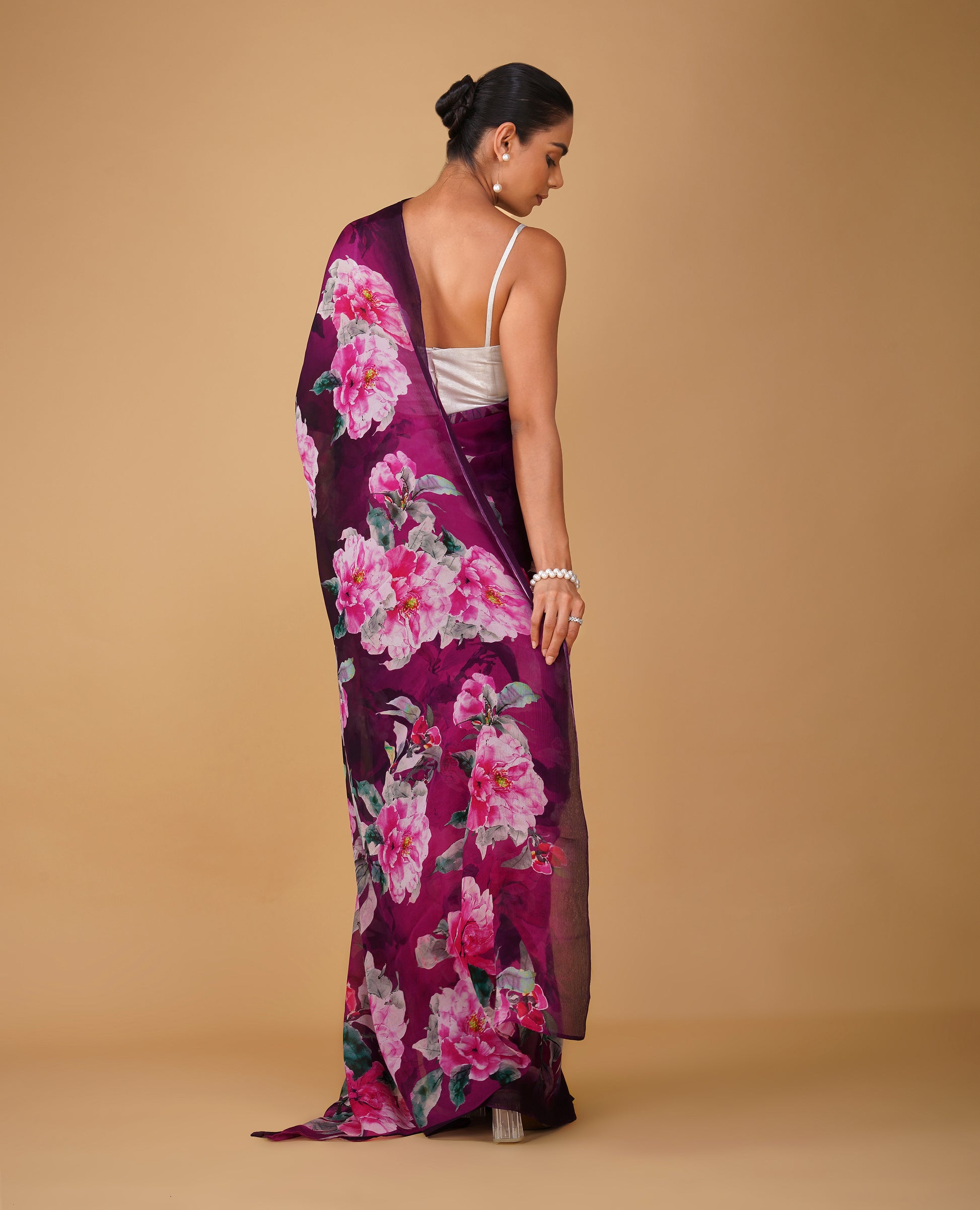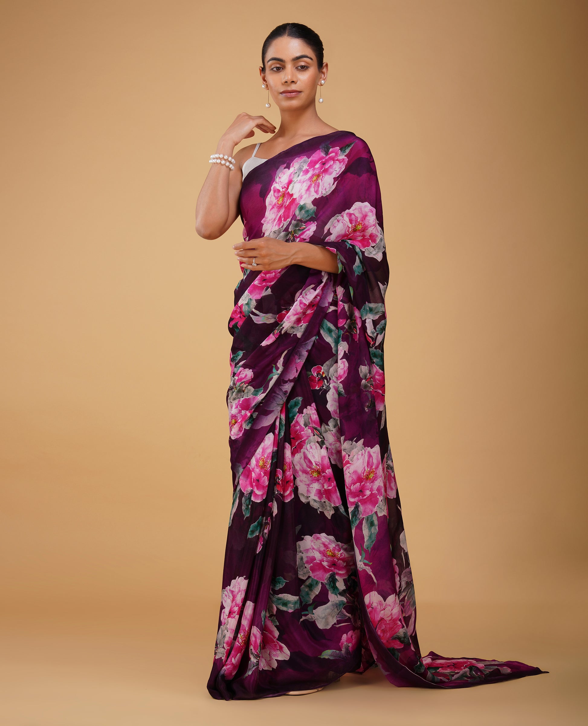 ( DELIVERY IN 20 DAYS ) MAGENTA & PURPLE FLORAL PRINTED CHINON SAREE WITH PLAIN CREPE BLOUSE