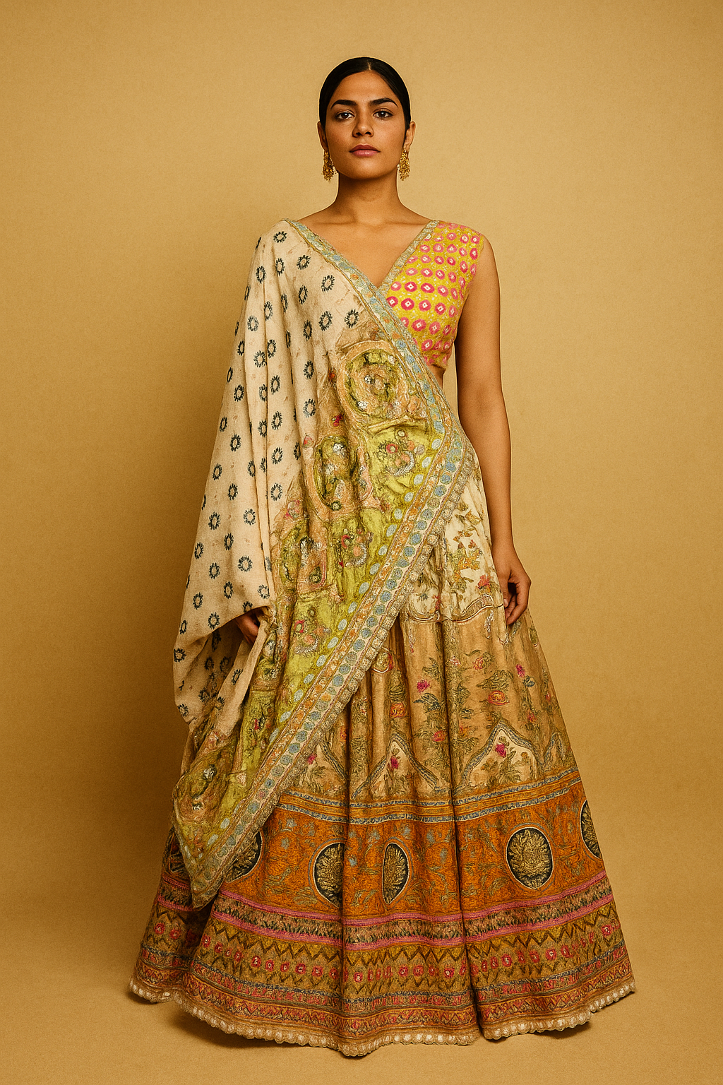 MULTICOLOR PRINTED SILK LEHENGA HIGHLIGHTED WITH PIPE WORK