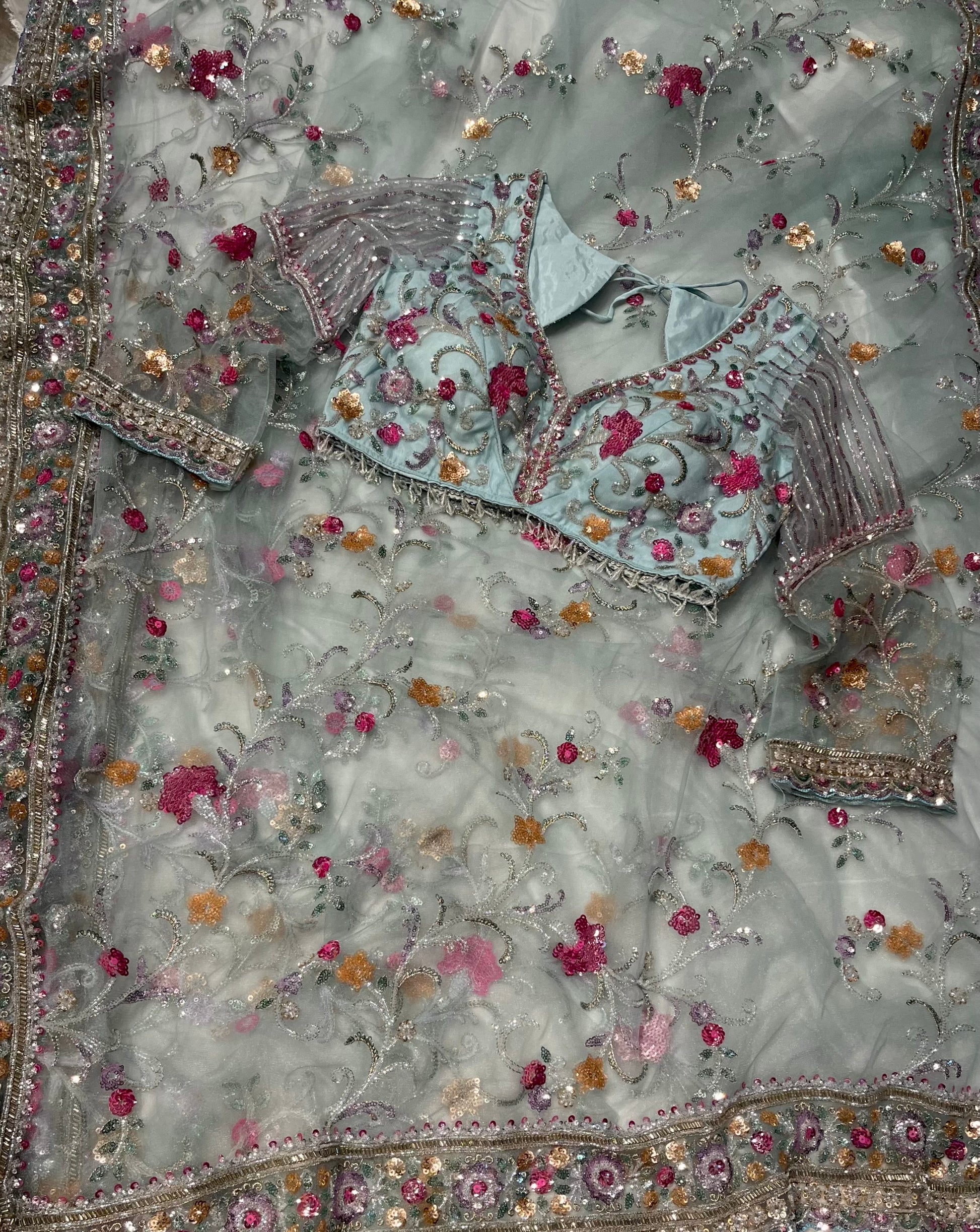 PASTEL BLUE NET SAREE EMBELLISHED WITH SEQUINS & CUTDANA WORK PAIRED WITH A READYMADE BLOUSE