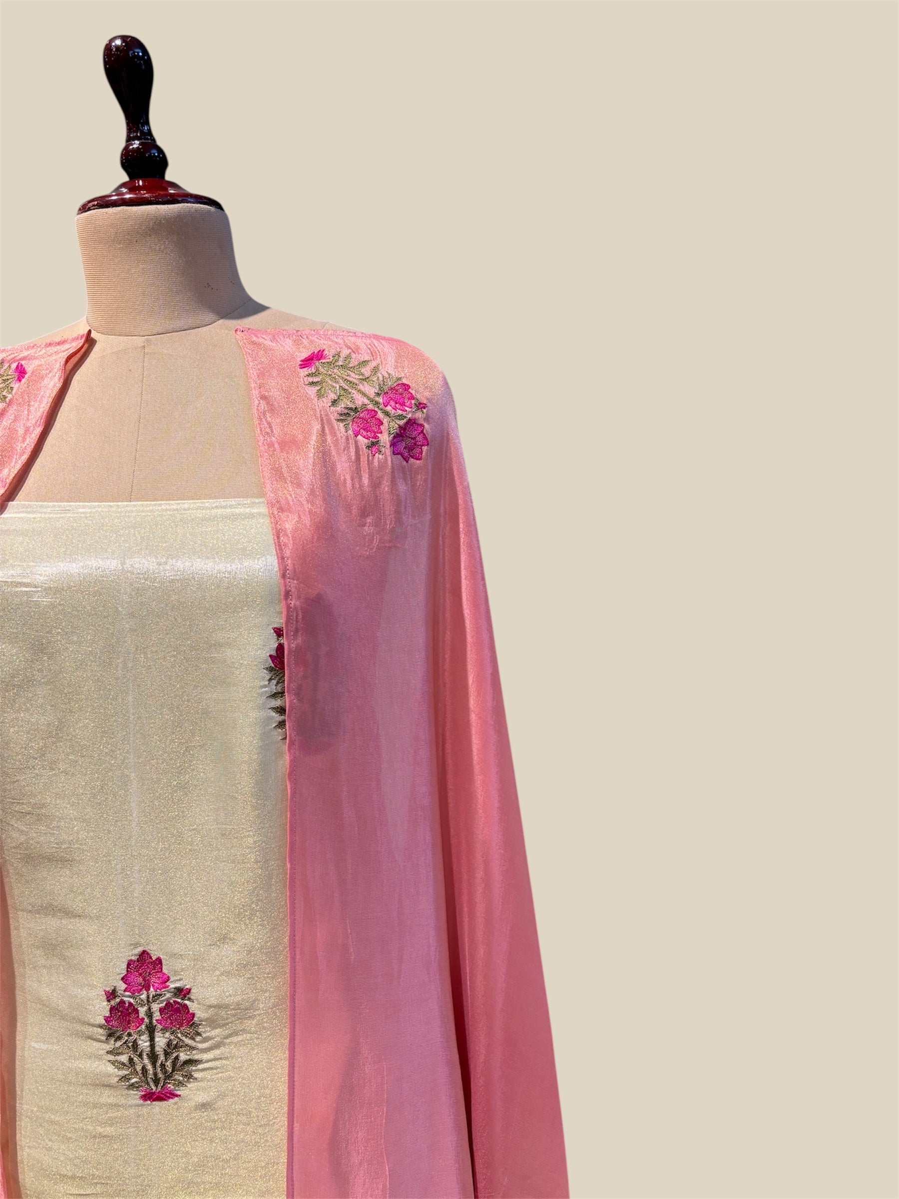 OFF-WHITE GOLD GEORGETTE TISSUE UNSTITCHED SUIT WITH MUGHAL EMBROIDERY & PEACH DUPATTA