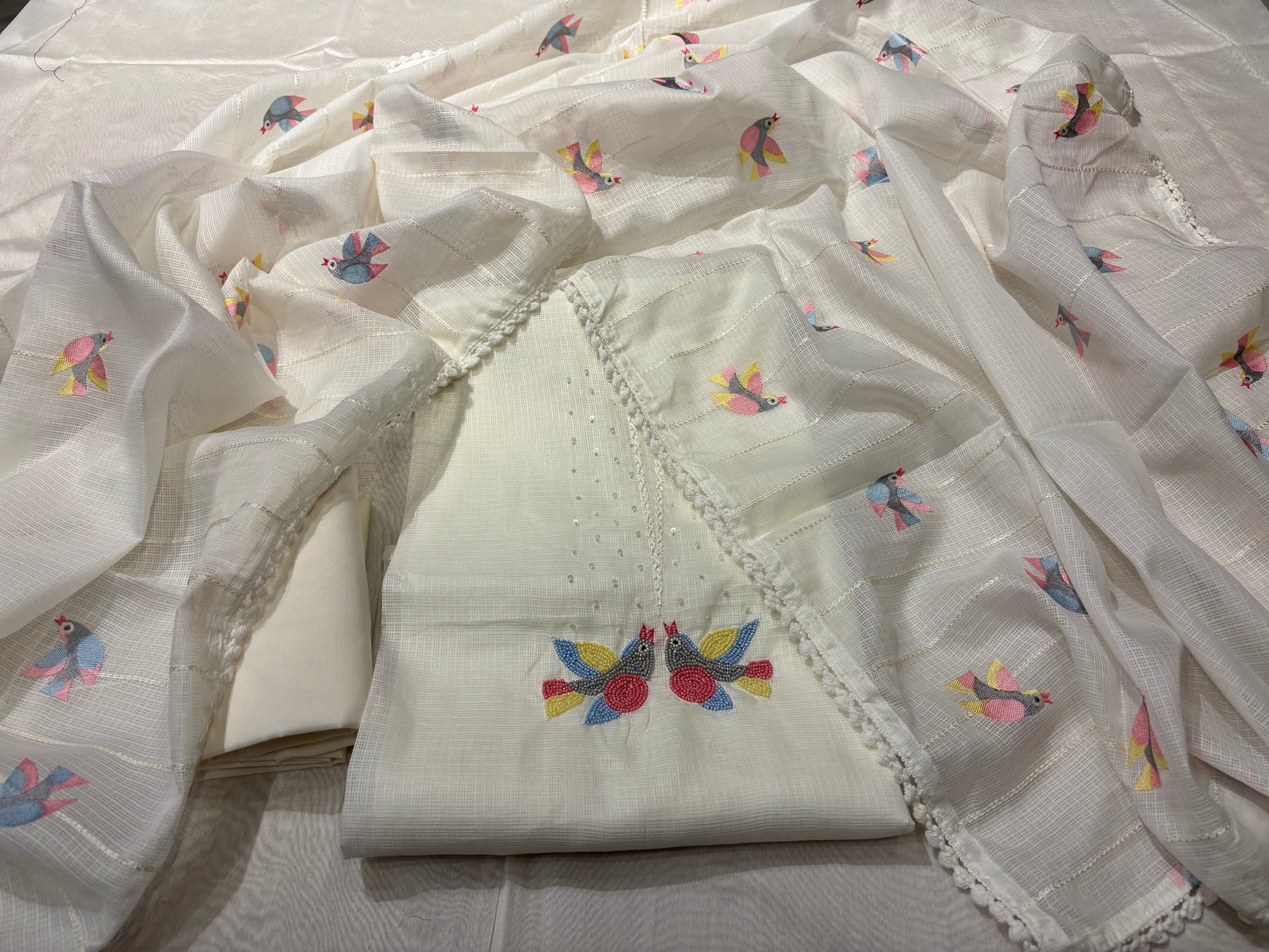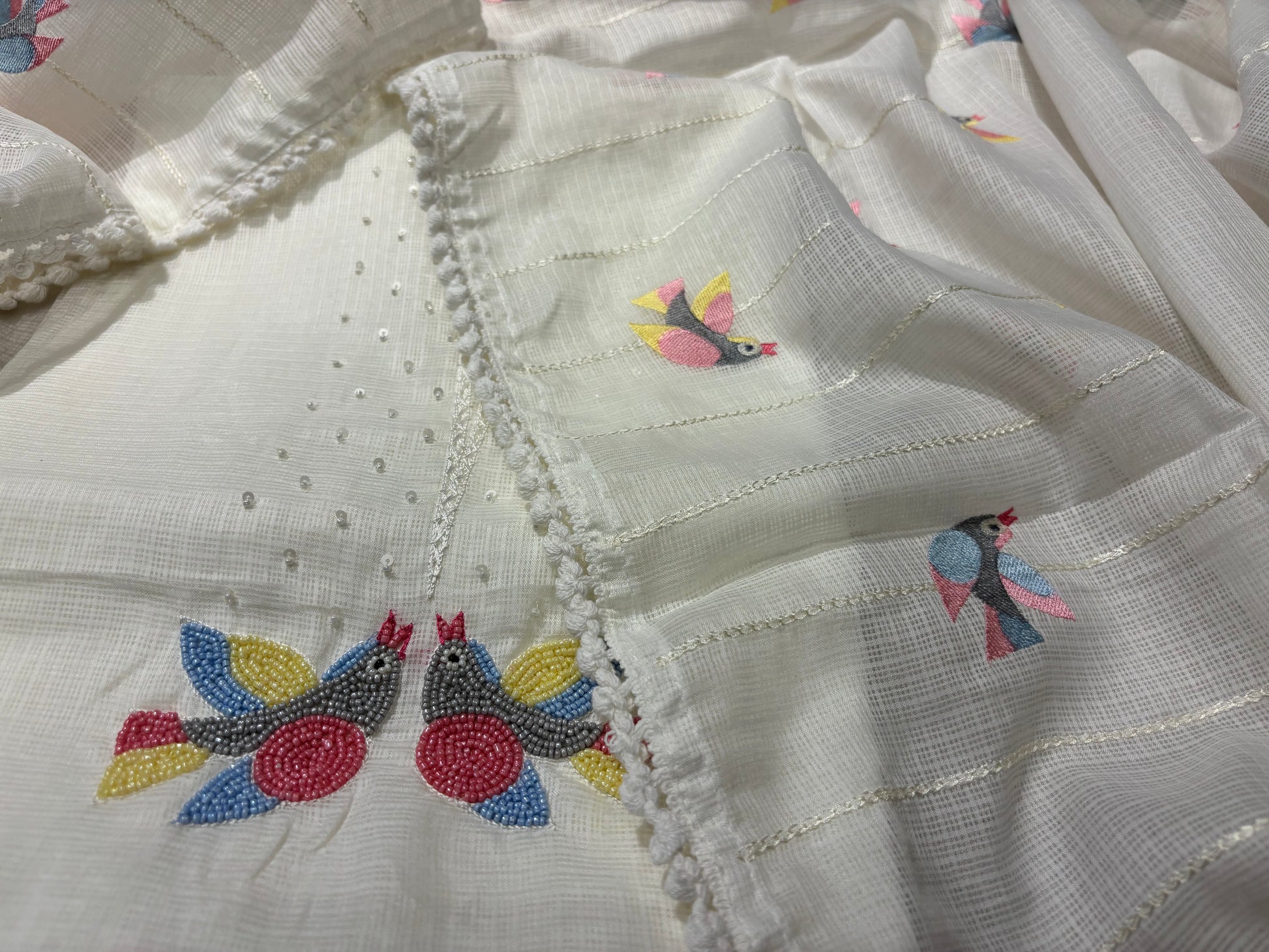 OFF WHITE KOTA DORIYA UNSTITCHED SUIT WITH RESHAM EMBROIDERED BIRD MOTIFS DUPATTA AND BEAD WORK KURTA