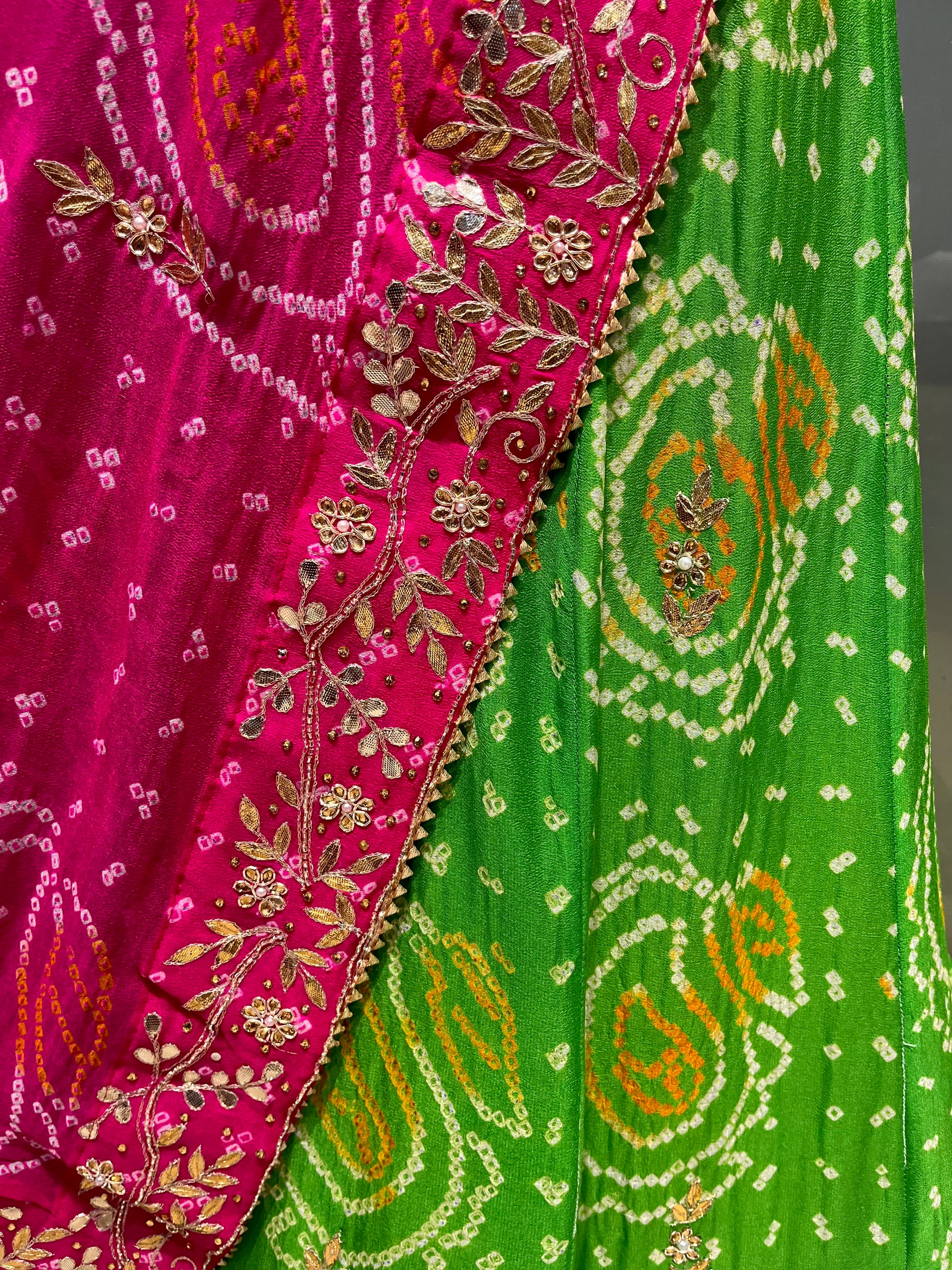 PARROT GREEN AND RANI PINK PURE GEORGETTE OJARIYA LEHENGA WITH GOTA PATTI WORK