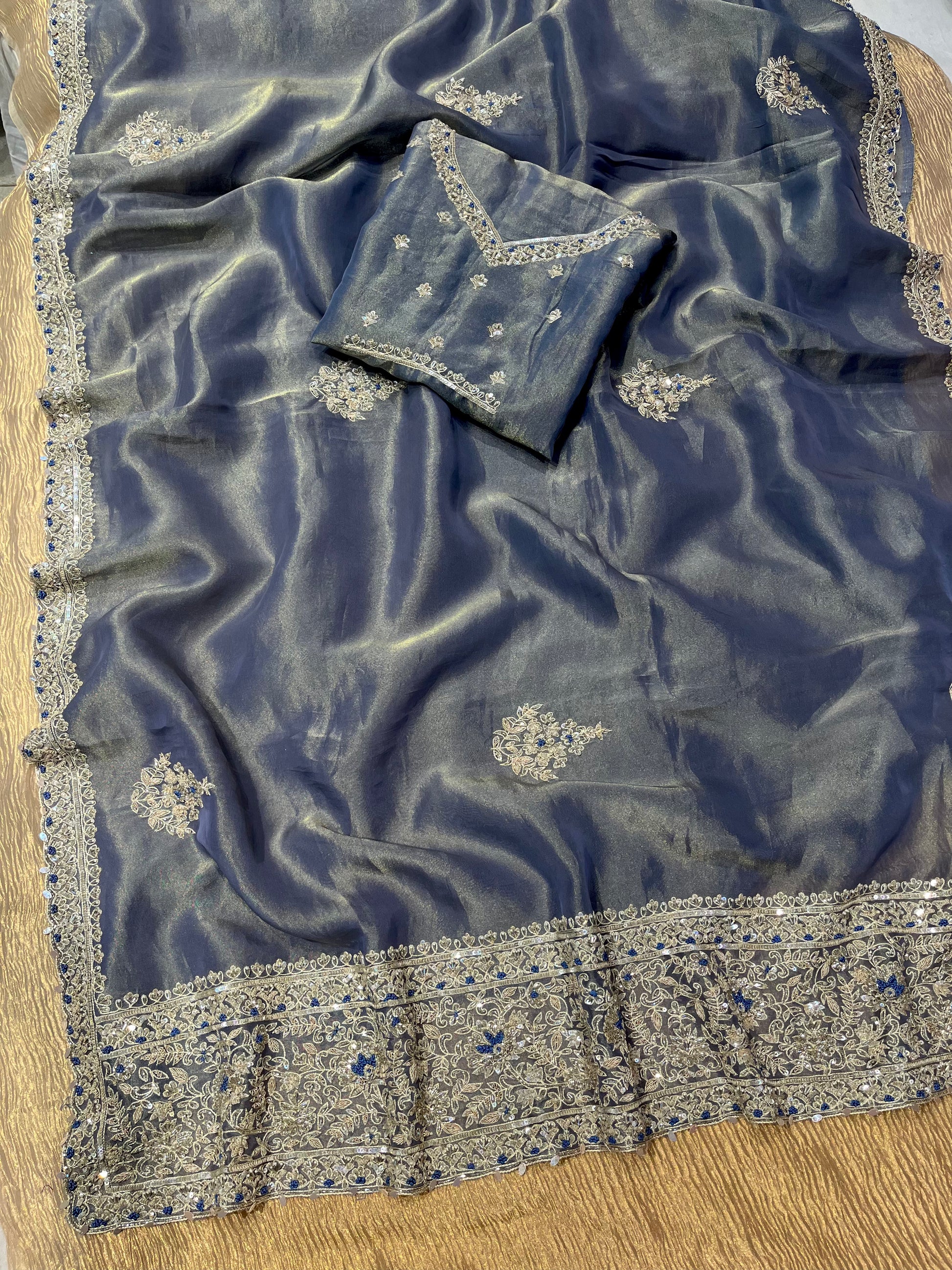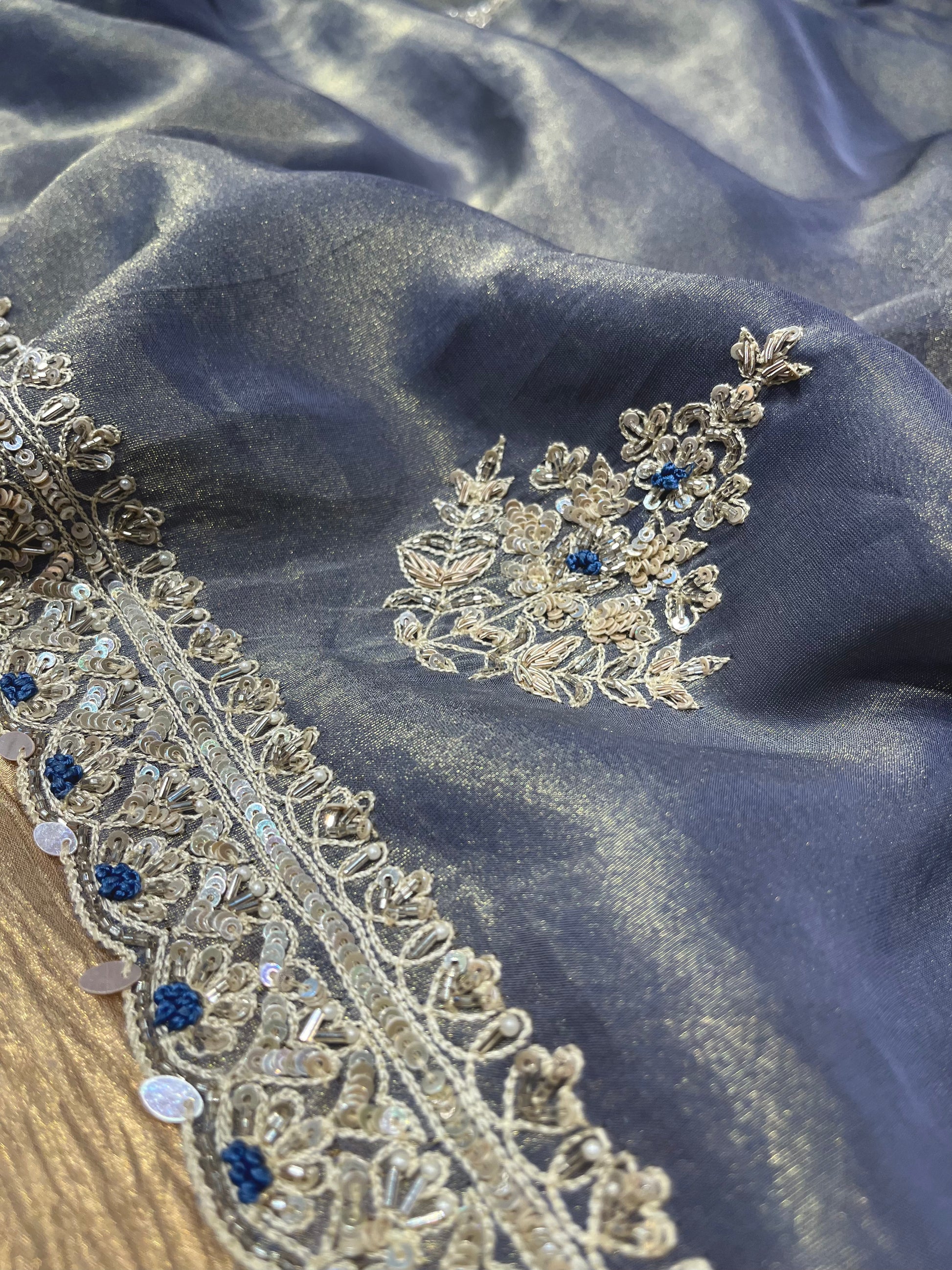 POWDER BLUE COLOR TISSUE EMBROIDERED SAREE EMBELLISHED WITH SEQUINS, CUTDANA AND PEARL WORK
