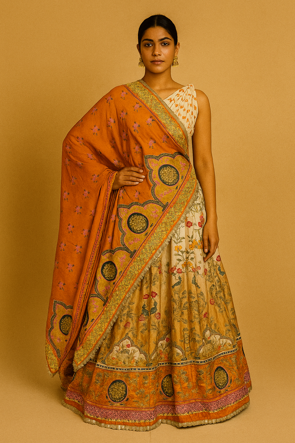 Playful yet poised, this Printed Silk Lehenga is a beautiful fusion of modern artistry and timeless elegance. The fluid silk fabric enhances the vibrance of the print, giving it a graceful fall and natural sheen. Subtly highlighted with delicate pipe work, the lehenga carries a refined texture that elevates its overall charm. Perfect for festive occasions, weddings, or celebratory evenings, this ensemble captures the essence of effortless sophistication.