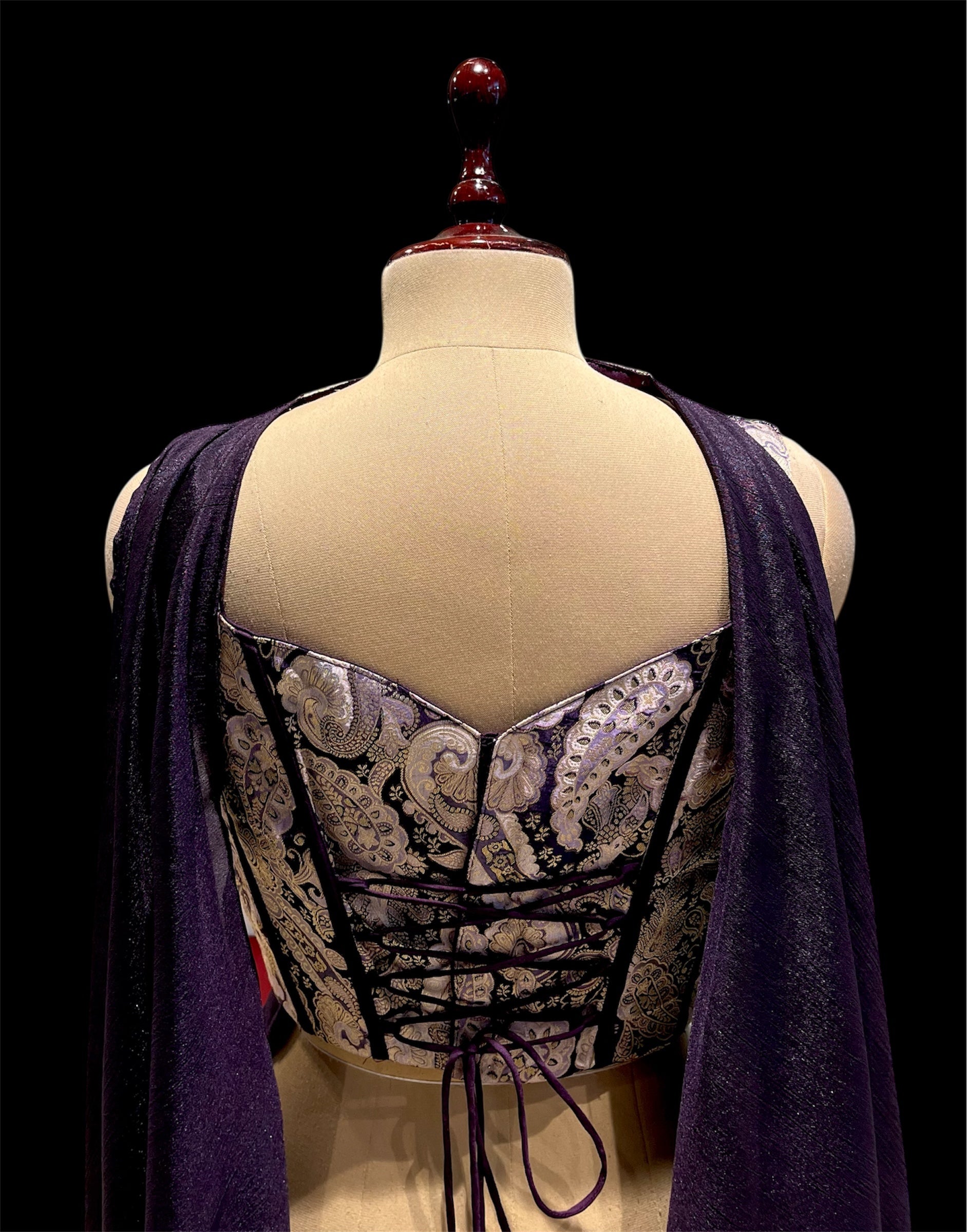 Style: Contemporary palazzo set with structured embellished corset blouse