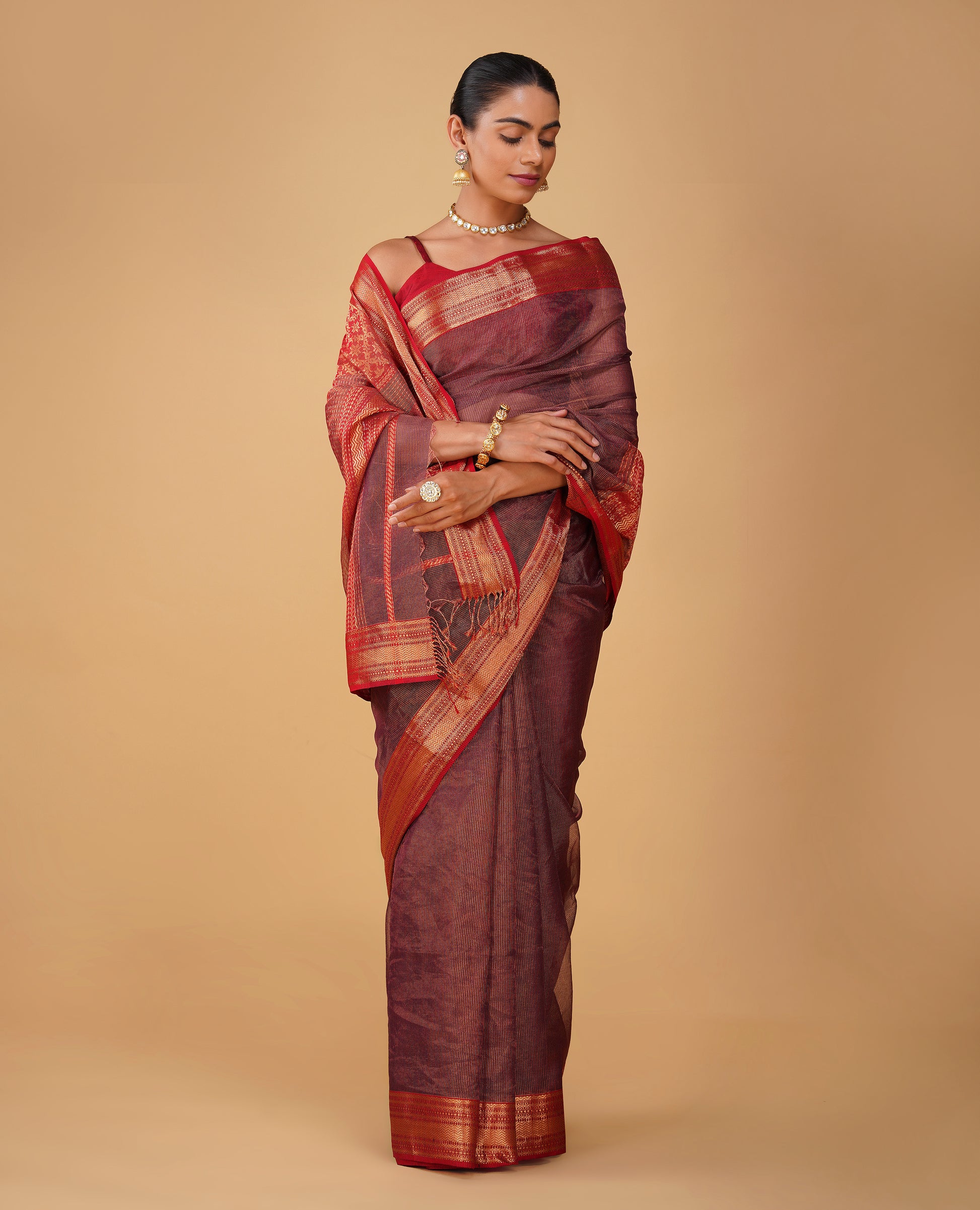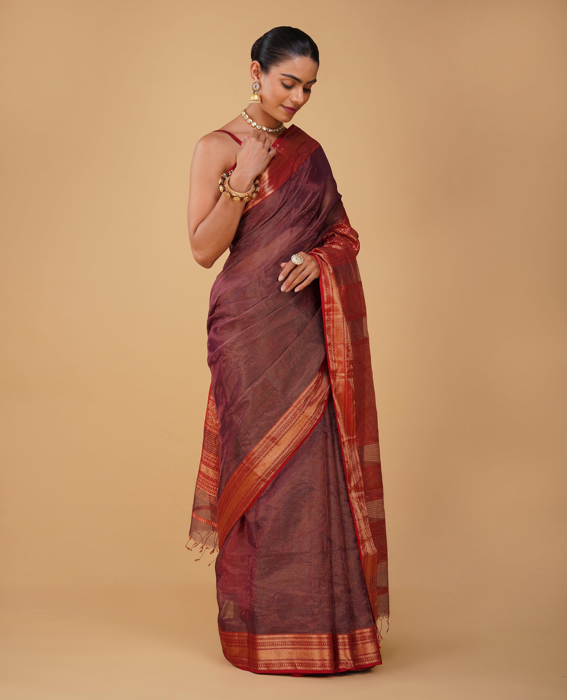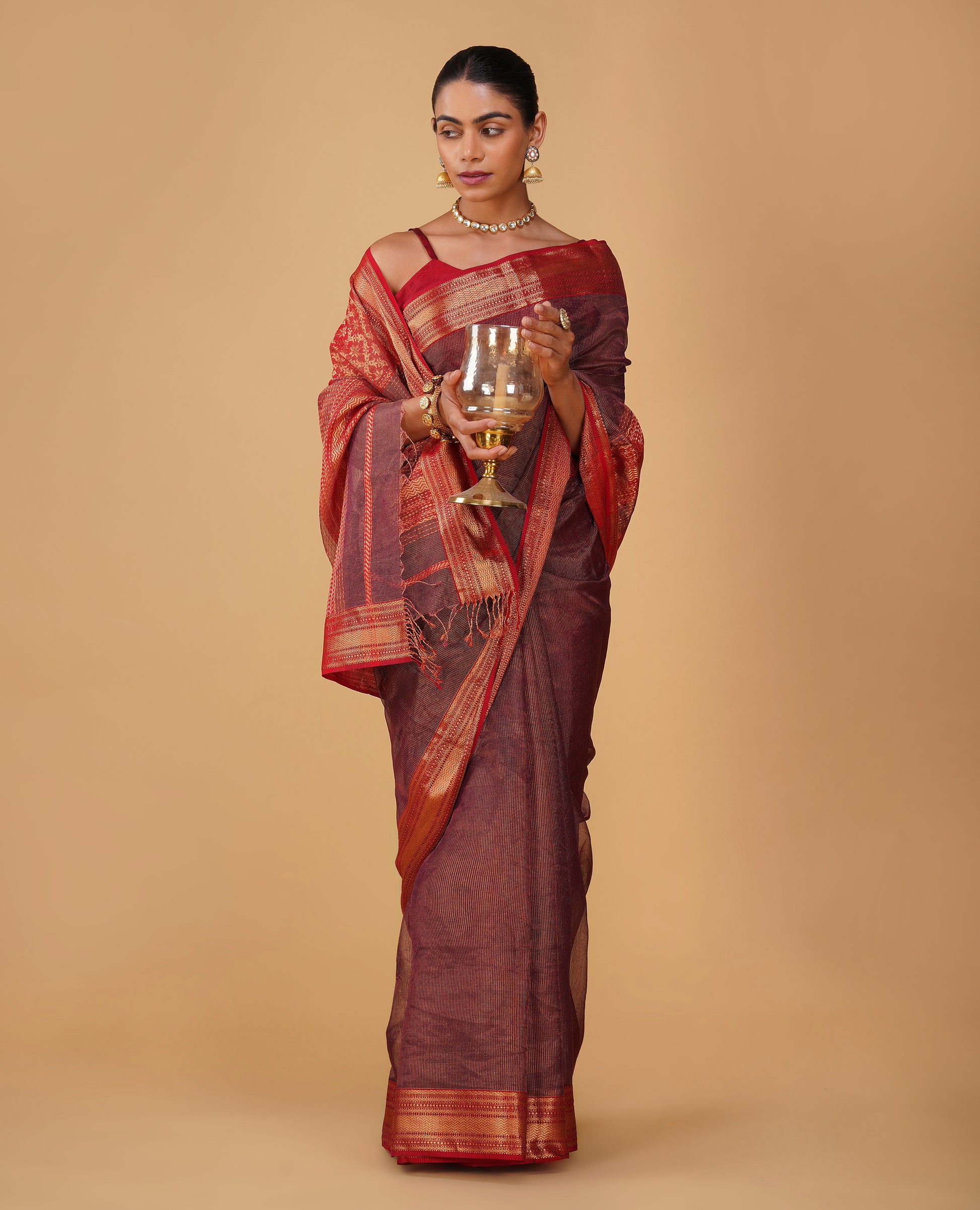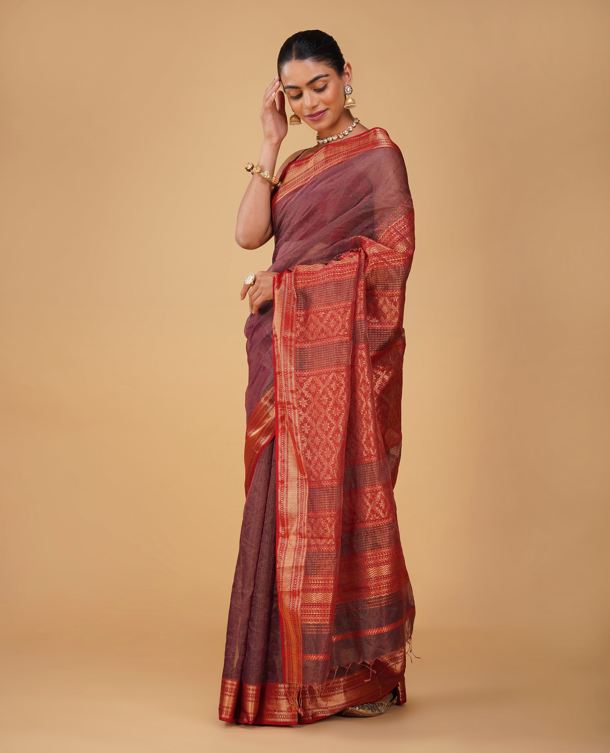 PURPLE TISSUE CHECKS MAHESHWARI SAREE WITH RED CONTRAST BORDER, PALLA & BLOUSE