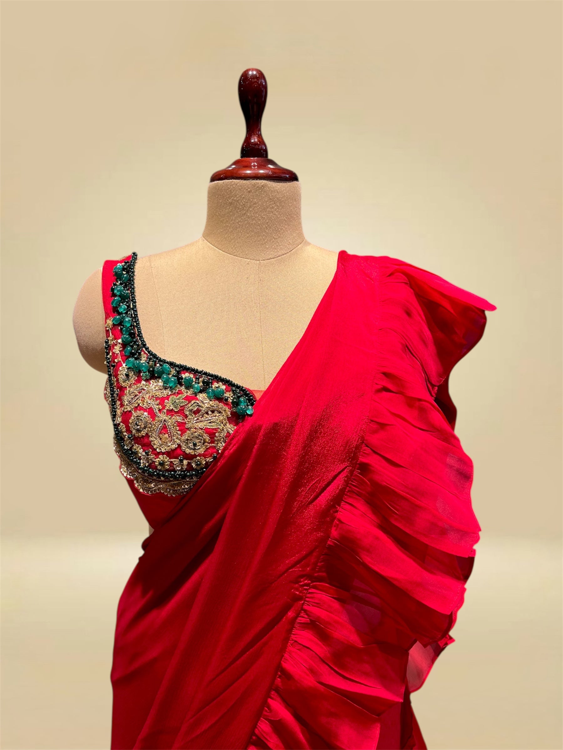 Bold, feminine, and effortlessly glamorous, this Raspberry Colour Chinon Ruffle Saree is designed to make a statement. Crafted from flowy chinon fabric, the saree features soft cascading ruffles that add movement and contemporary flair to its silhouette. Paired with a readymade blouse exquisitely embellished with sequins and pitta work, the ensemble exudes refined sparkle and artisanal craftsmanship. The fusion of fluid drapes and detailed embellishment creates a look that is both modern and elegant.