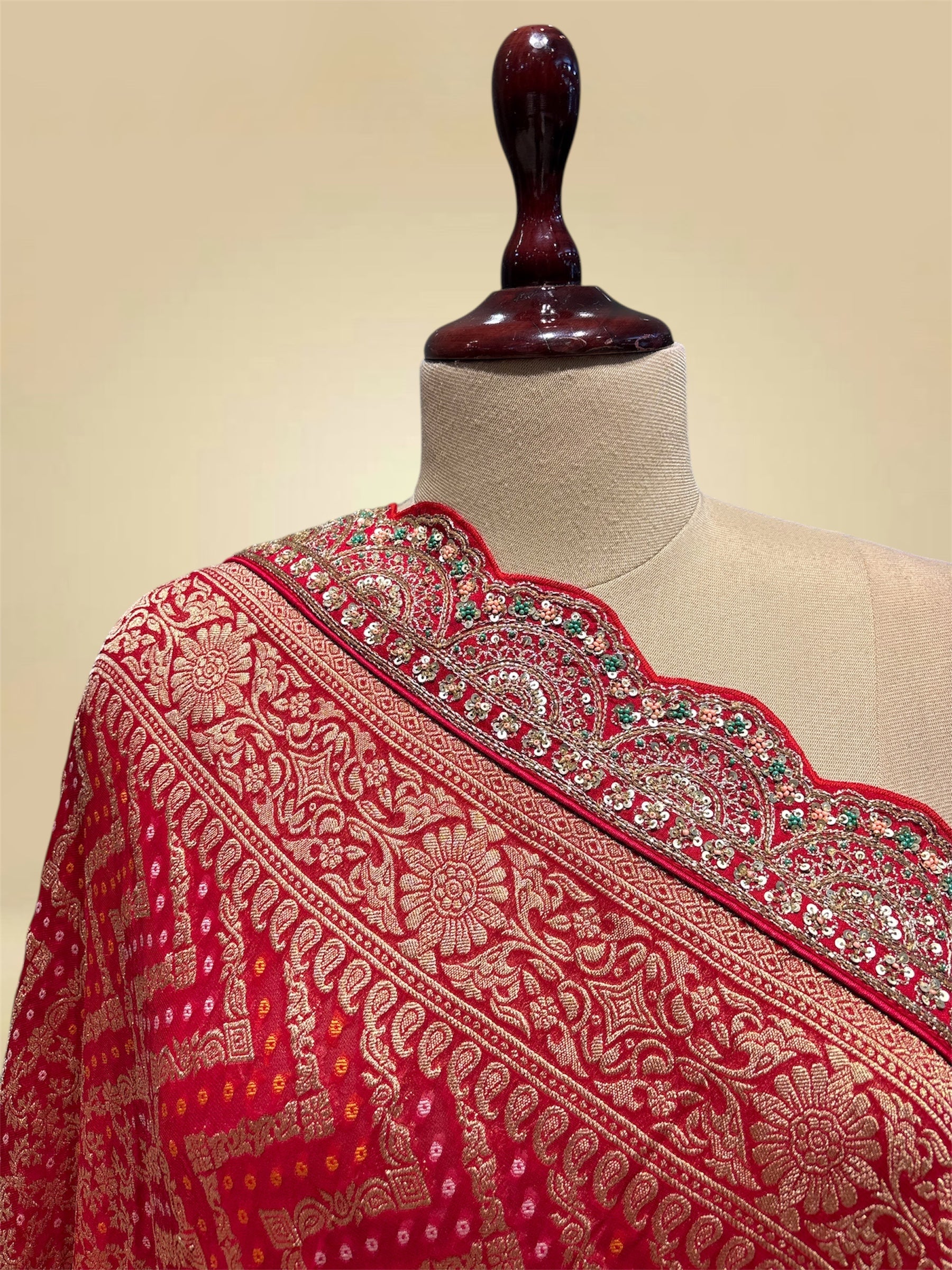 RED BANDHANI KHADDI DUPATTA WITH HAND-EMBROIDERED BORDER