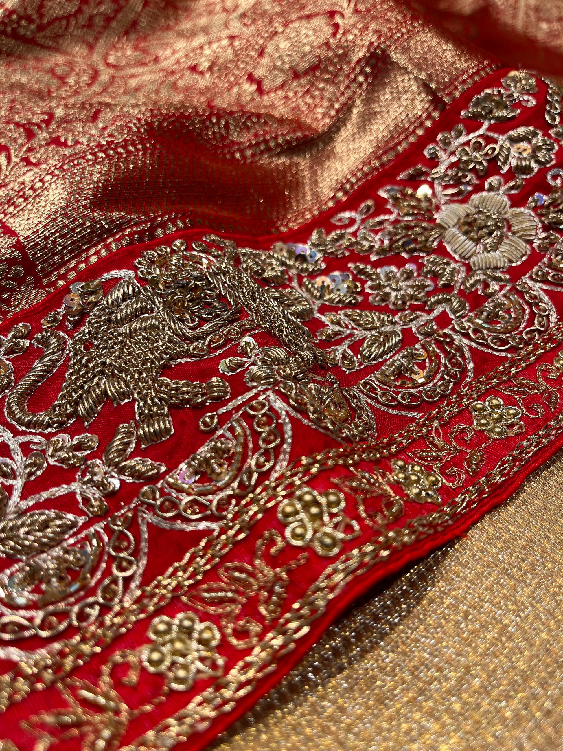 RED COLOUR HAND EMBROIDERED BANARASI SAREE EMBELLISHED WITH ZARDOZI WORK