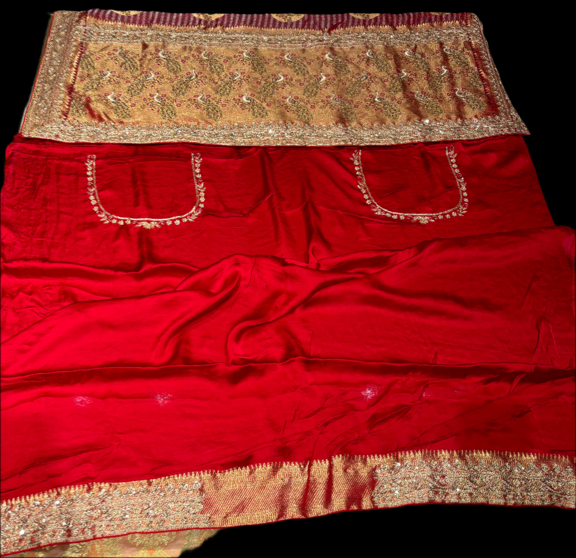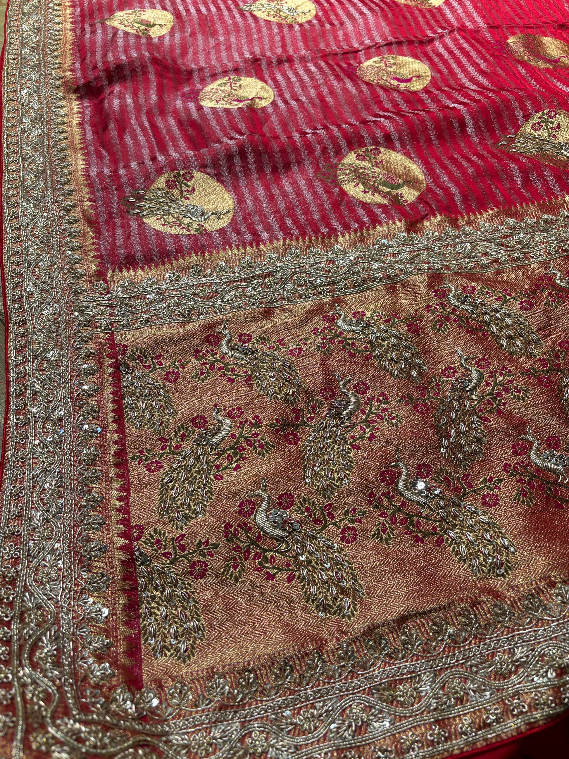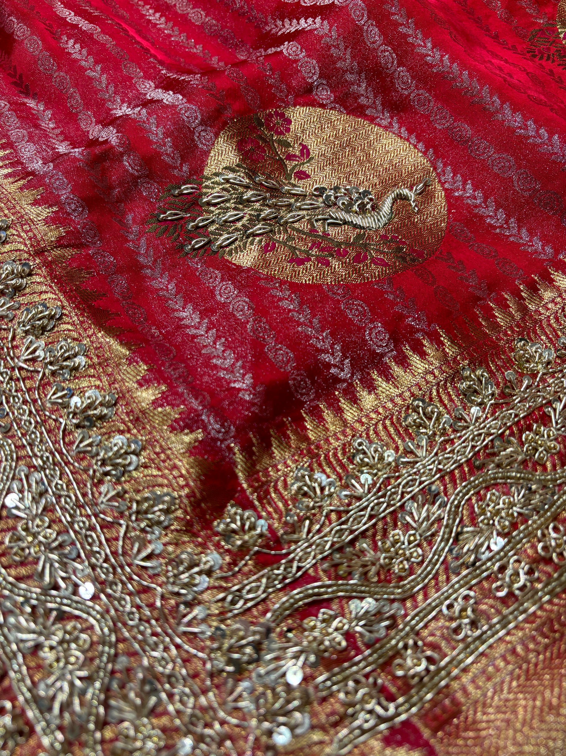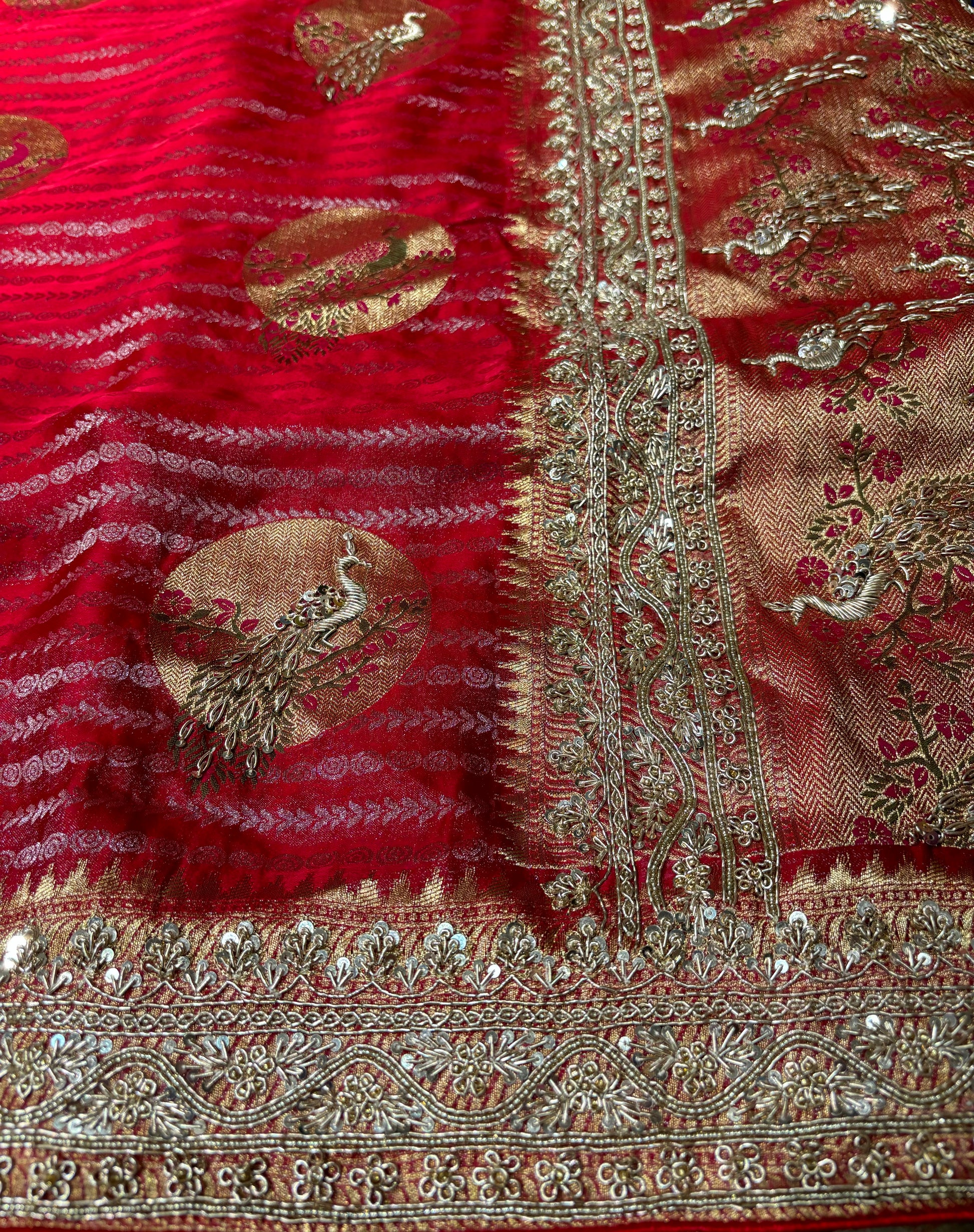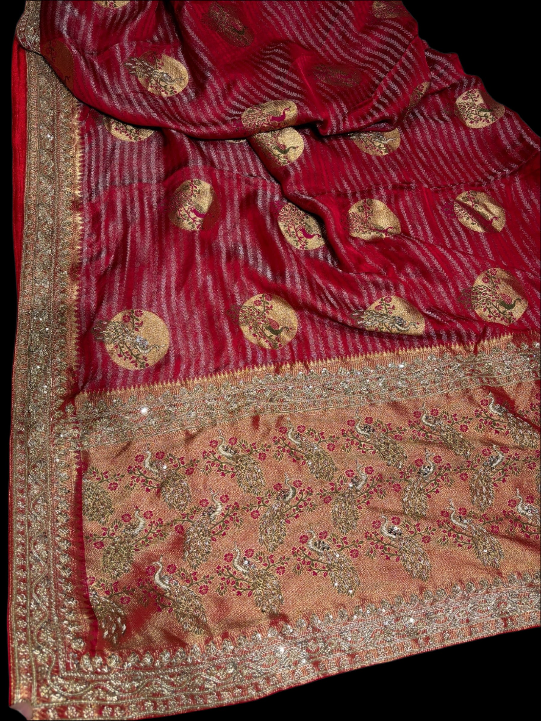 (Deliver in 20 Days) RED CREPE TISSUE BRIDAL SAREE WITH ZARDOZI BORDER AND PEACOCK MOTIFS
