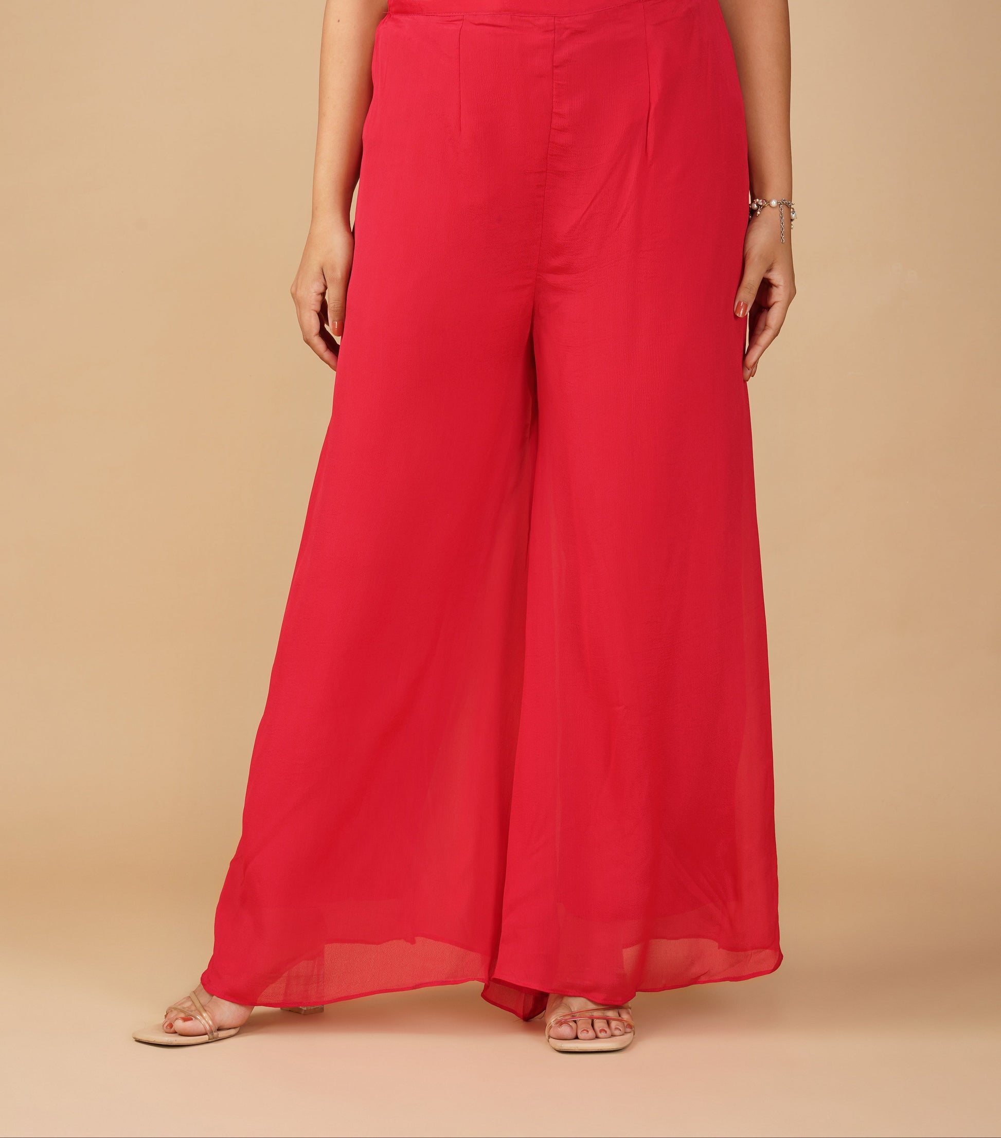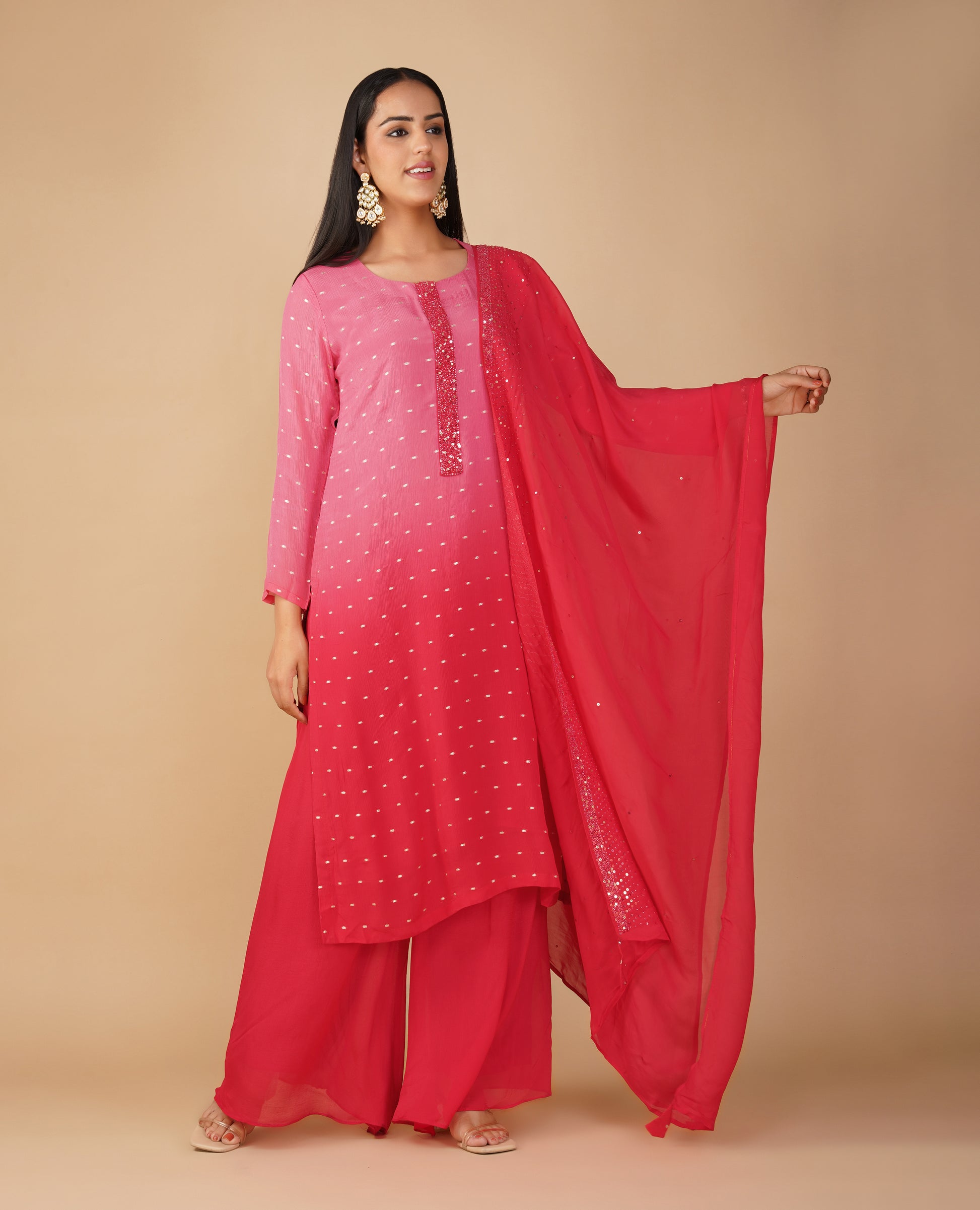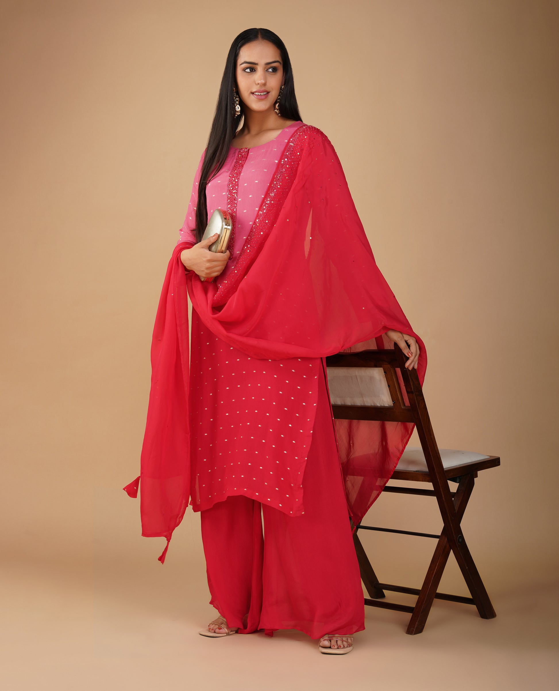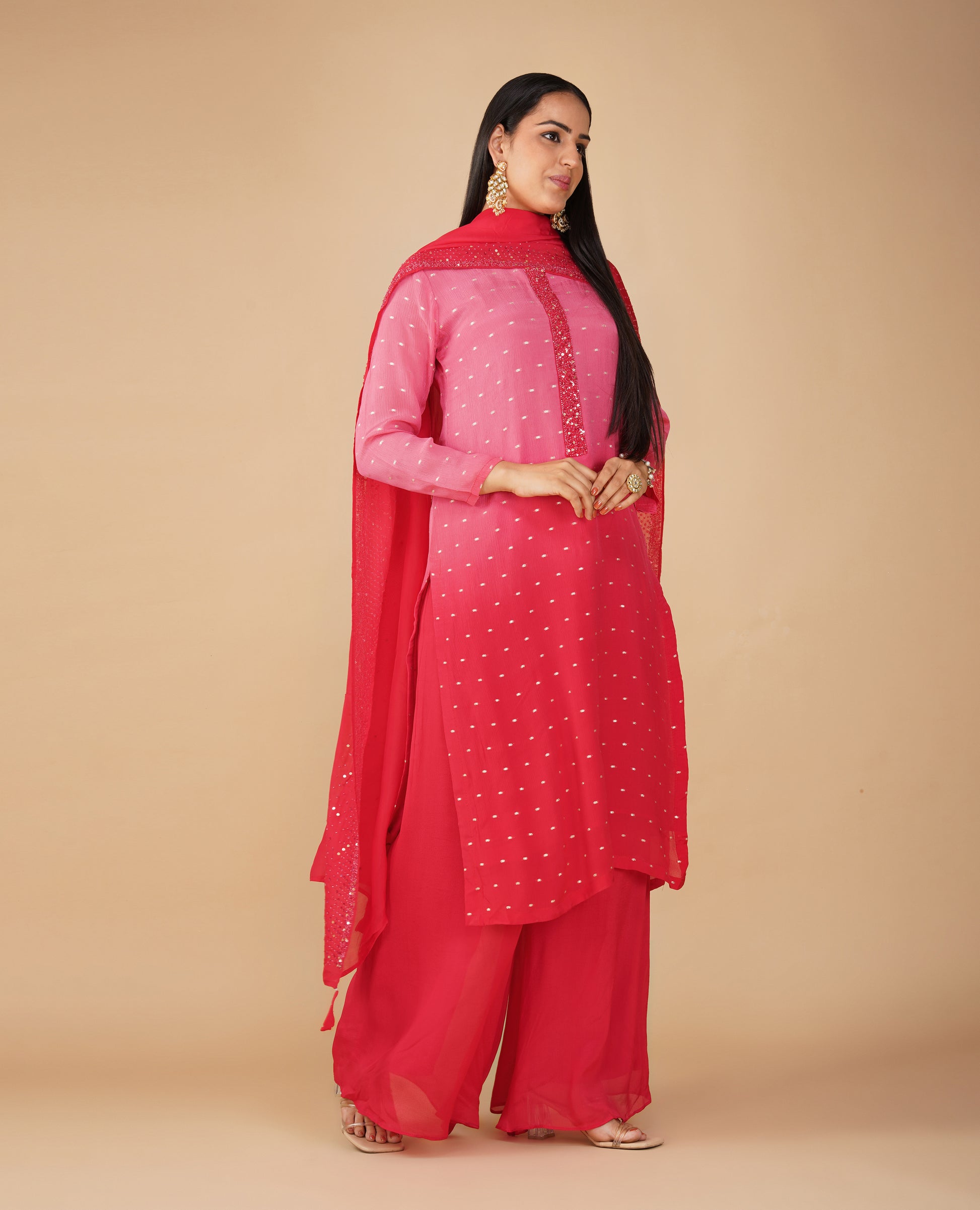(DELIVERY TIME 20 DAYS) RED-SHADED CHINON SUIT WITH ZARI WEAVE MOTIFS, SEQUIN EMBROIDERY, PALAZZO & DUPATTA
