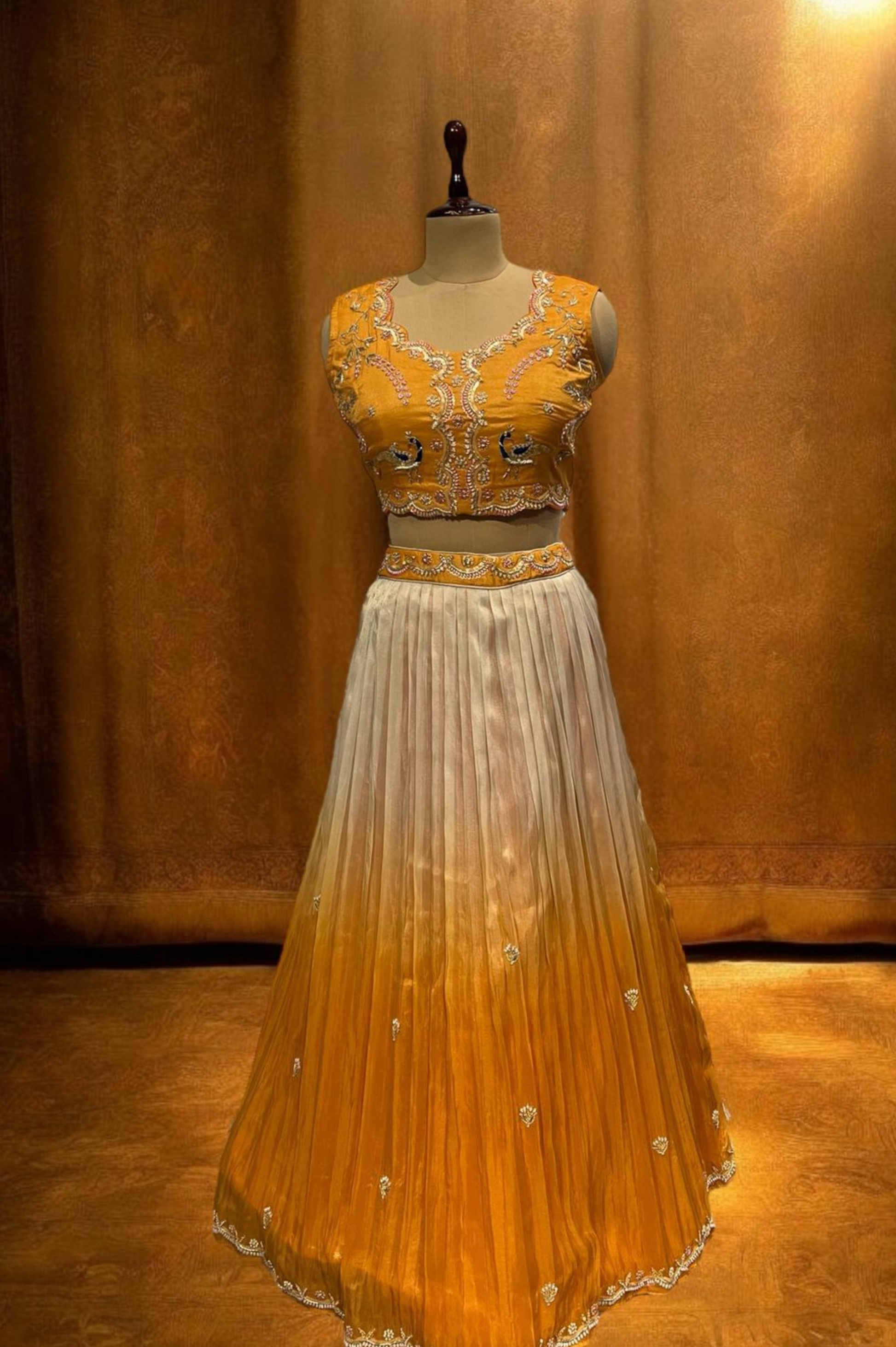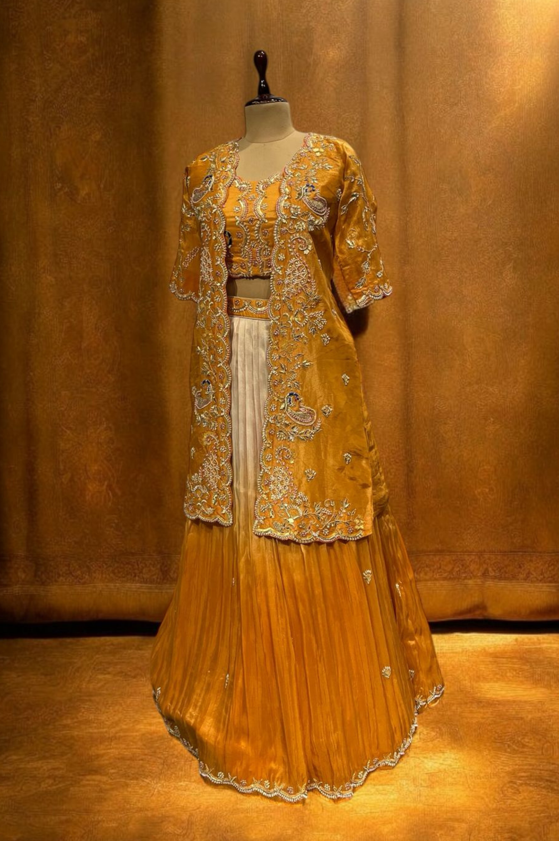Step into timeless elegance with this luxurious Banarasi Tissue Lehenga Set in a stunning mustard hue. The ensemble features a beautifully structured pleated lehenga paired with an intricately hand-embroidered short jacket and blouse. Adorned with exquisite zardosi work, the jacket boasts detailed motifs including a regal peacock and delicate florals, embellished with pearls, sequins, stones, and metallic threadwork.