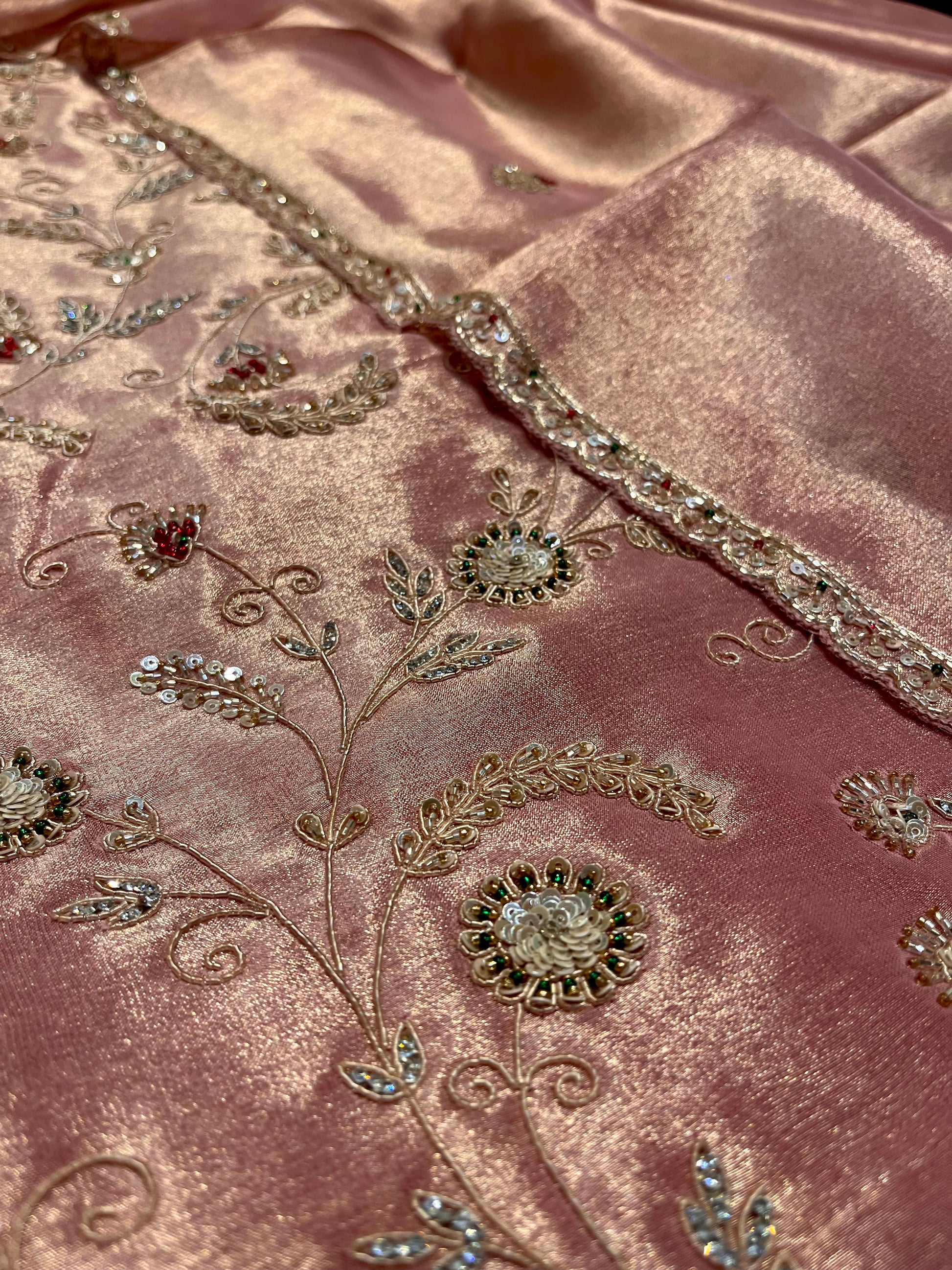 ROSE GOLD COLOUR PURE TISSUE EMBROIDERED UNSTITCHED SUIT WITH ZARDOZI & BEAD WORK (DELIVERY IN 20 DAYS)