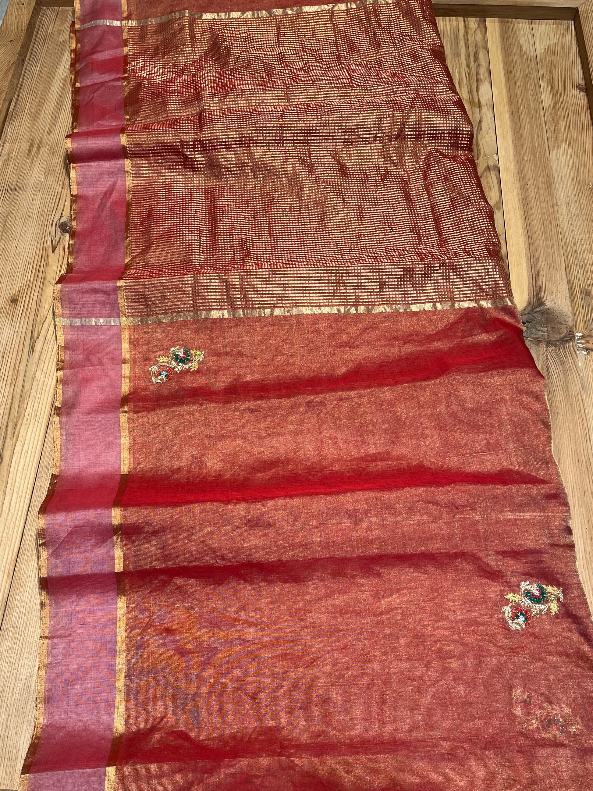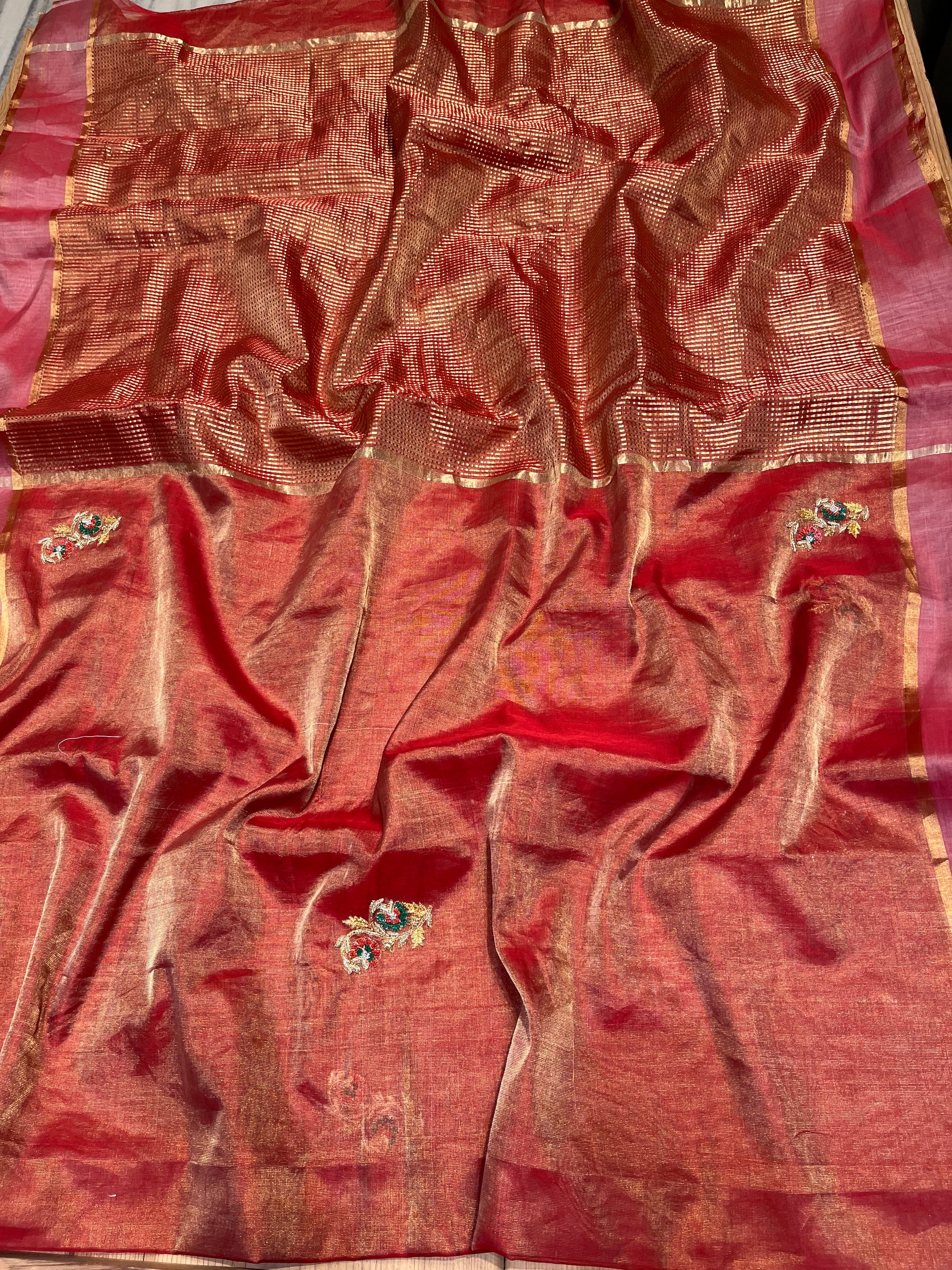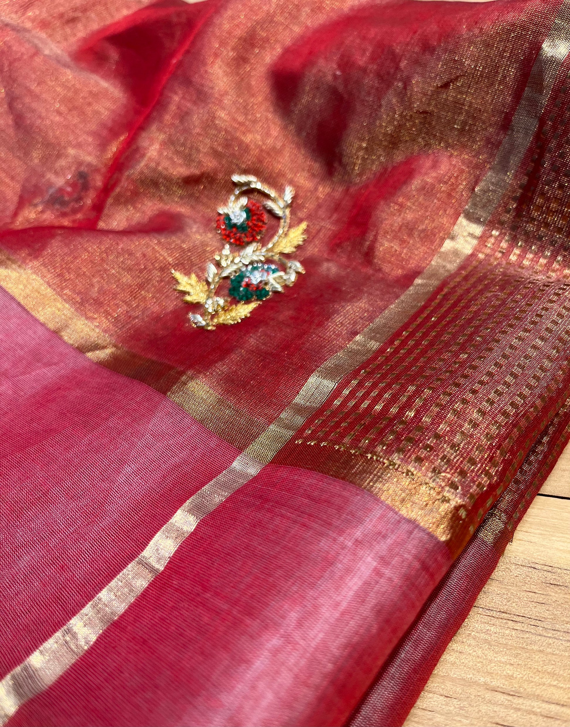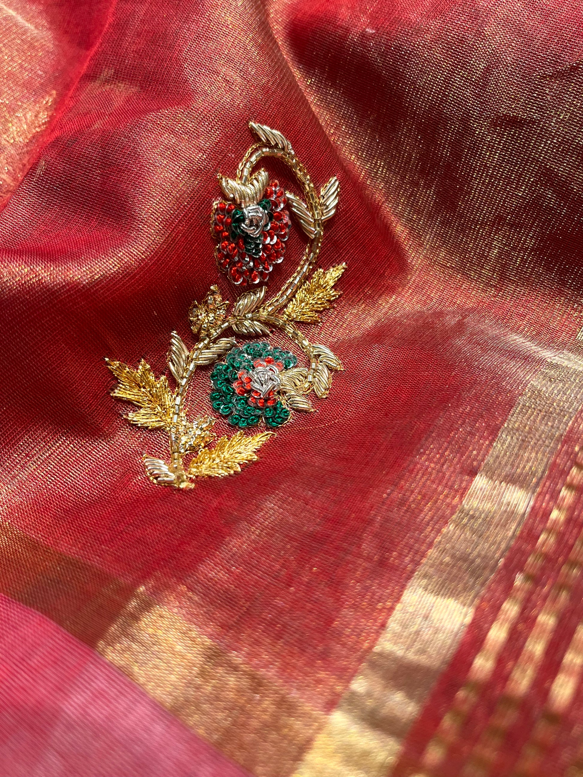 RUST COLOUR CHANDERI TISSUE HAND EMBROIDERED SAREE EMBELLISHED EITH SEQUINS & ZARDOZI WORK