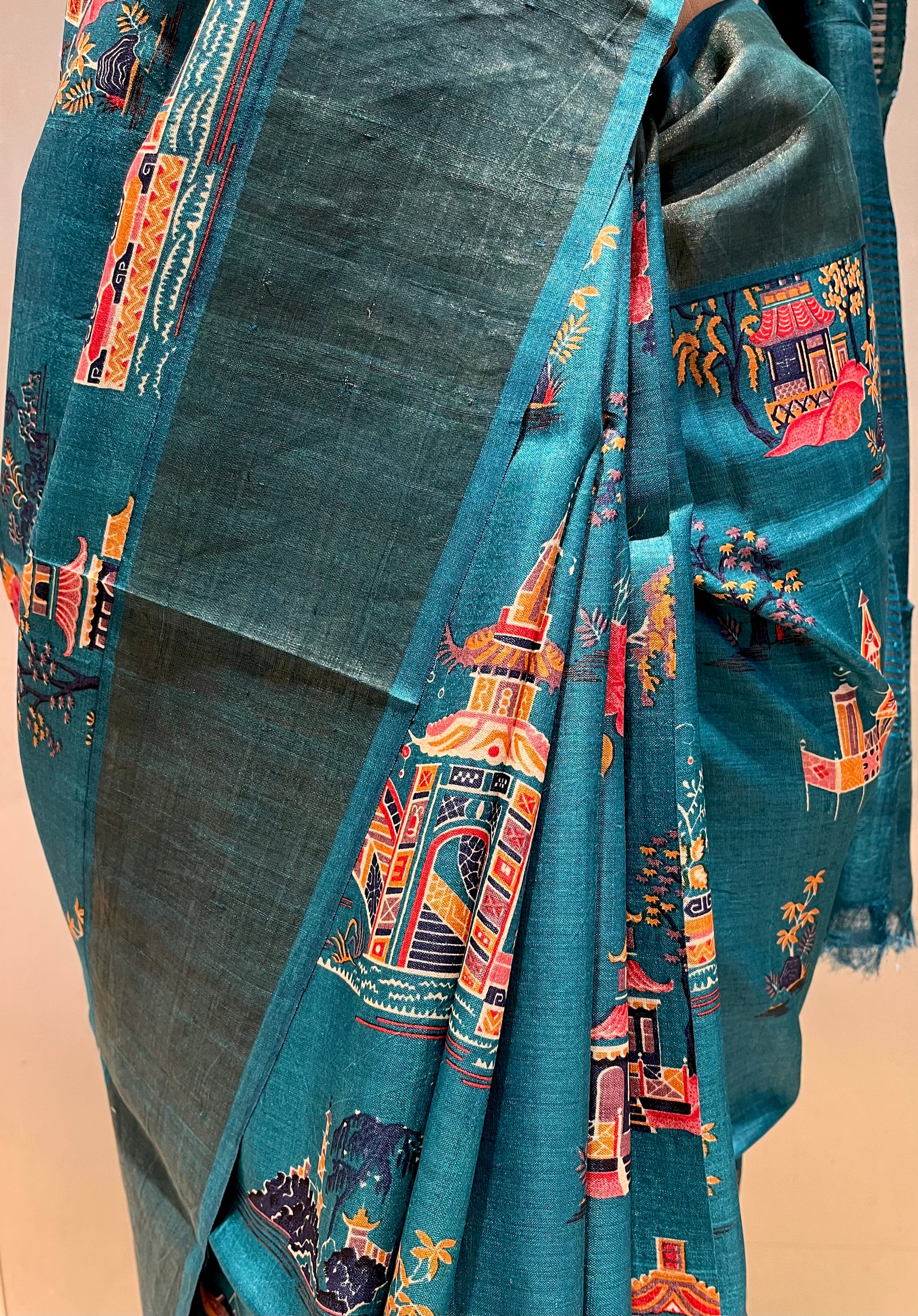 SEA BLUE COLOUR PURE TUSSAR SILK PRINTED SAREE WITH ZARI BORDER