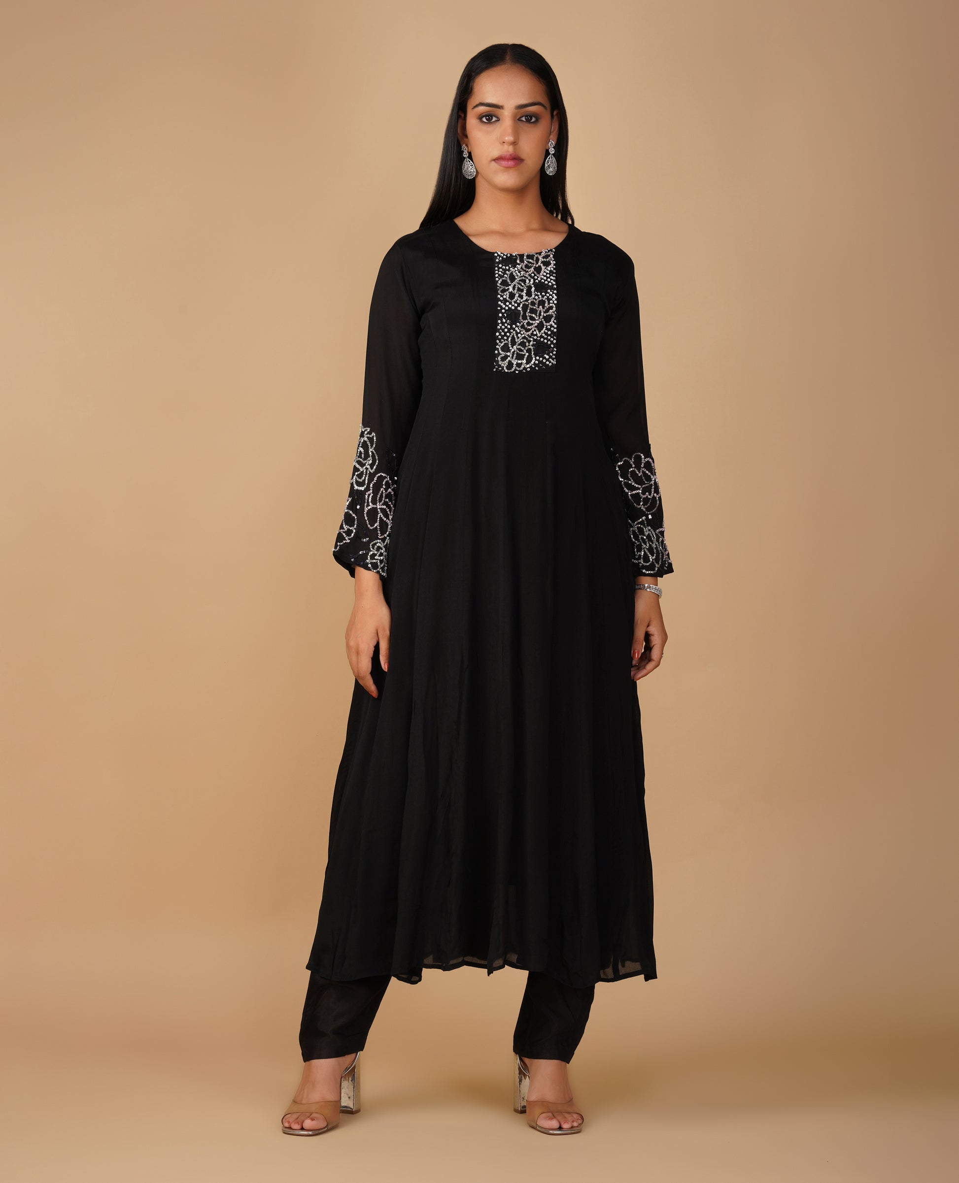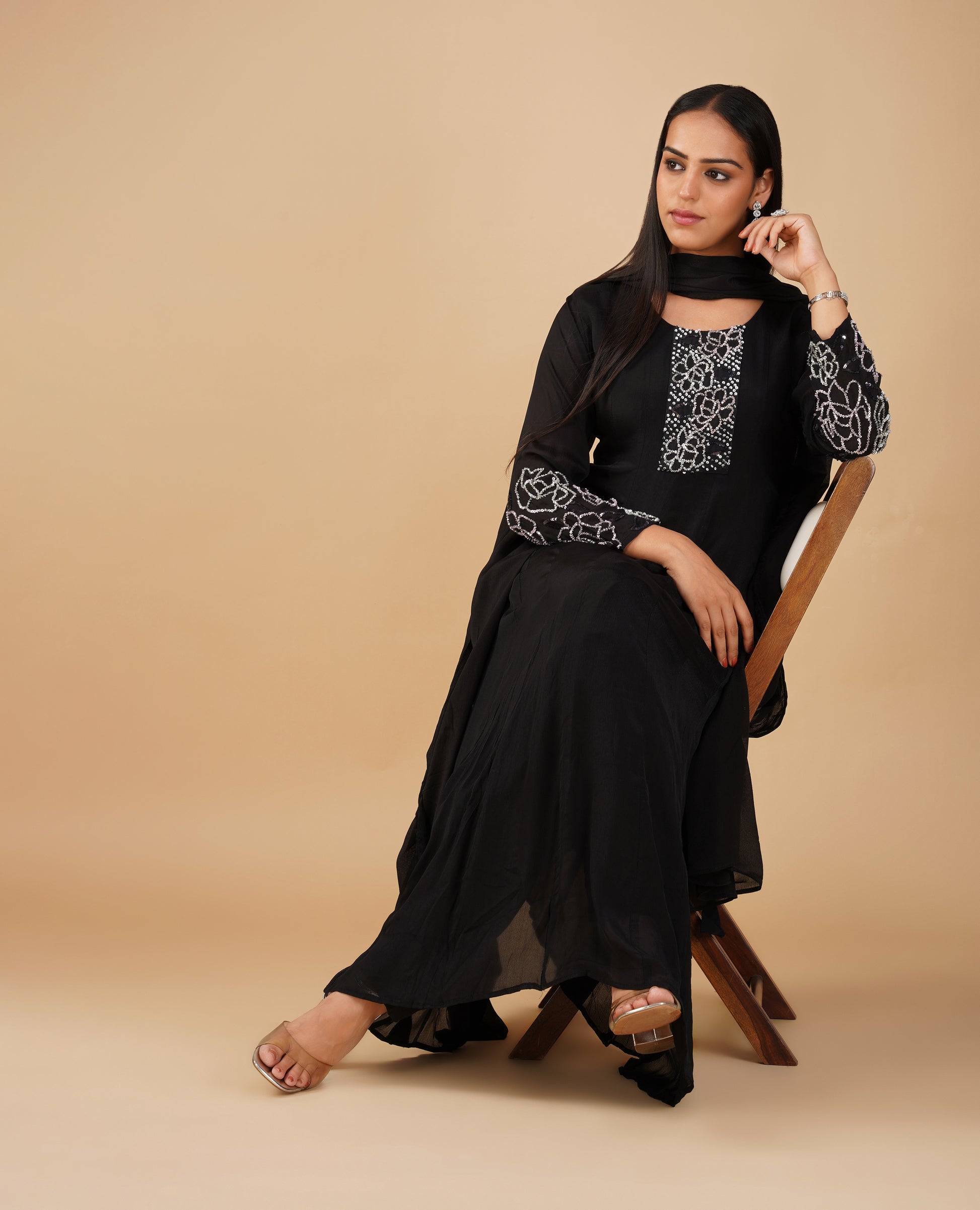 Step into timeless elegance with this stunning black Chinon Anarkali suit, exquisitely embellished with delicate sequin embroidery. Crafted from lightweight, flowy Chinon fabric, the Anarkali features a graceful flare that flatters every silhouette.